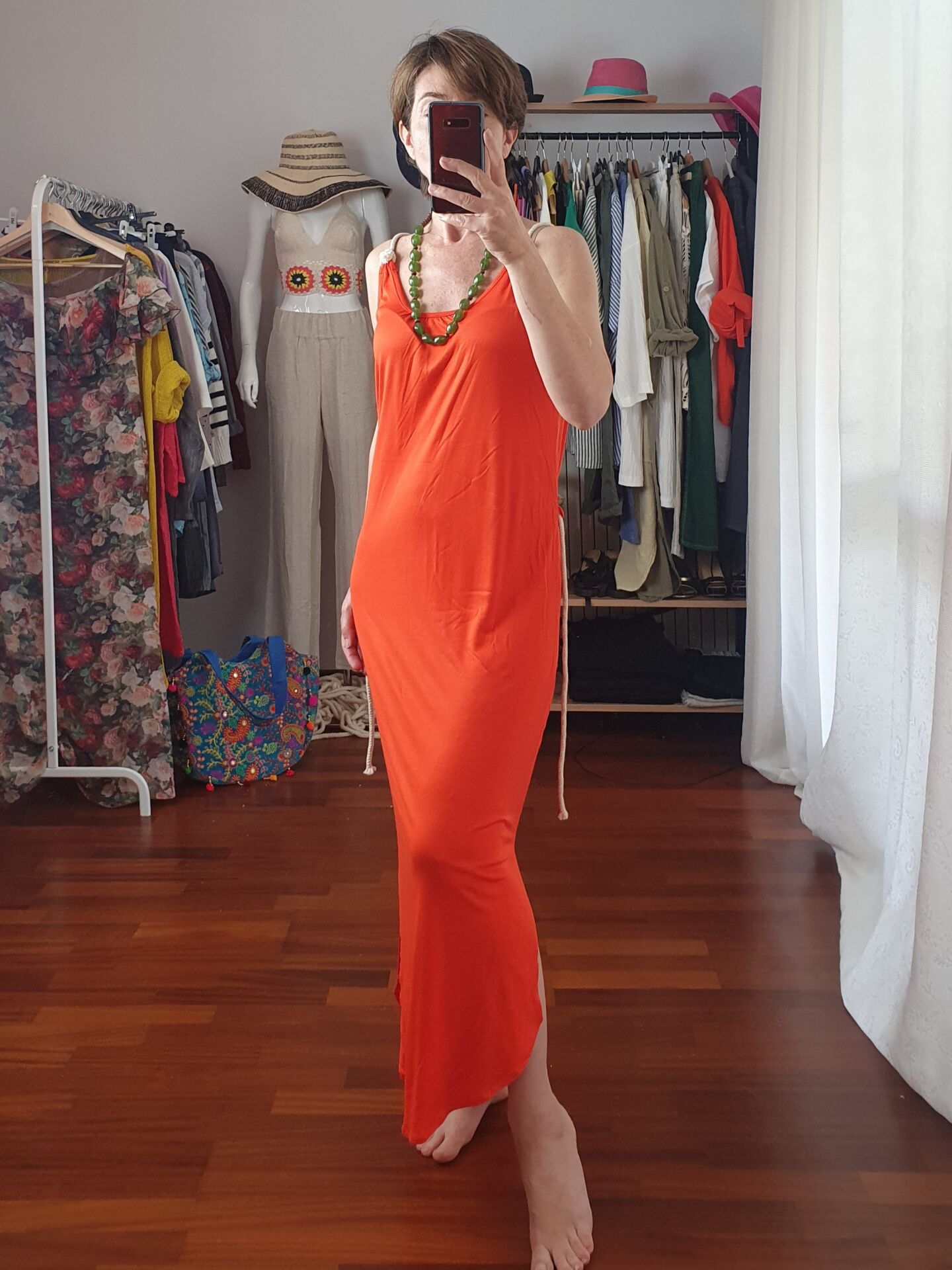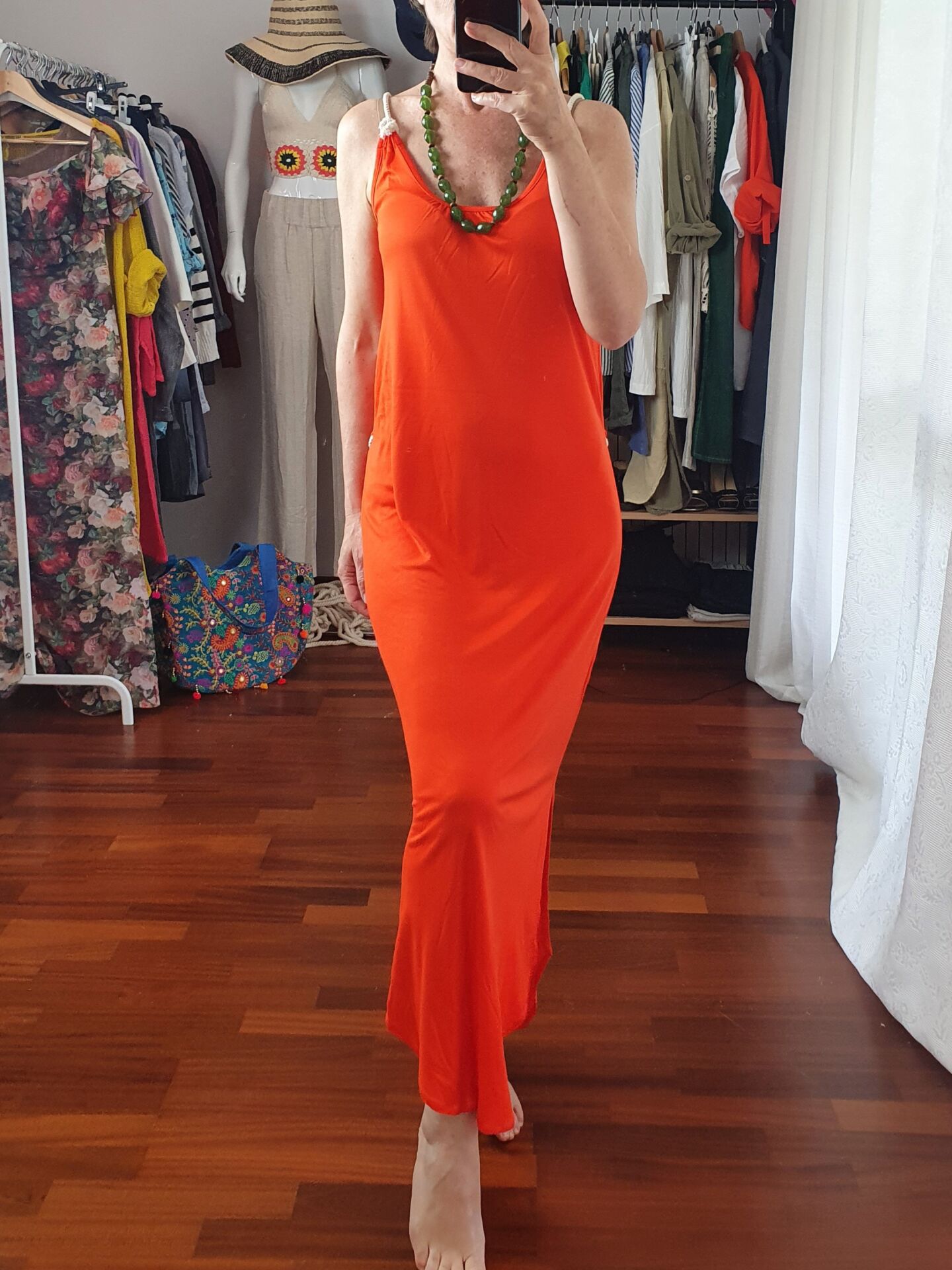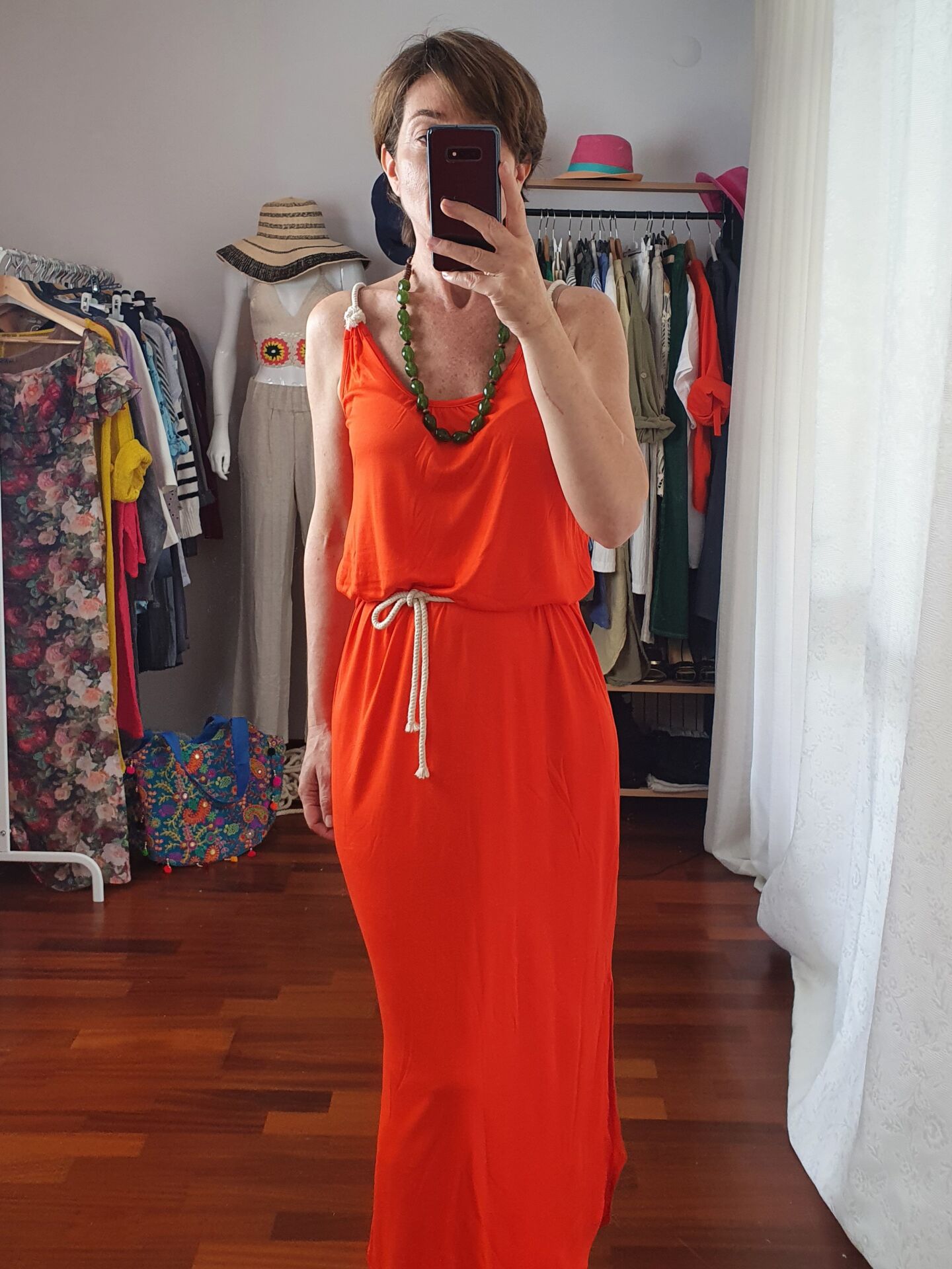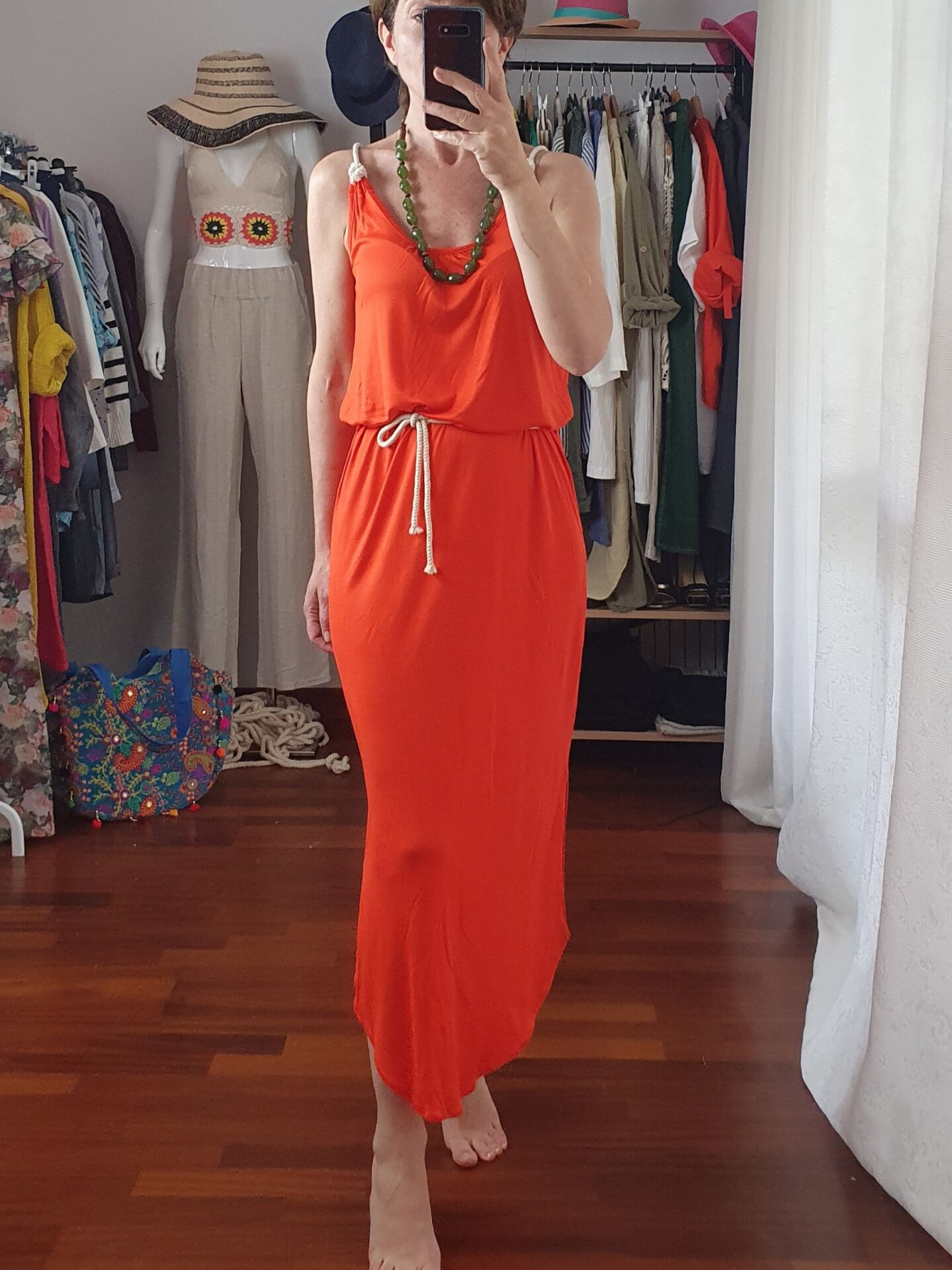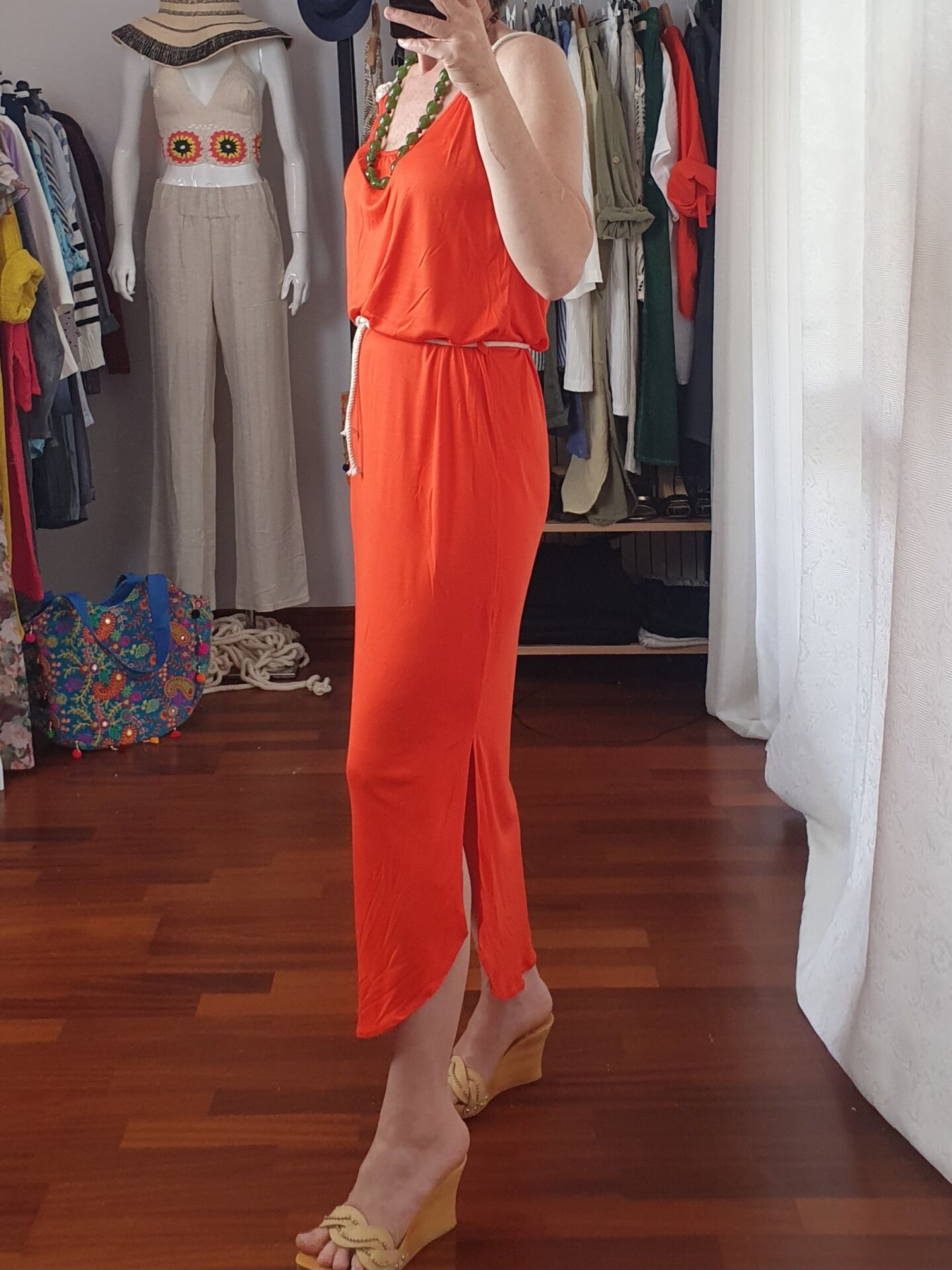 Halat askı ve kemer detaylı uzun viskon elbise.