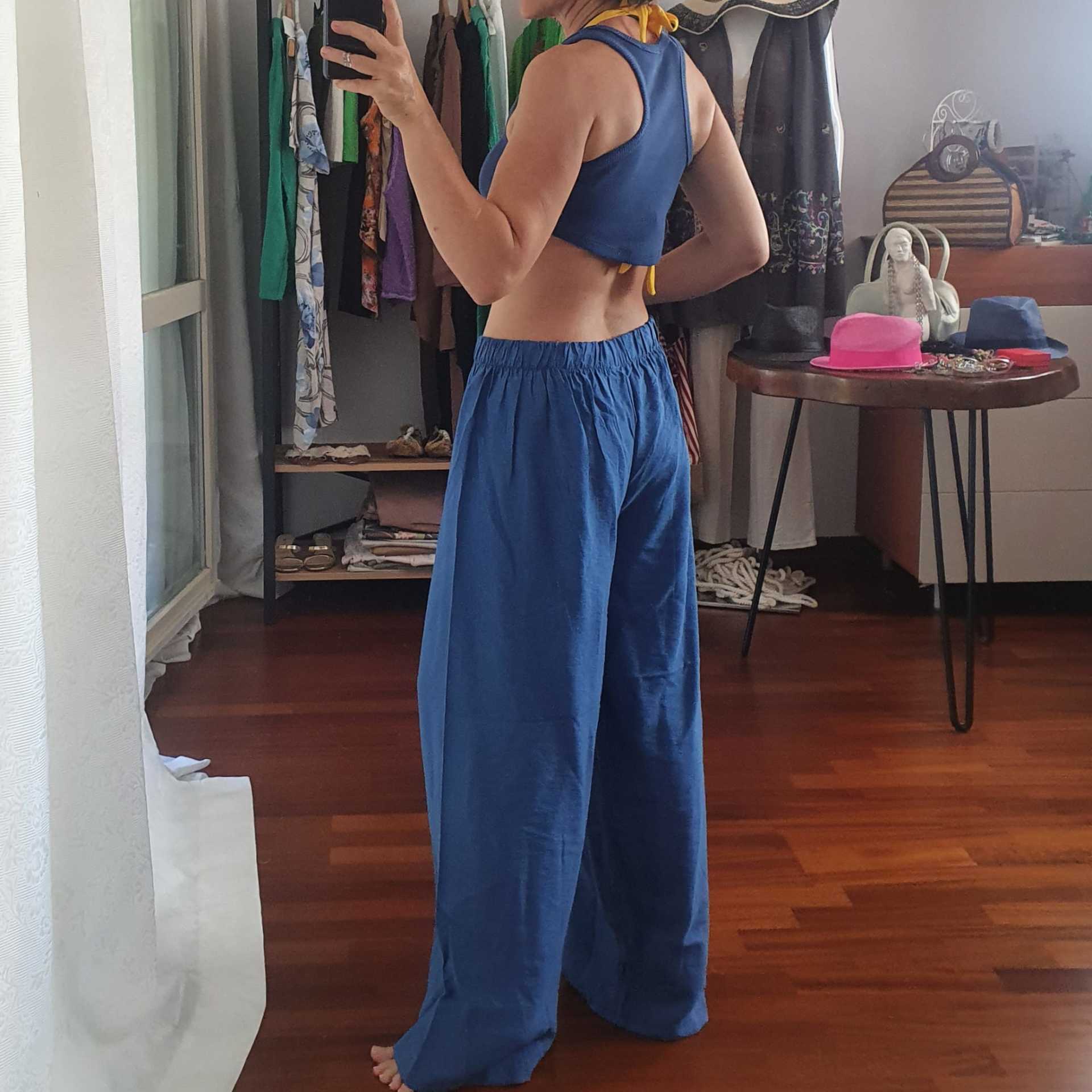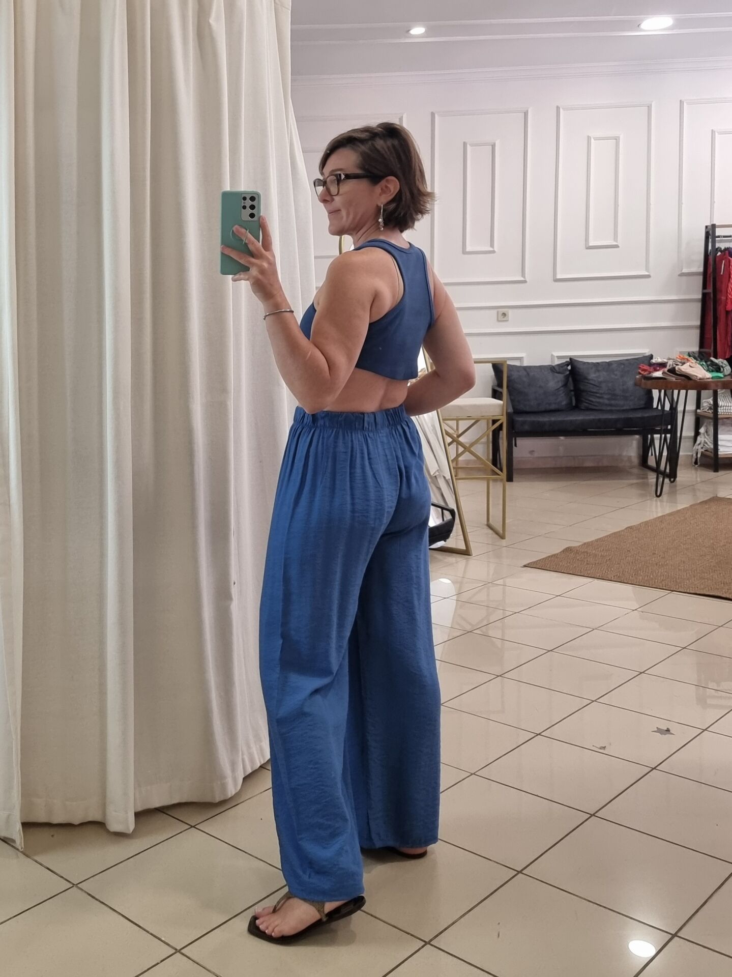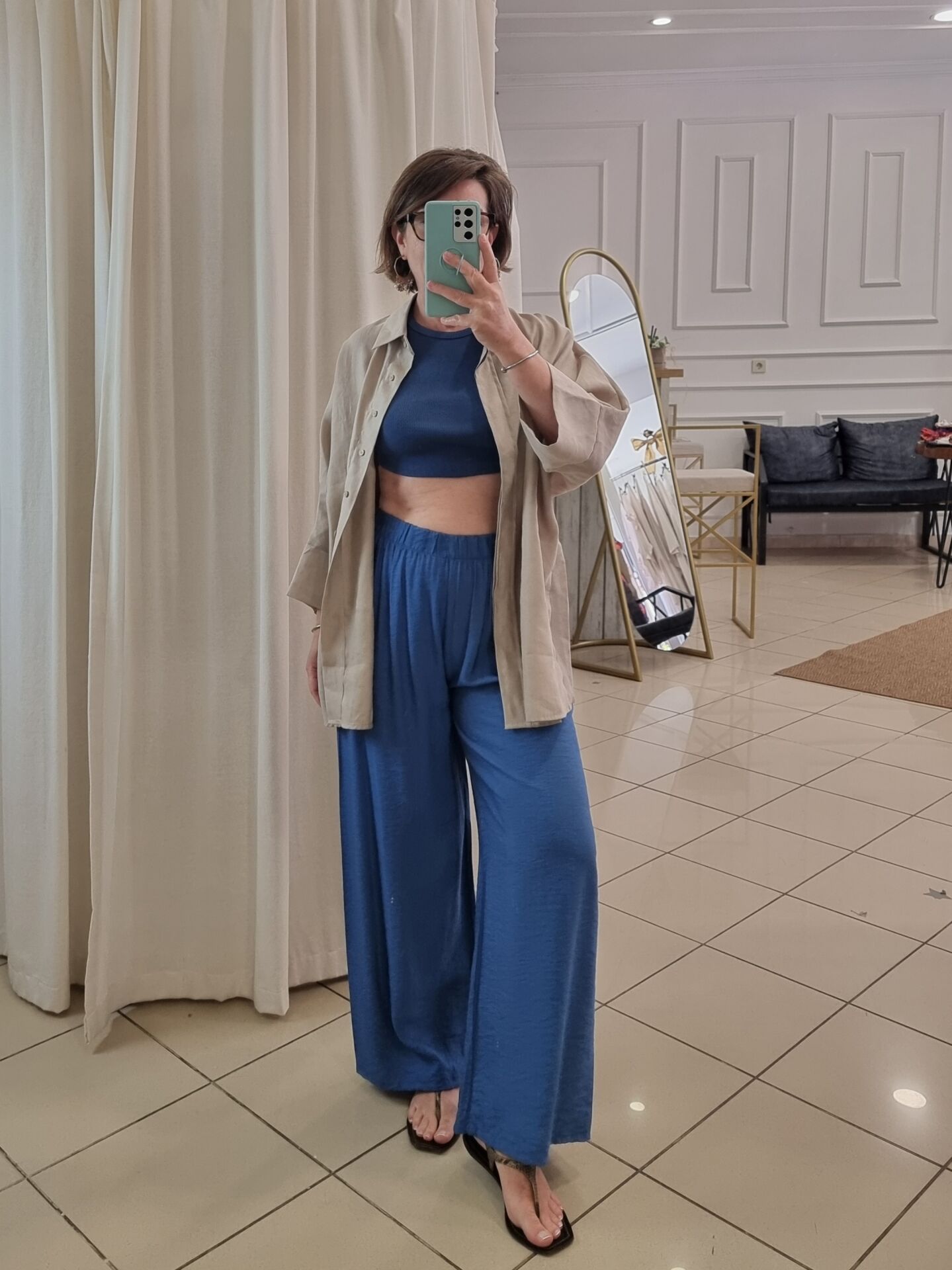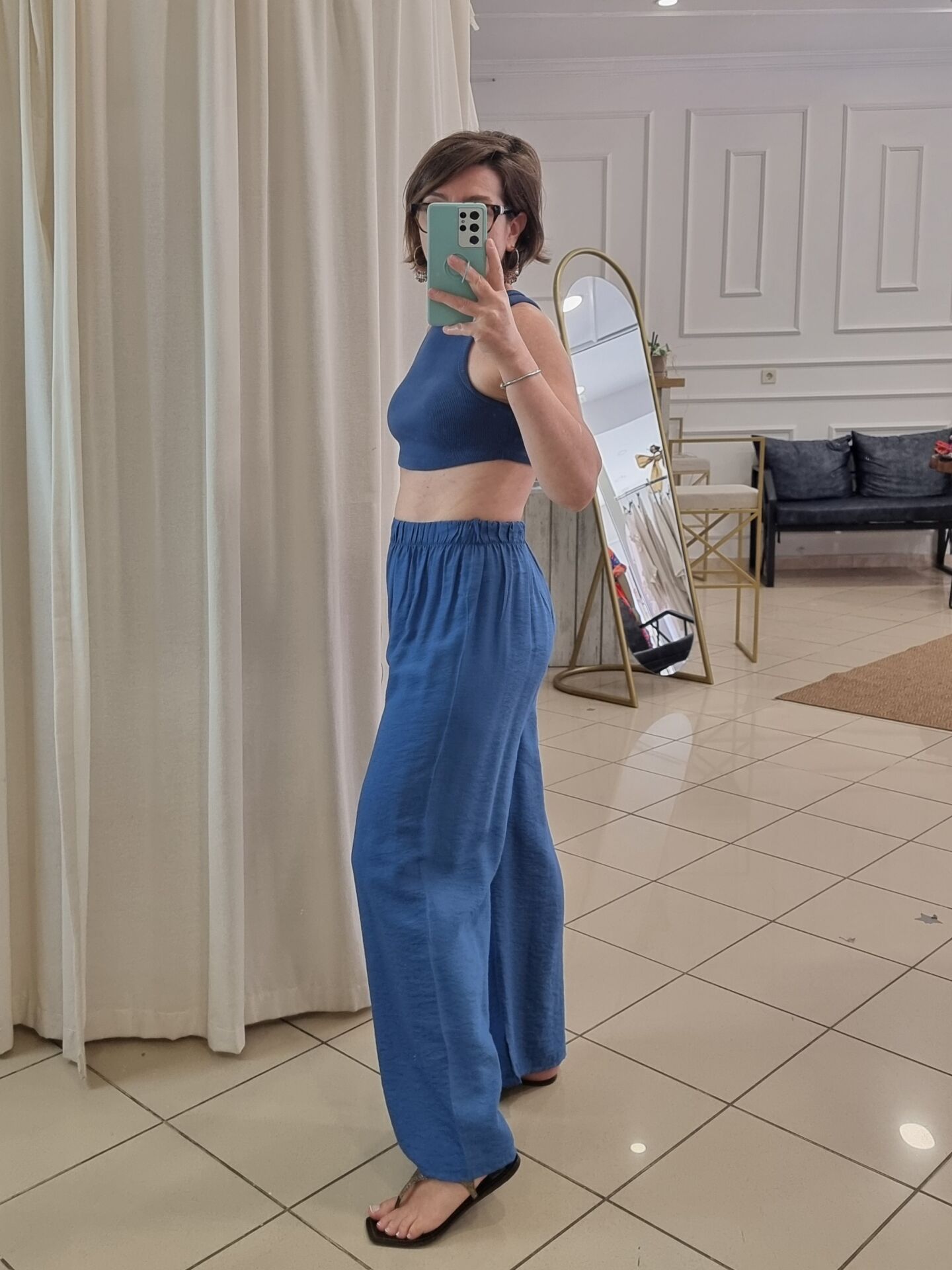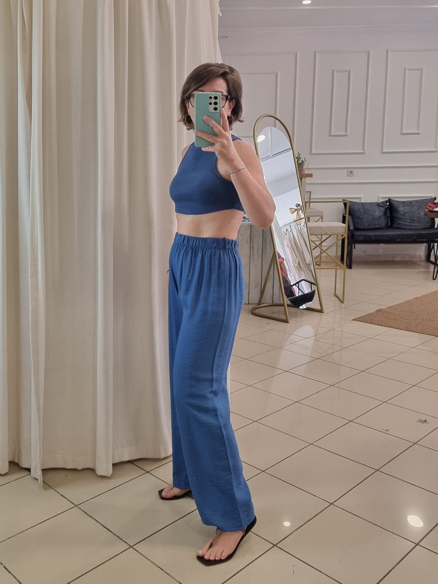 Zarif halter yaka kesimi ve fitilli kaşkorse crop, fitilli kumaşıyla dikkat çeken bu mavi crop bluz, vücudu nazikçe sararak modern ve dengeli bir duruş sunar. Tam kalıp formu sayesinde rahat bir kullanım sağlar ve özellikle yüksek bel pantolonlar ya da eteklerle mükemmel uyum yakalar. Hem günlük kombinlerde hem de katmanlı şehir stilinde kullanılabilecek bu kaşkorse crop, yaz gardırobunun dinamik parçalarından biri olmaya adaydır.
