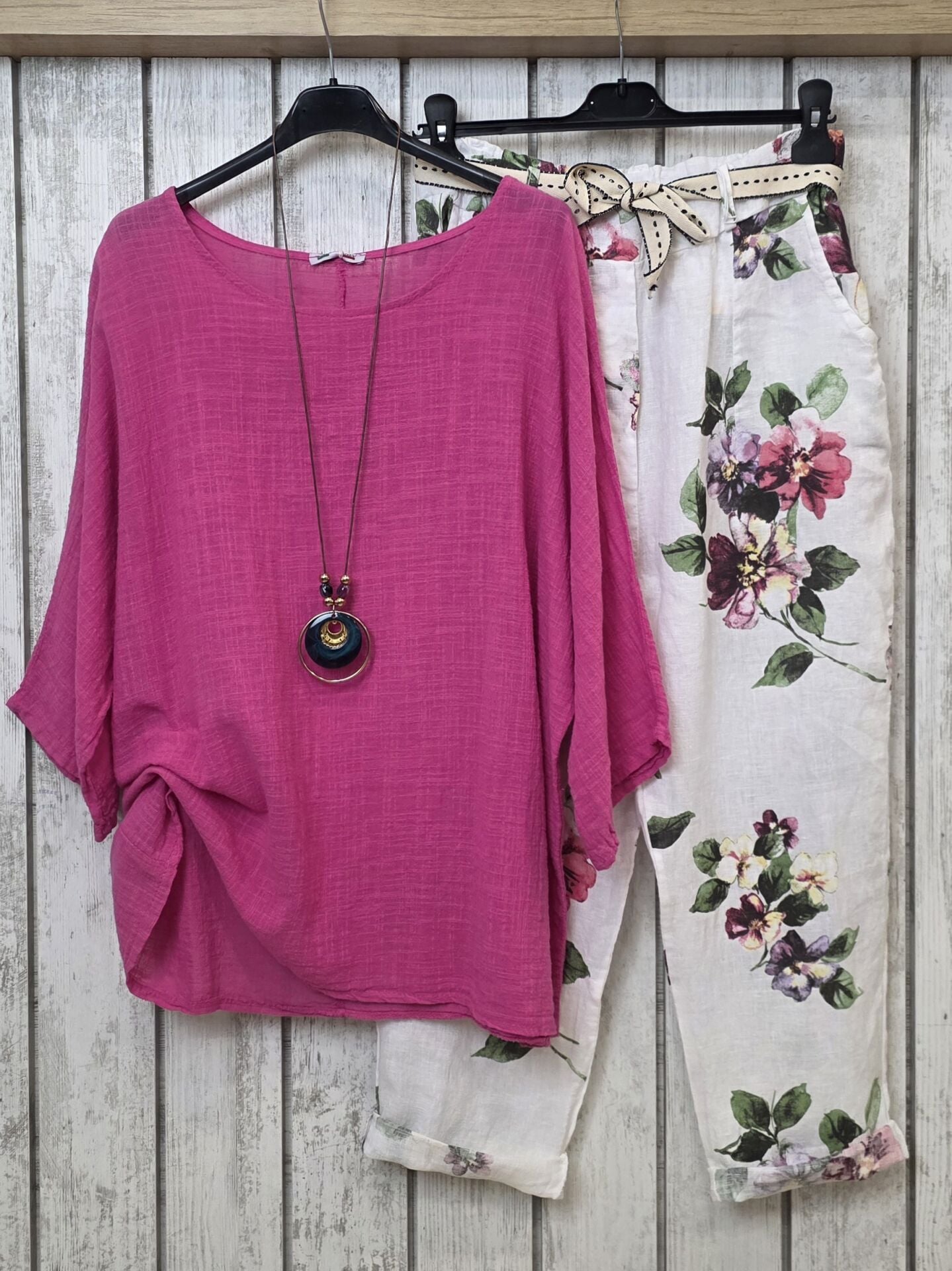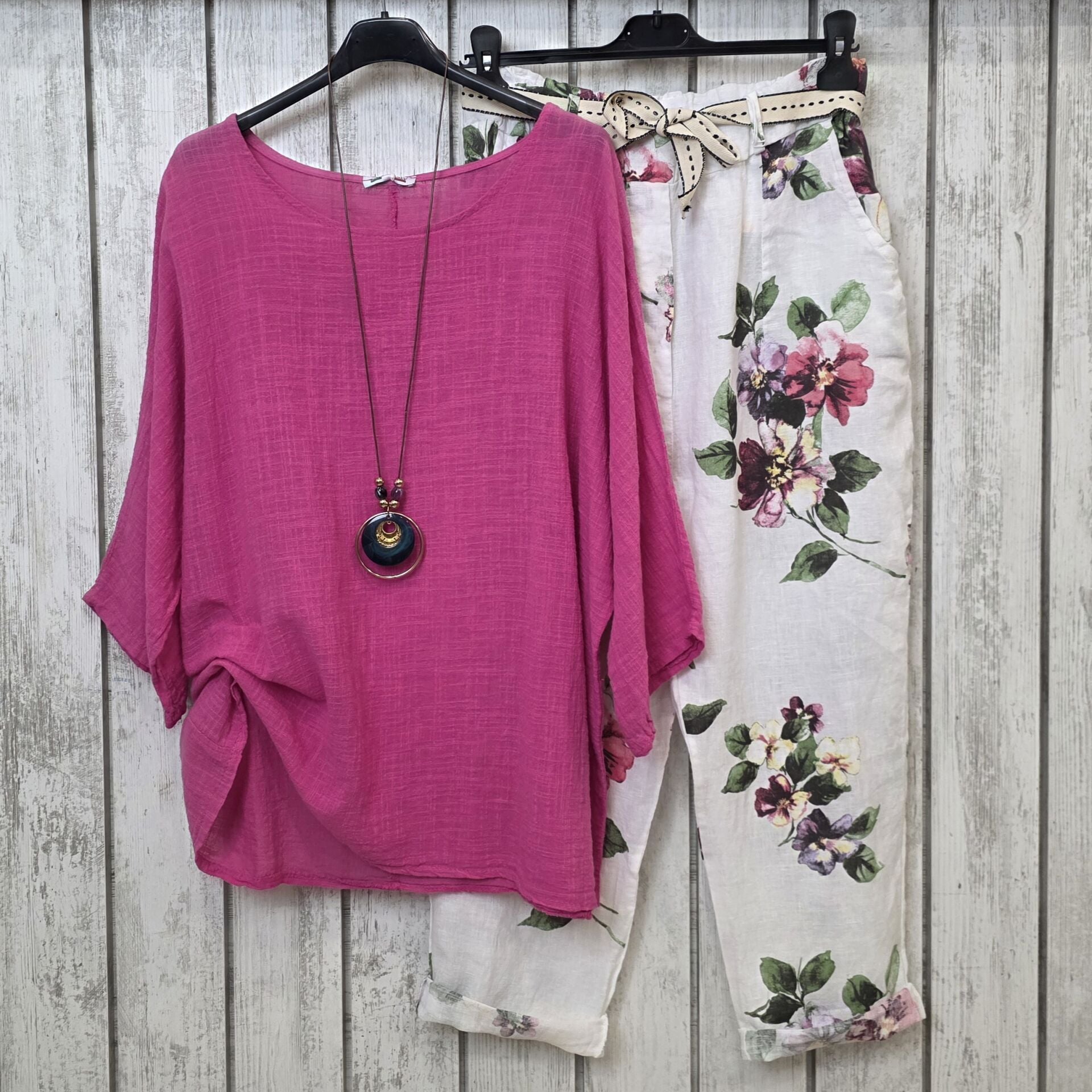 Çiçek desenli ham keten pantolon.