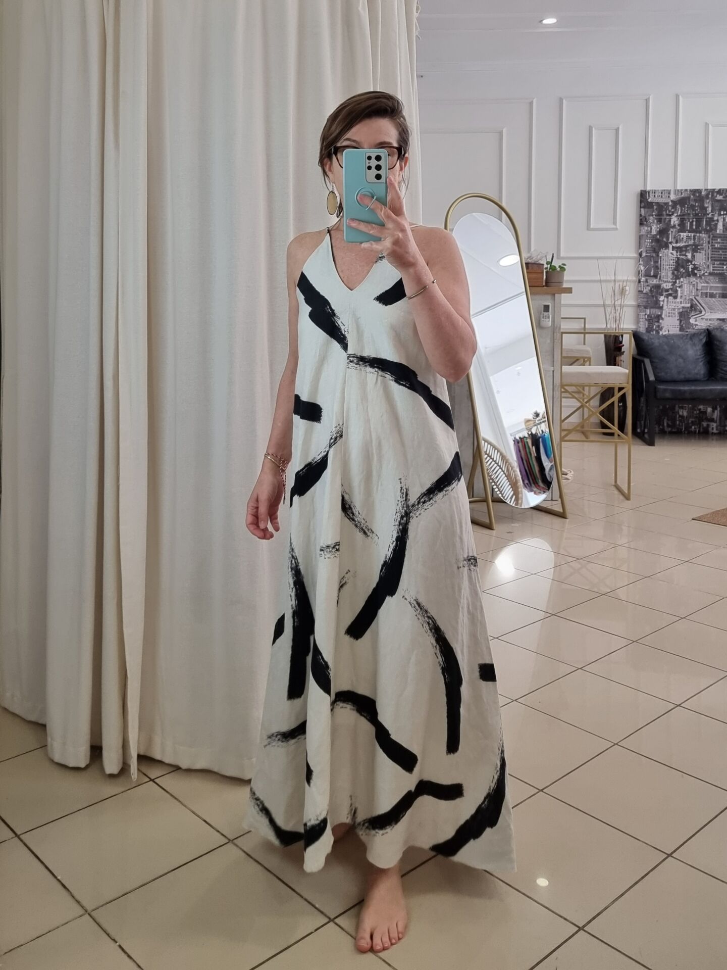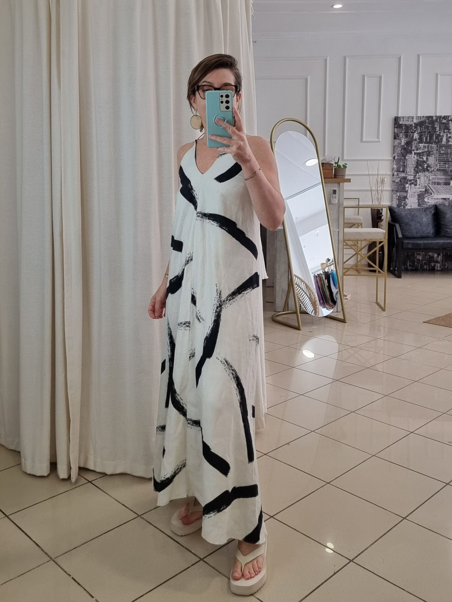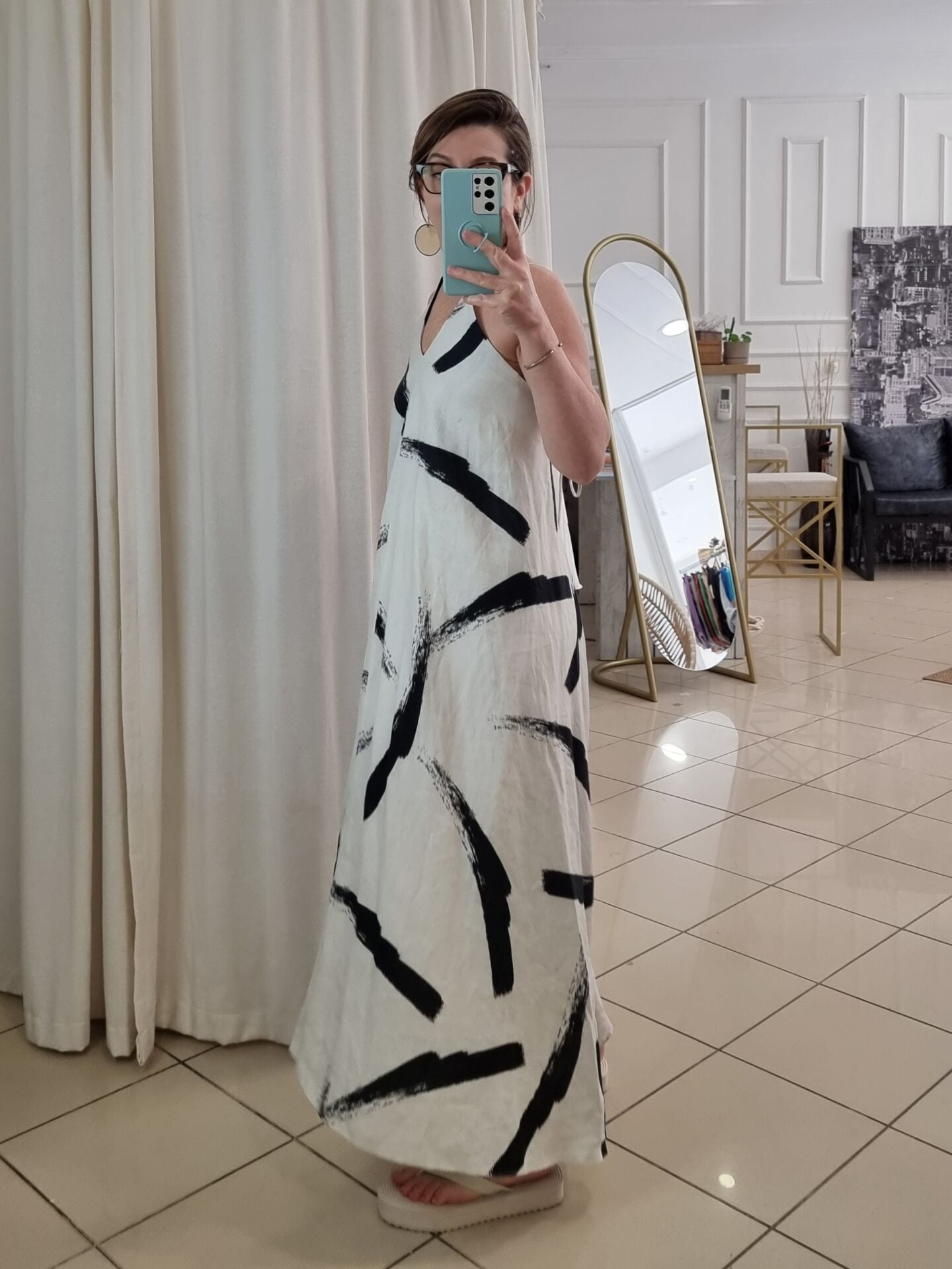 %100 Keten İp Askılı Uzun Elbise Kemik