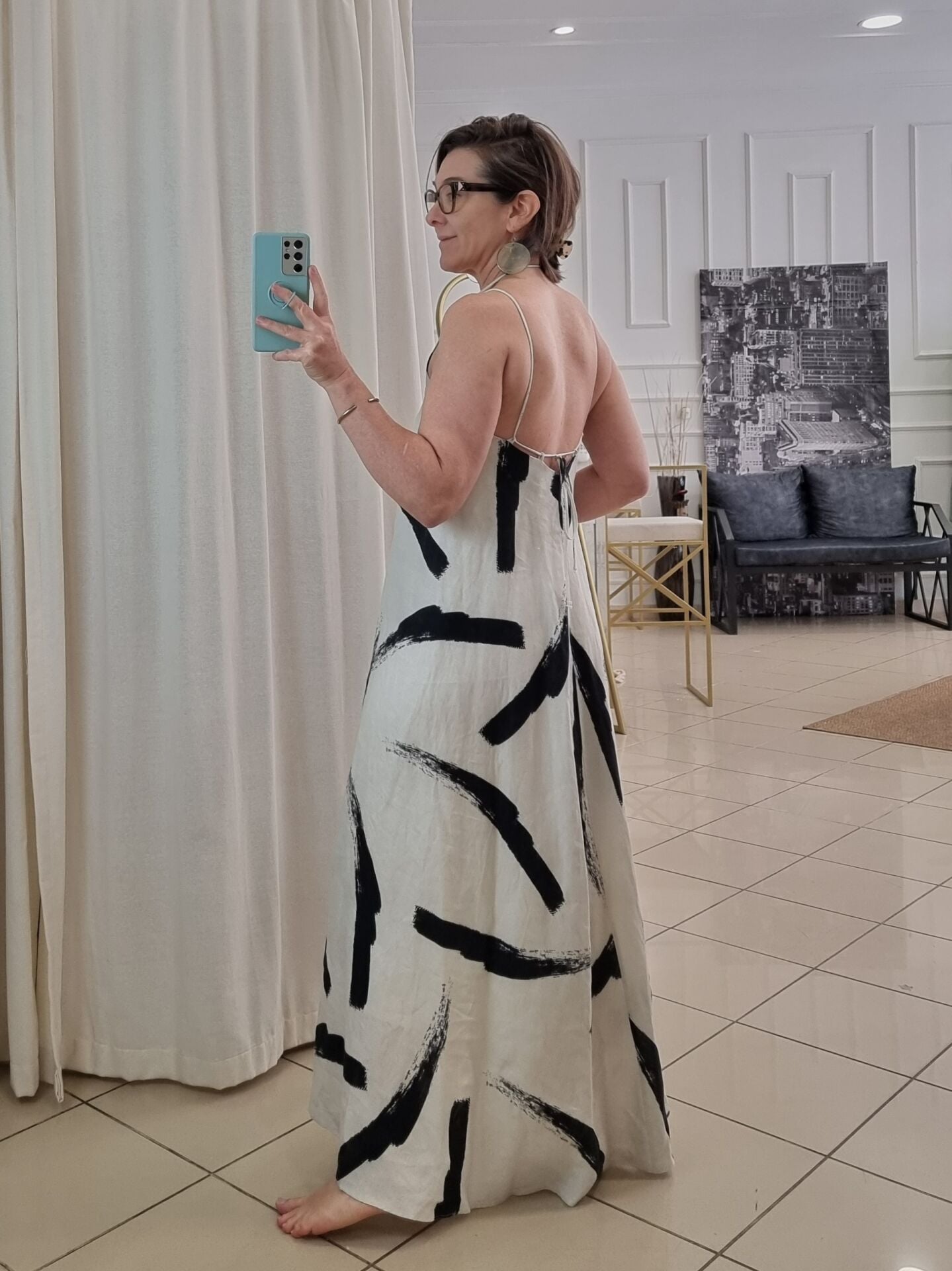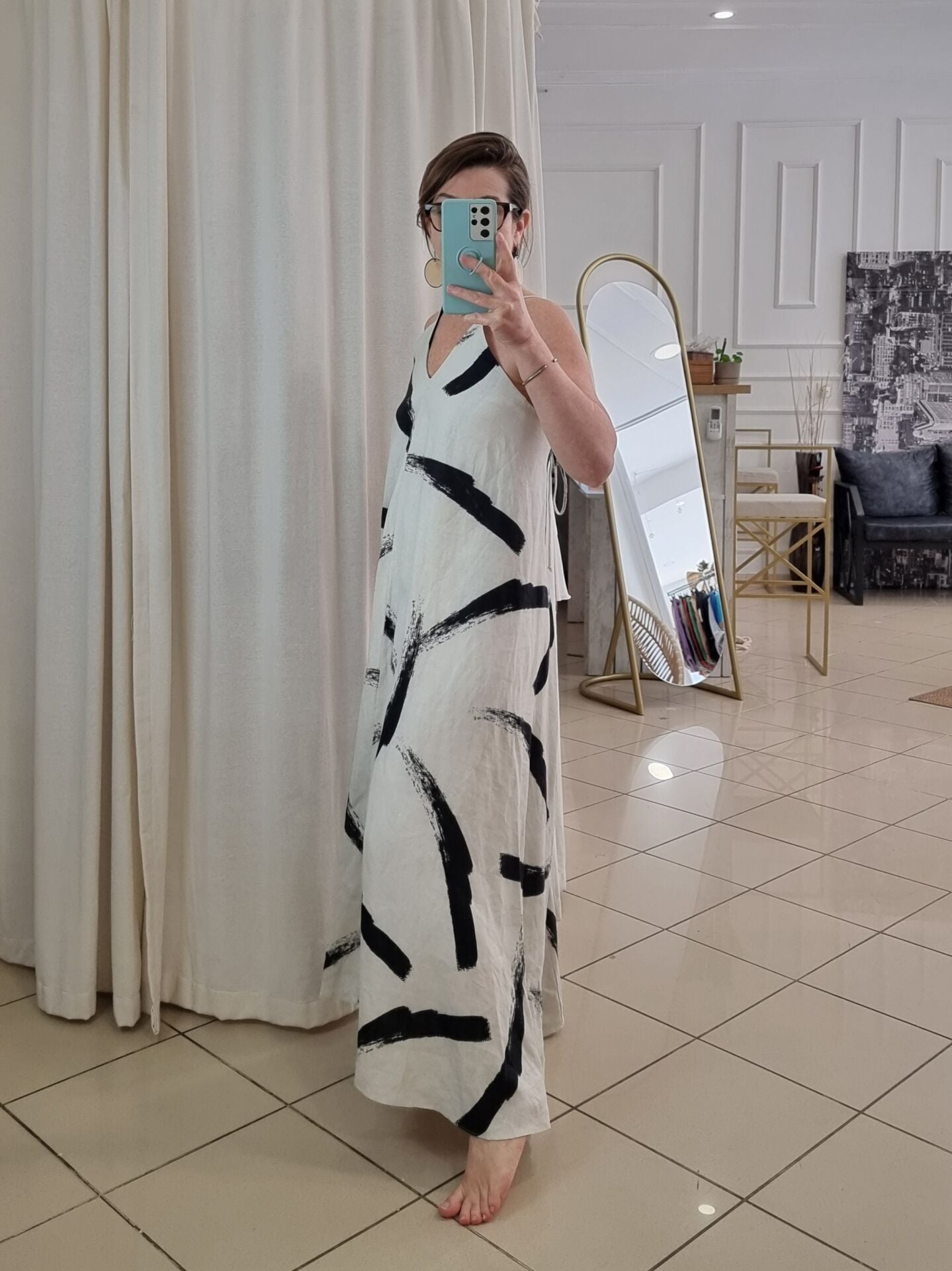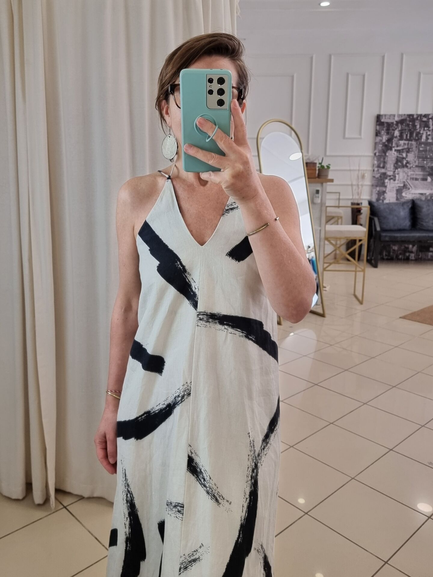 %100 Keten İp Askılı Uzun Elbise Kemik