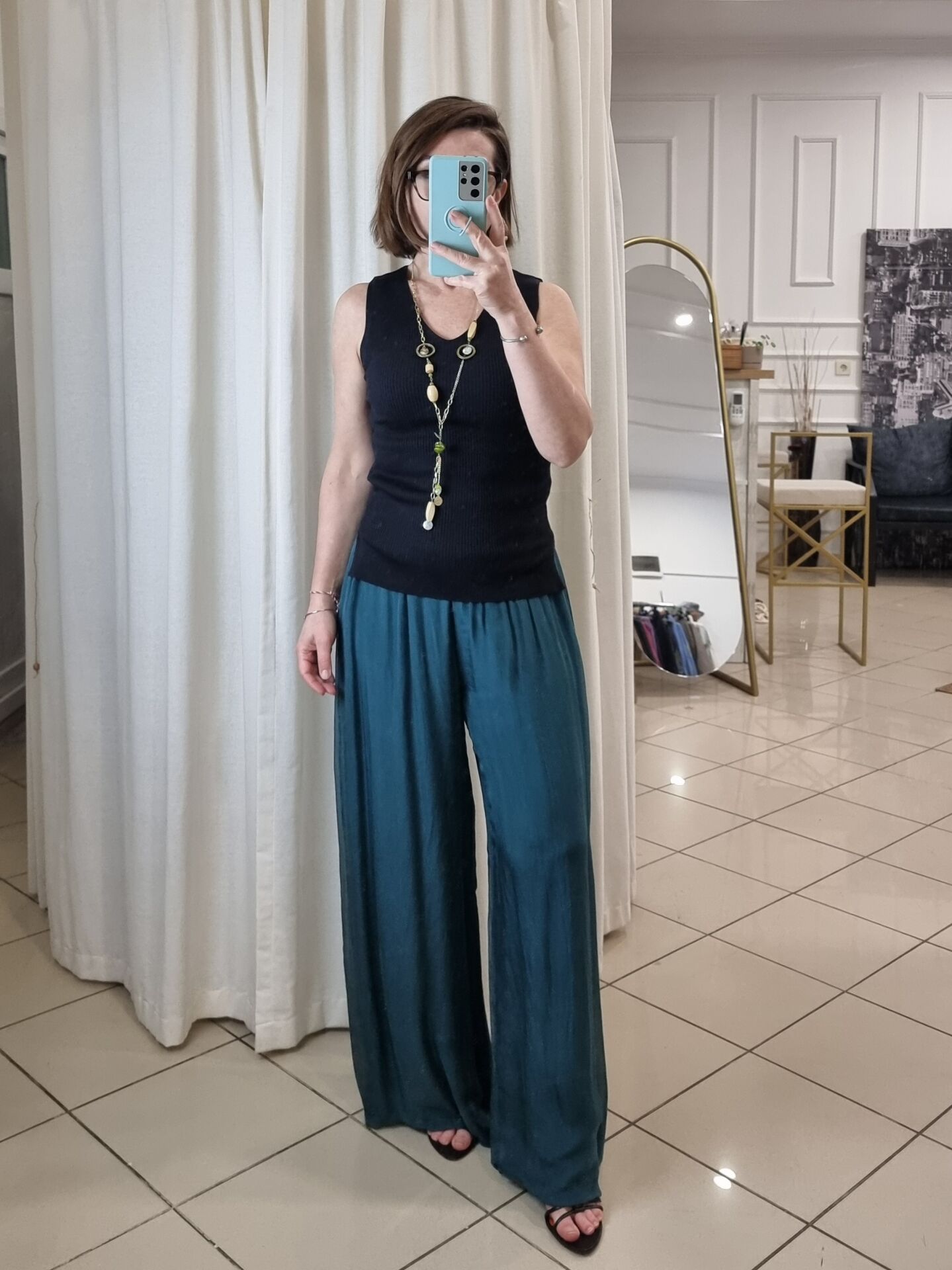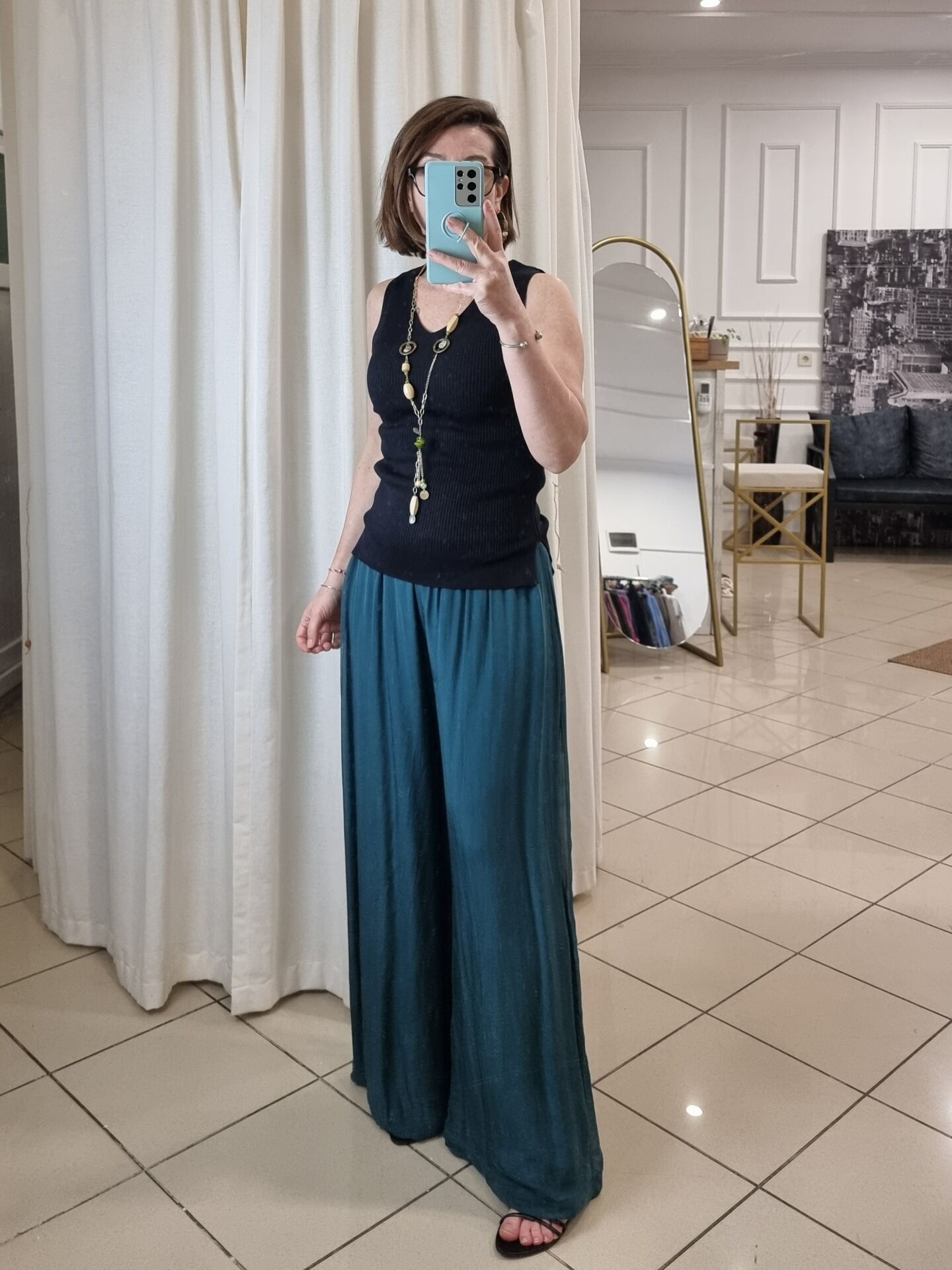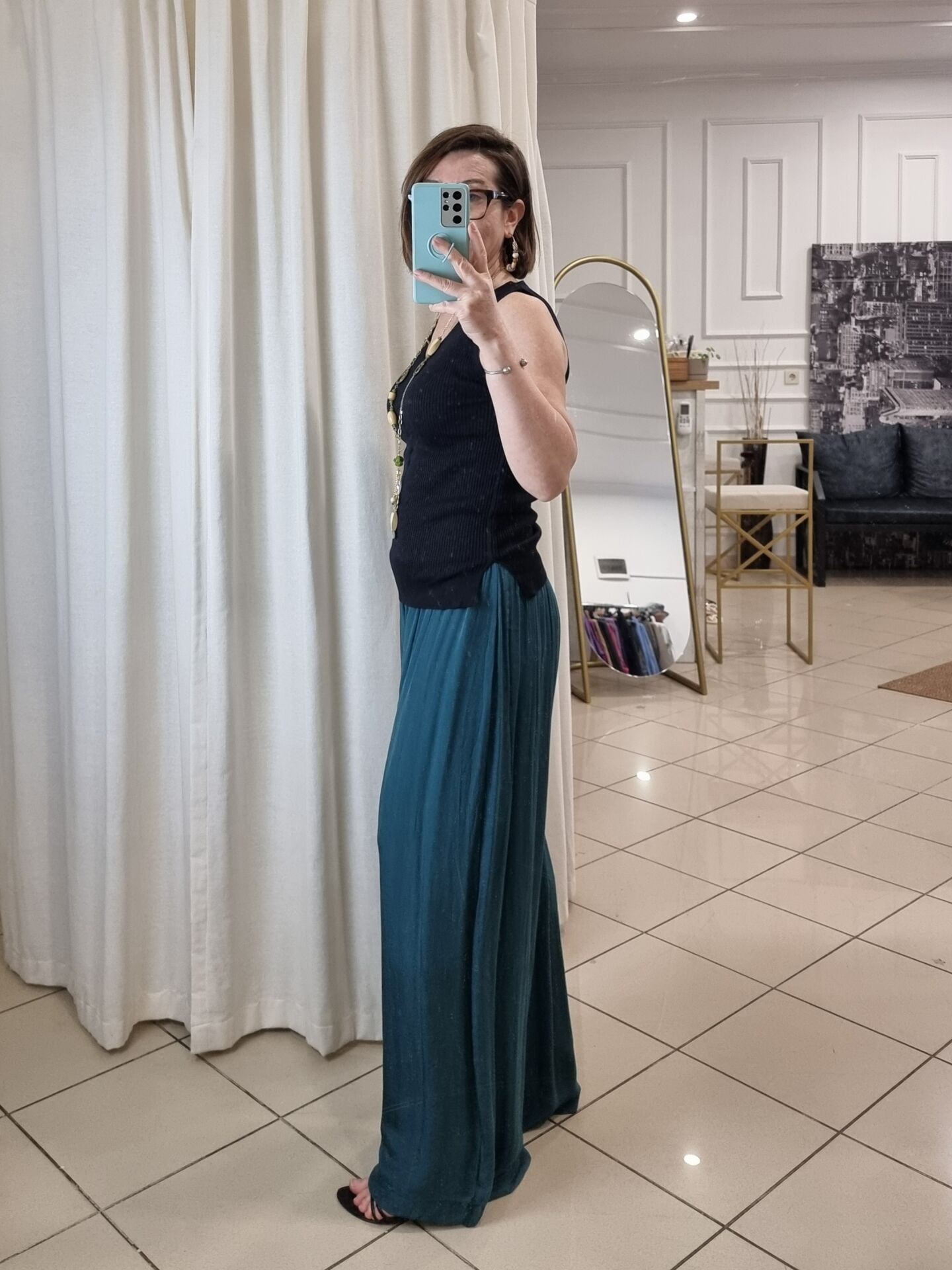 Petrol renginin sofistike tonu, ipek ve şifon kumaşın dökümlü duruşuyla birleşerek bu pantolonu zarif bir parça hâline getiriyor. Astarlı yapısı sayesinde iç göstermez, hafif ve nefes alabilen dokusuyla yaz ve mevsim geçişlerinde ideal bir kullanım sunar. Beli lastikli tasarımı 48/50 bedene kadar rahatlıkla uyum sağlar. Minimal takılar, düz sandaletler ya da ince topuklu ayakkabılarla kolayca kombinlenebilir.