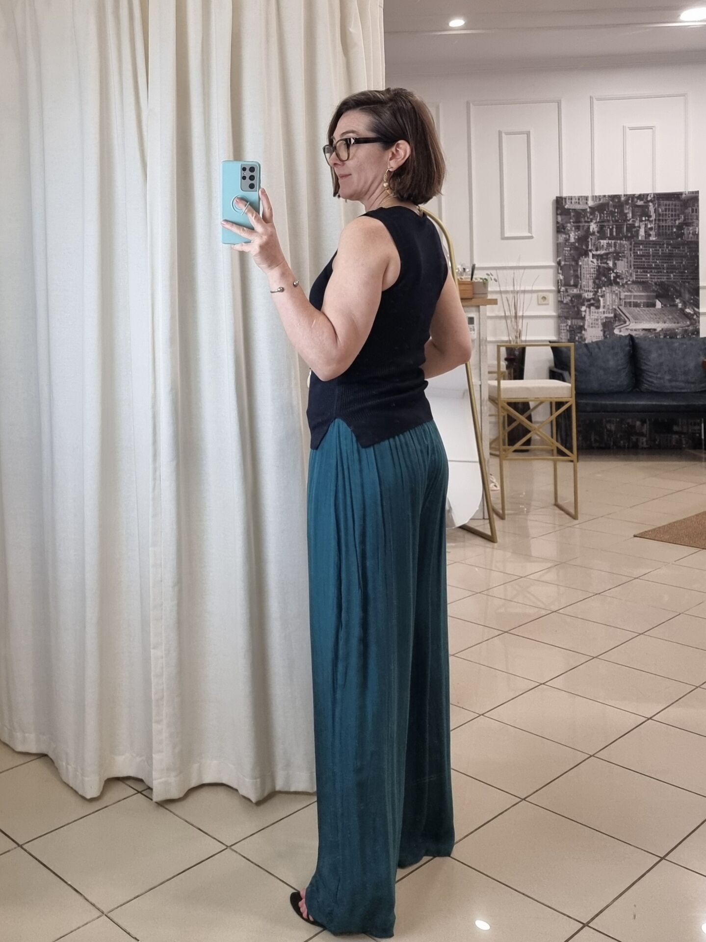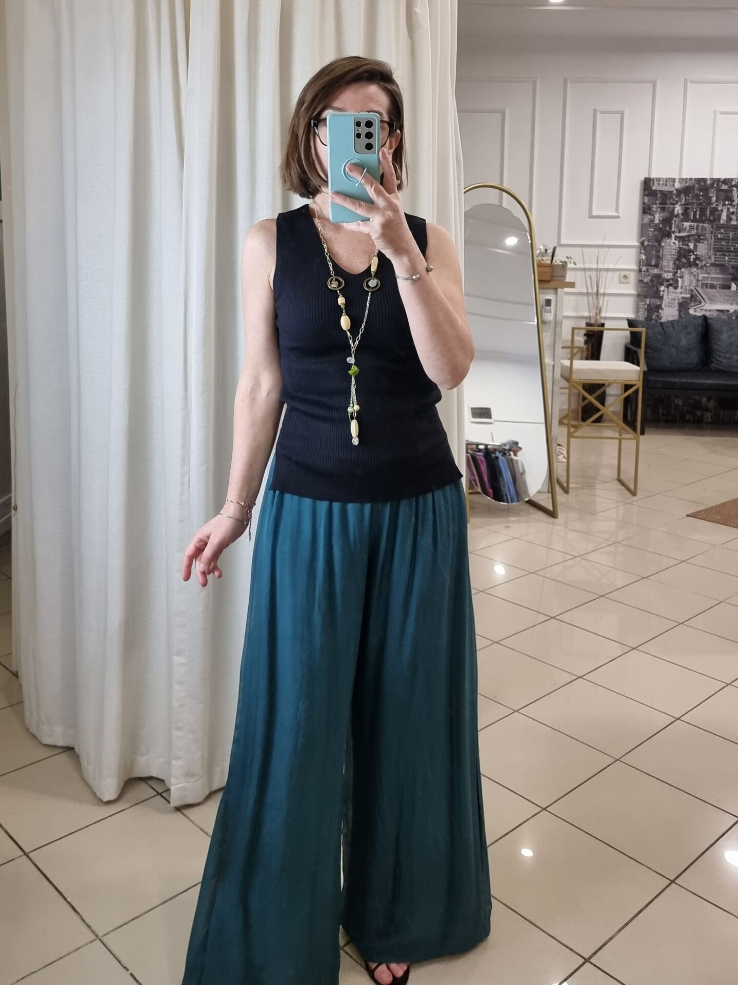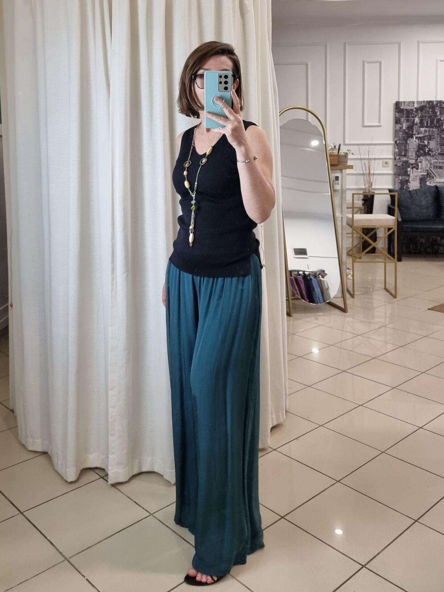 Petrol renginin sofistike tonu, ipek ve şifon kumaşın dökümlü duruşuyla birleşerek bu pantolonu zarif bir parça hâline getiriyor. Astarlı yapısı sayesinde iç göstermez, hafif ve nefes alabilen dokusuyla yaz ve mevsim geçişlerinde ideal bir kullanım sunar. Beli lastikli tasarımı 48/50 bedene kadar rahatlıkla uyum sağlar. Minimal takılar, düz sandaletler ya da ince topuklu ayakkabılarla kolayca kombinlenebilir.