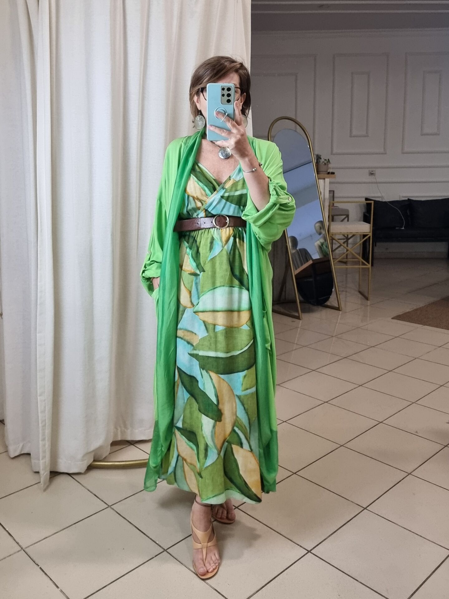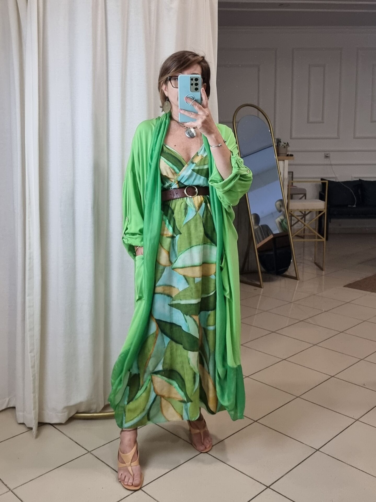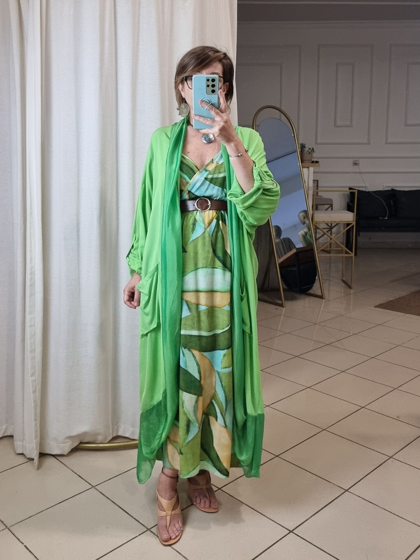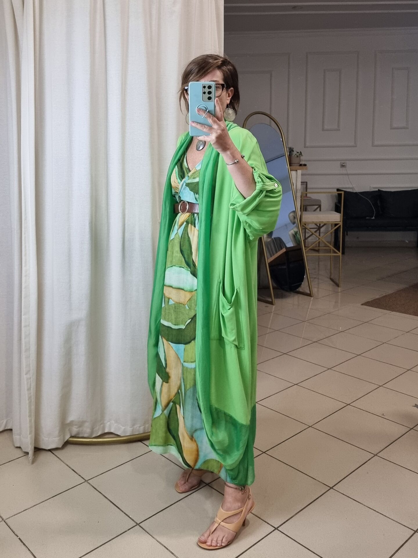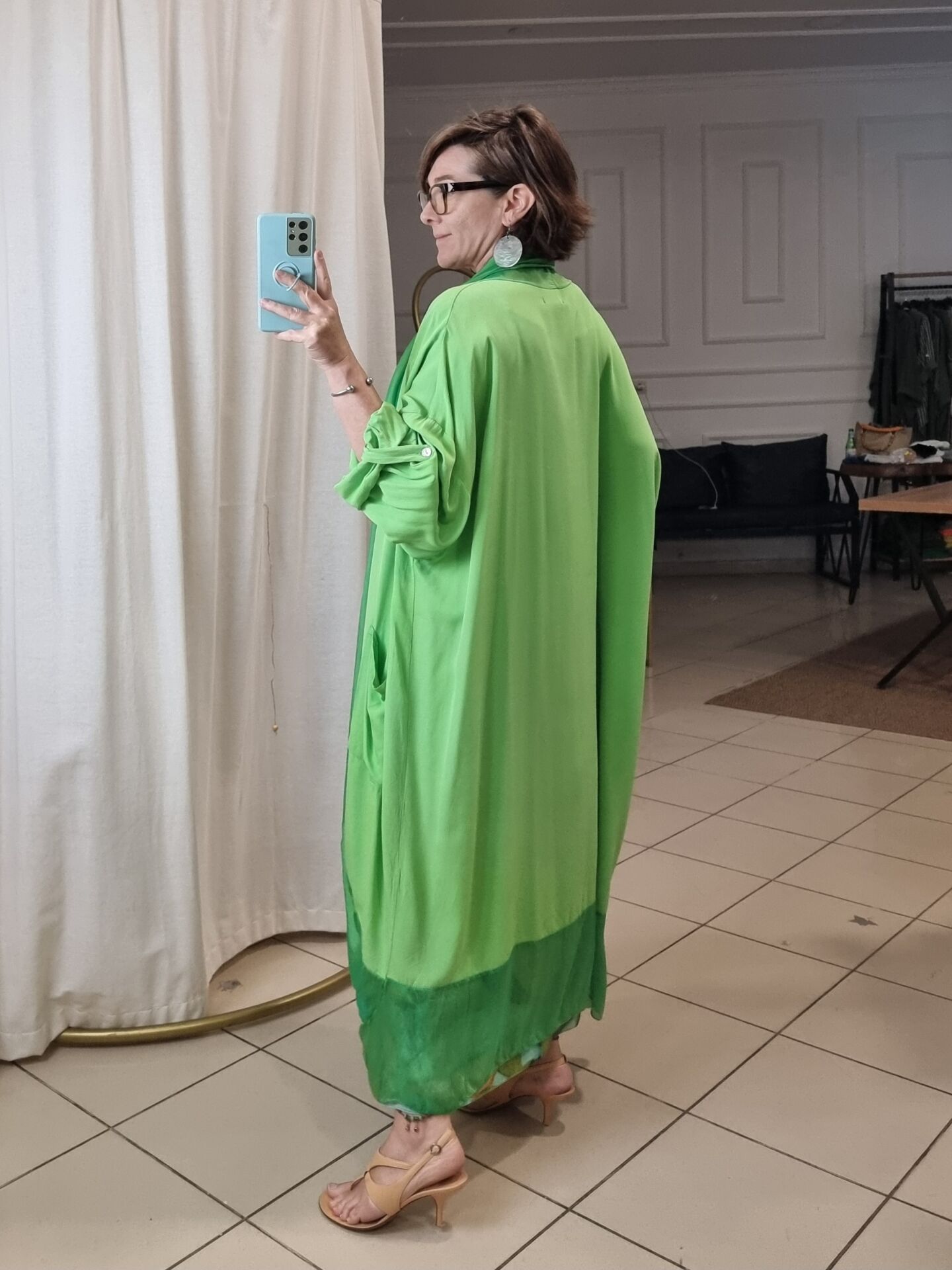 İpeğin zarif dokusuyla tasarlanan bu yeşil ipek kimono, dökümlü formu ve hafif yapısıyla şehir şıklığını tamamlar. Özellikle yaz ve mevsim geçişlerinde, sade kombinlerin üzerine alındığında güçlü bir stil etkisi yaratır. Akışkan kesimiyle hareketli bir siluet sunar; etnikten moderne birçok tarzla uyum sağlar. 46/48 bedene kadar uyum sağlayan rahat kalıbıyla konforu da elden bırakmaz.