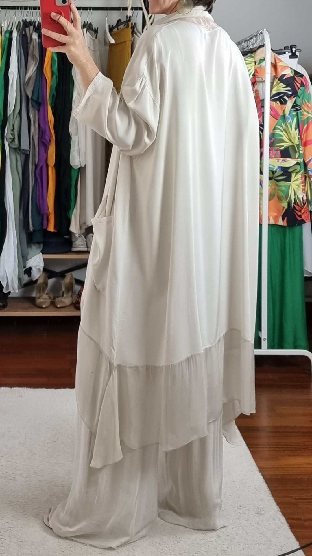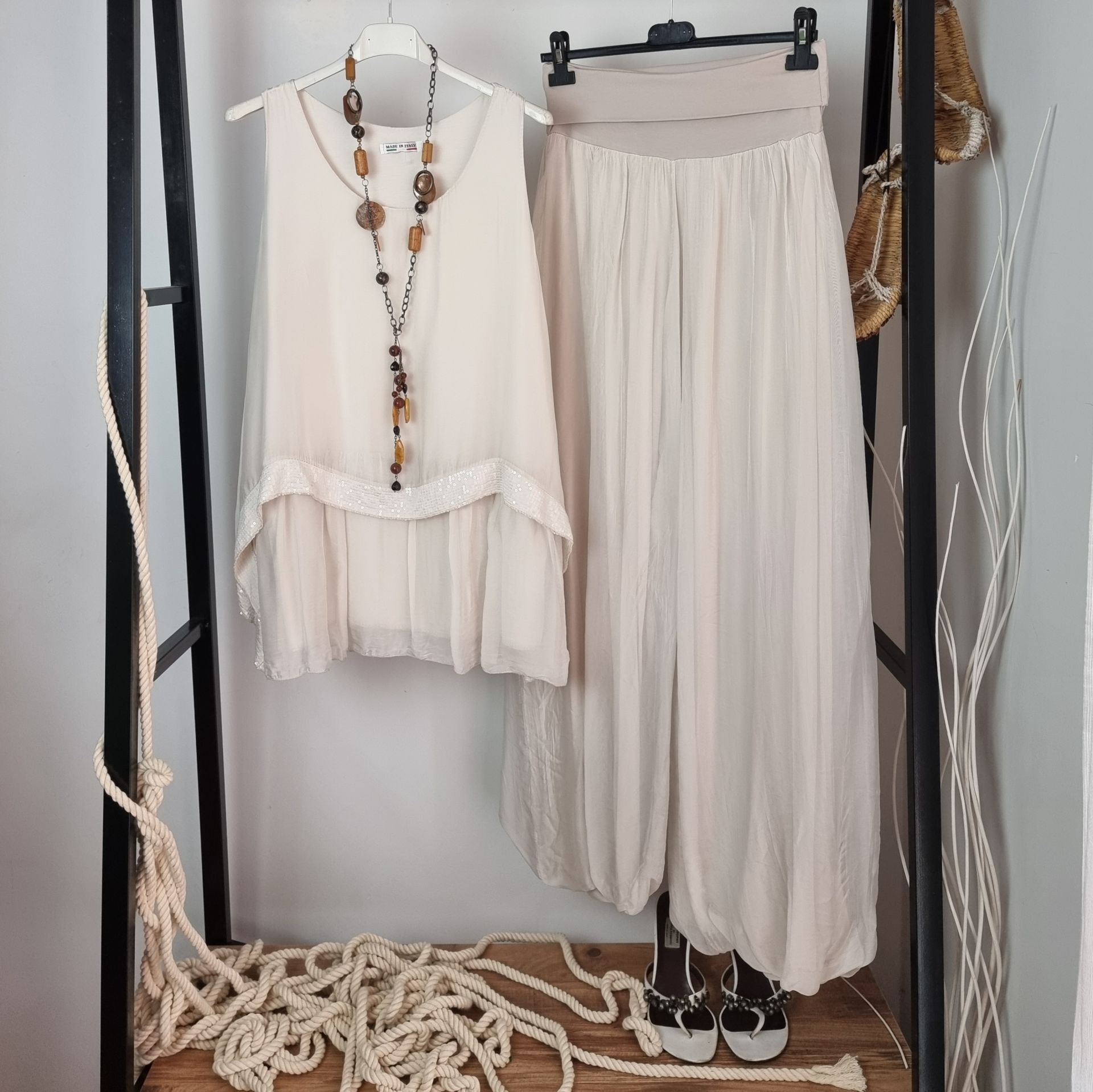 Bu İpekli İtalyan pantolon bej rengi ve akışkan ipekli yapısıyla bu pantolon, hem klasik hem modern kombinlerin tamamlayıcısıdır. Astarlı iç yapısı sayesinde iç göstermez, rahat kesimiyle 46/48 bedene kadar konforlu bir uyum sunar. Gündüzden geceye geçişlerde tek parça şıklık arayanlar için ideal bir tercih olurken, keten, pamuk ya da triko üstlerle kolayca kombinlenebilir. Yazın ferah şıklığını arayan şehirli kadınlara özel tasarlandı.