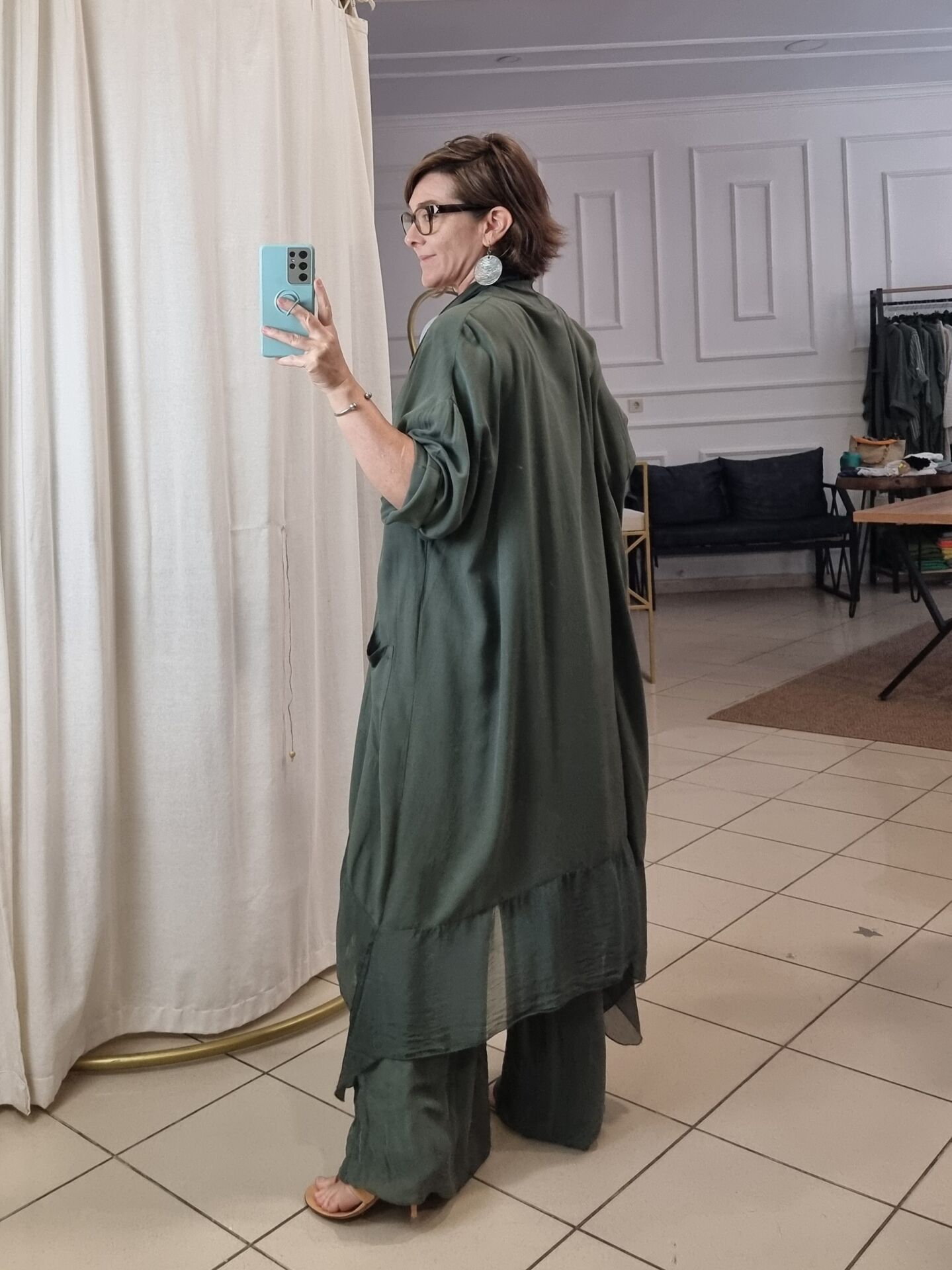 İpeğin zarafetiyle buluşan bu haki ipek pantolon, sade kombinleri bile göz alıcı hâle getiriyor. Akışkan ve hafif dokusu sayesinde yaz aylarında konfor sunarken, astarlı iç yapısıyla iç göstermeyen bir formda tasarlanmıştır. Lastikli beli ve dökümlü yapısı, 46/48 bedene kadar rahatlıkla uyum sağlar. Özellikle bej, siyah ve toprak tonlarıyla kombinlendiğinde, şehir stilinde dengeli ve modern bir görünüm oluşturur.