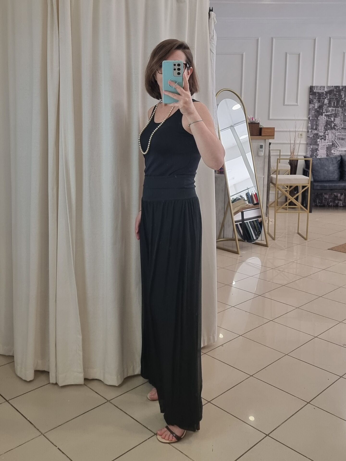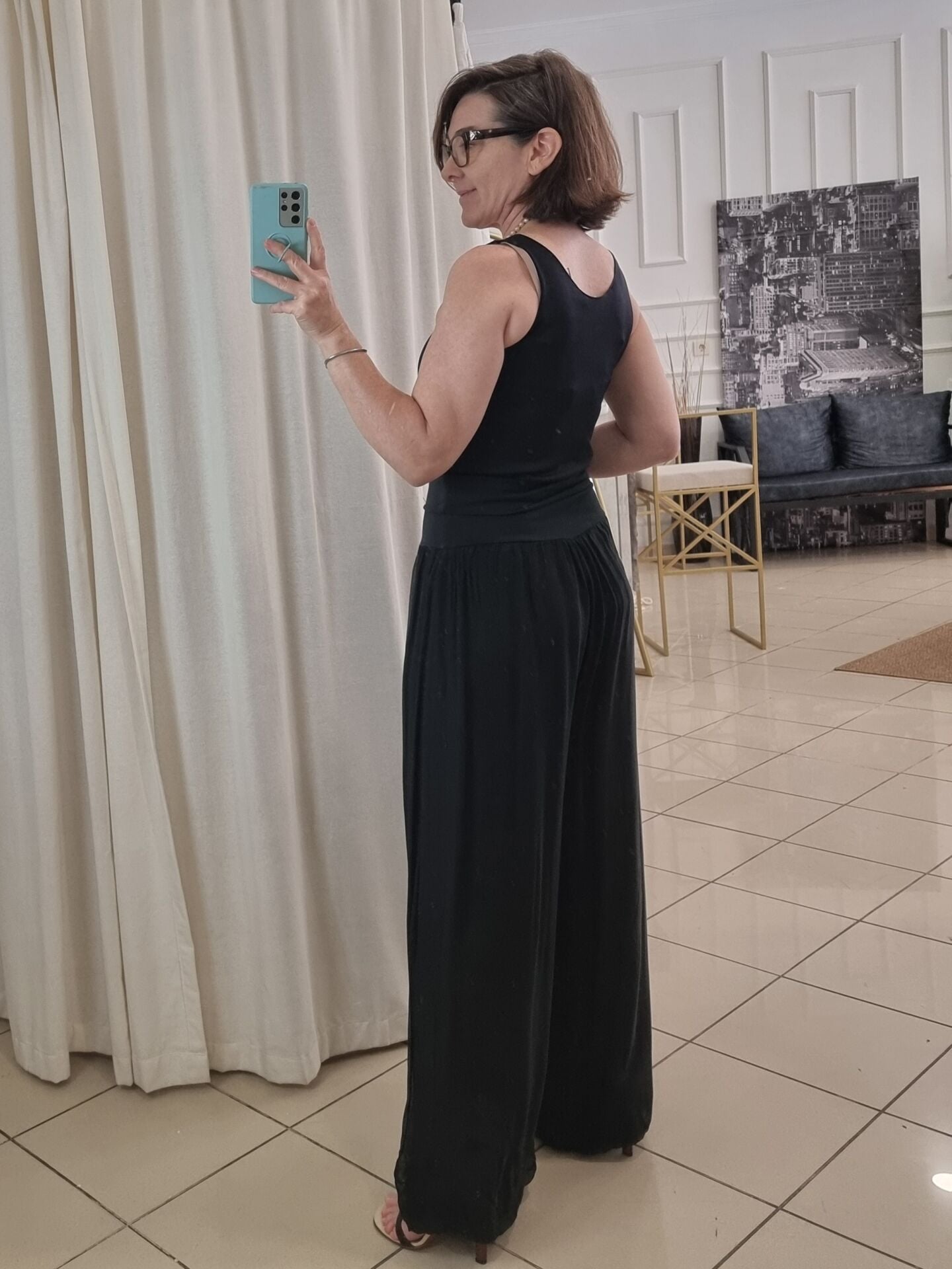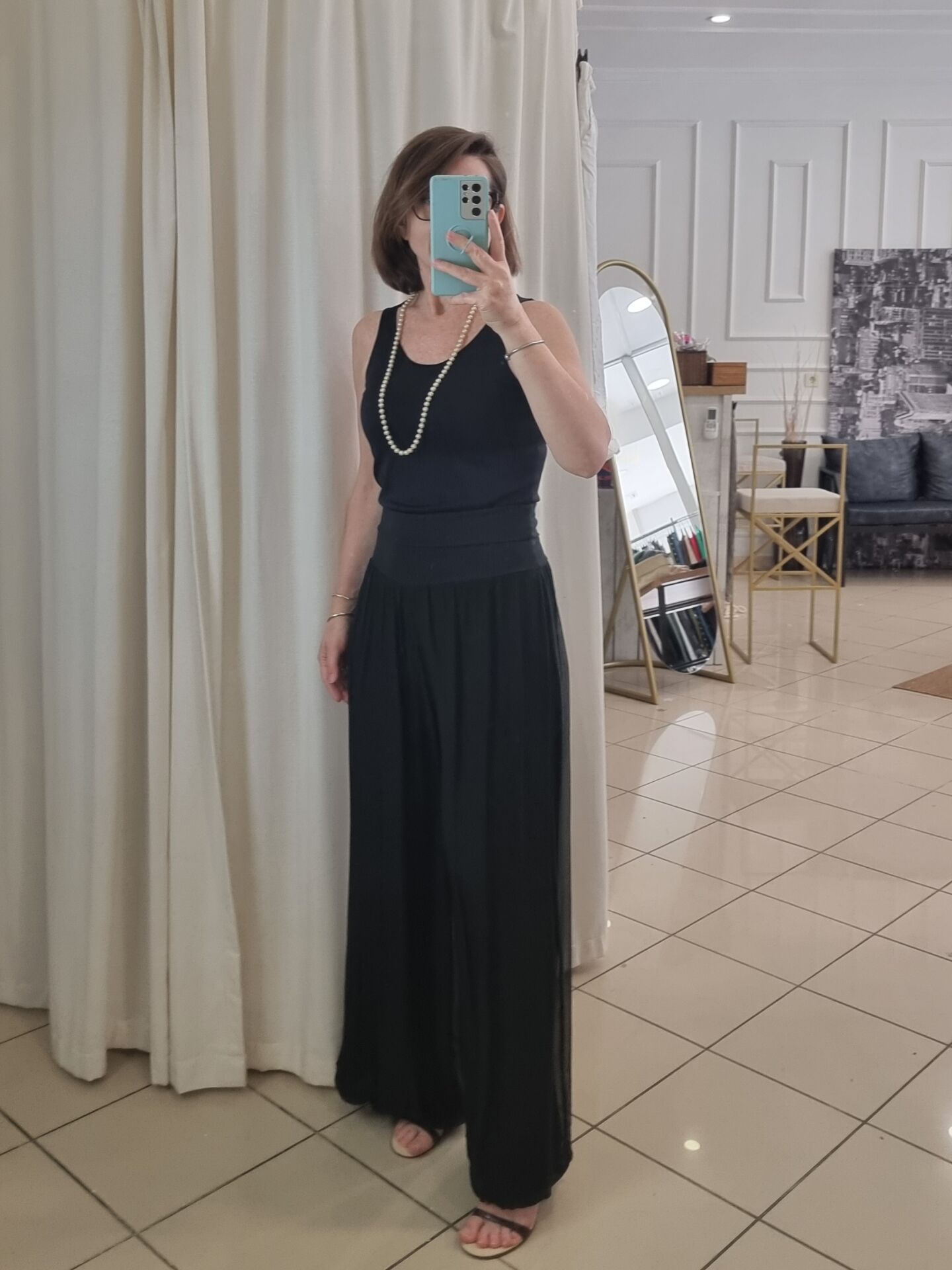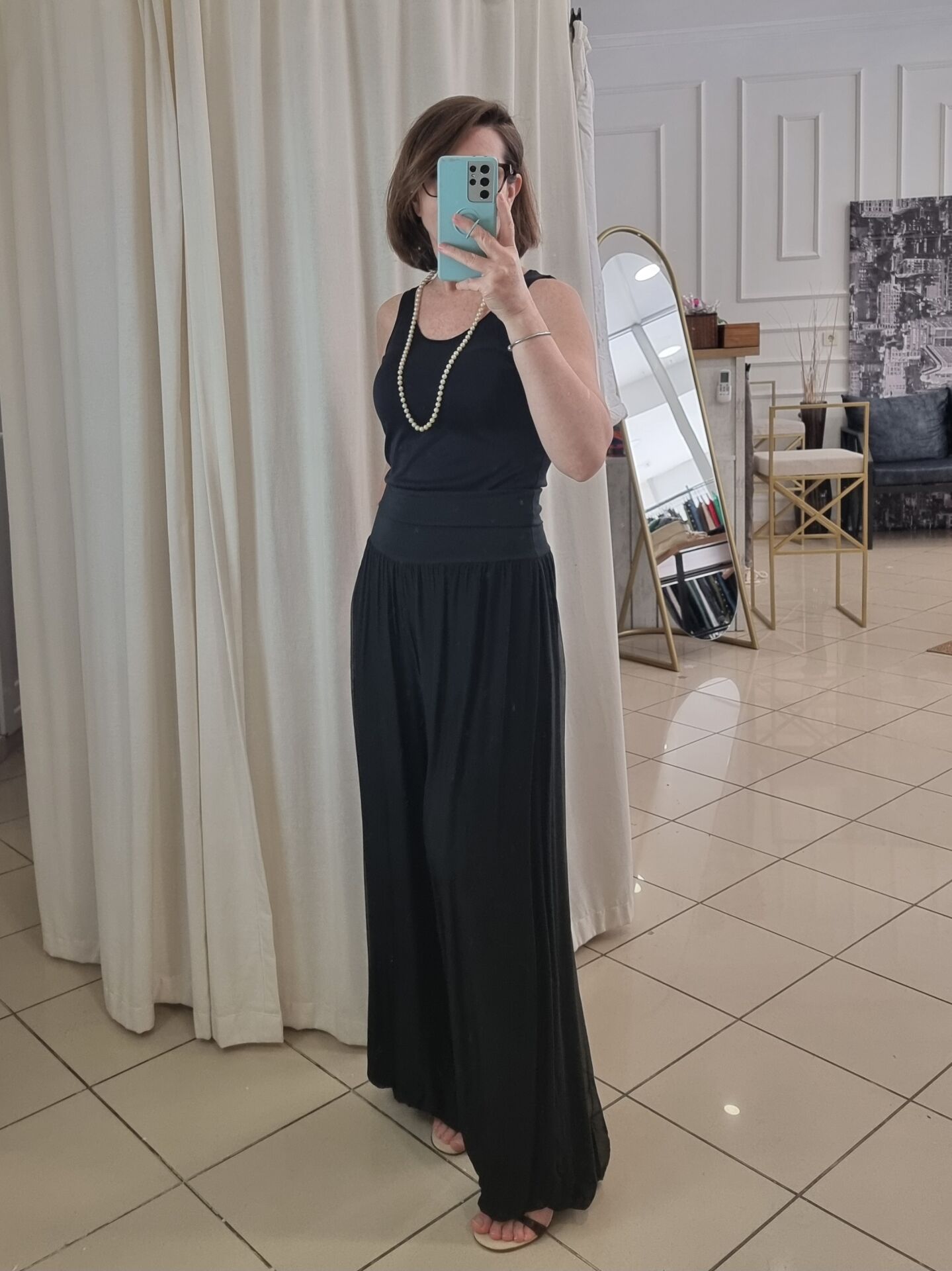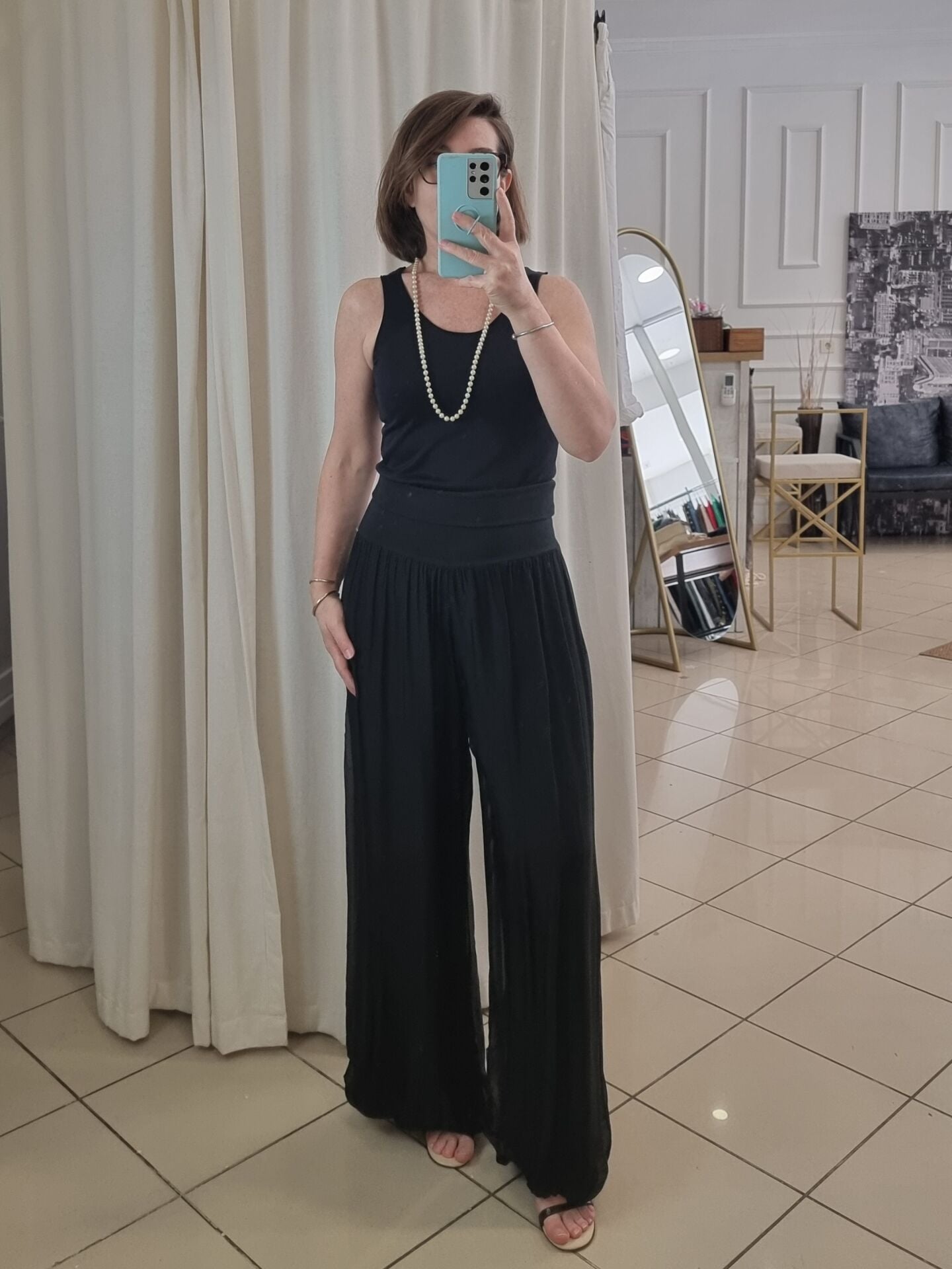 Zamansız siyah tonu ve ipeksi dökümlü yapısıyla bu pantolon, stilinizi sade ama etkili bir şekilde tamamlar. Astarı sayesinde iç göstermez ve gün boyu konfor sağlar. Beli lastikli yapısıyla 46/48 bedene kadar uyum sunar. Kumaşının doğal ışıltısı sayesinde ister günlük ister akşam kombinlerinde rahatlıkla kullanılabilir. Bu ipek pantolon dolabınızın şıklık garantili parçalarından biri olmaya adaydır.