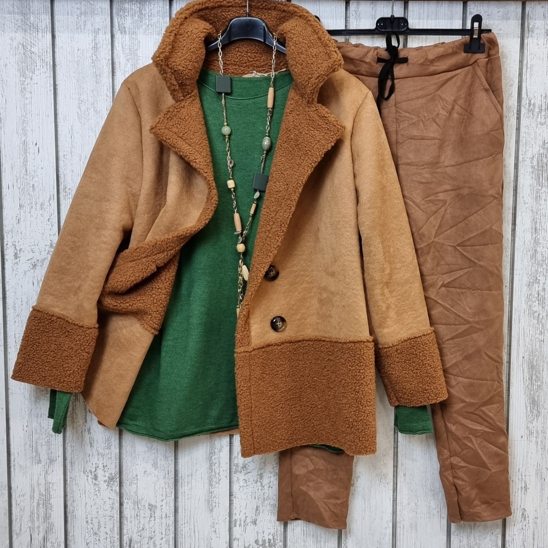 Beli lastikli, esnek, cep detaylı güderi (suni) pantolon.