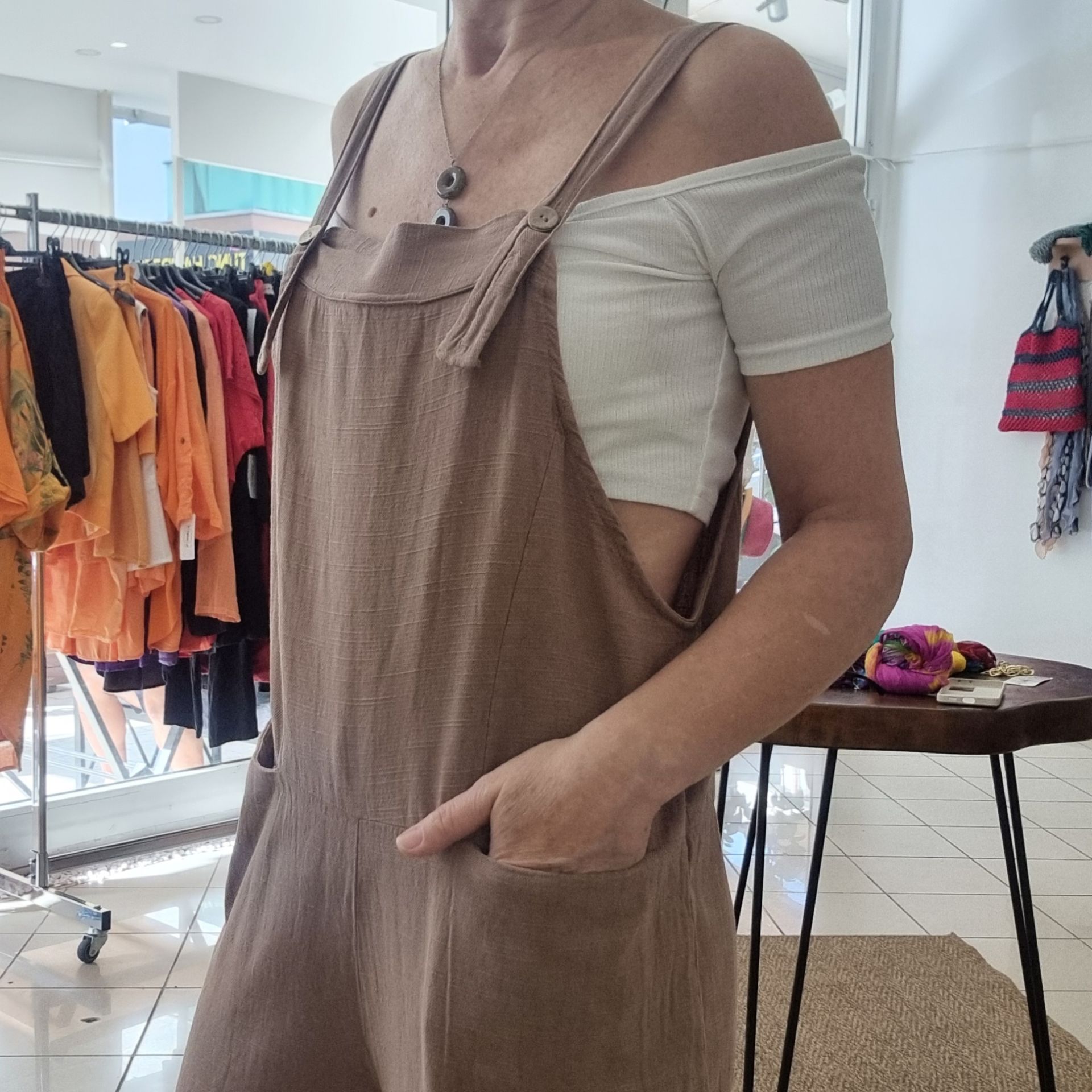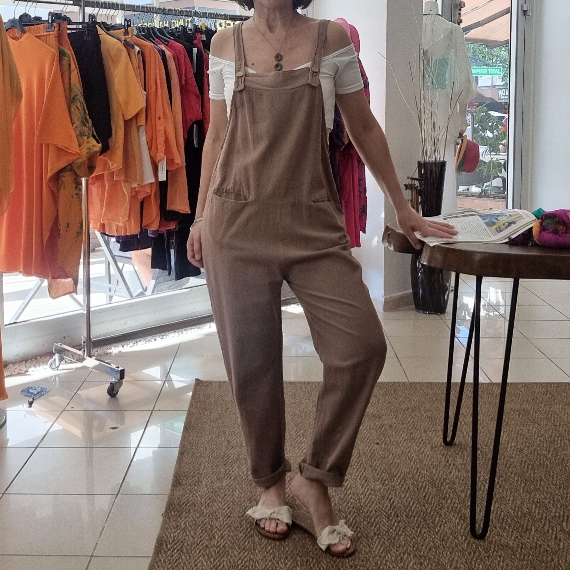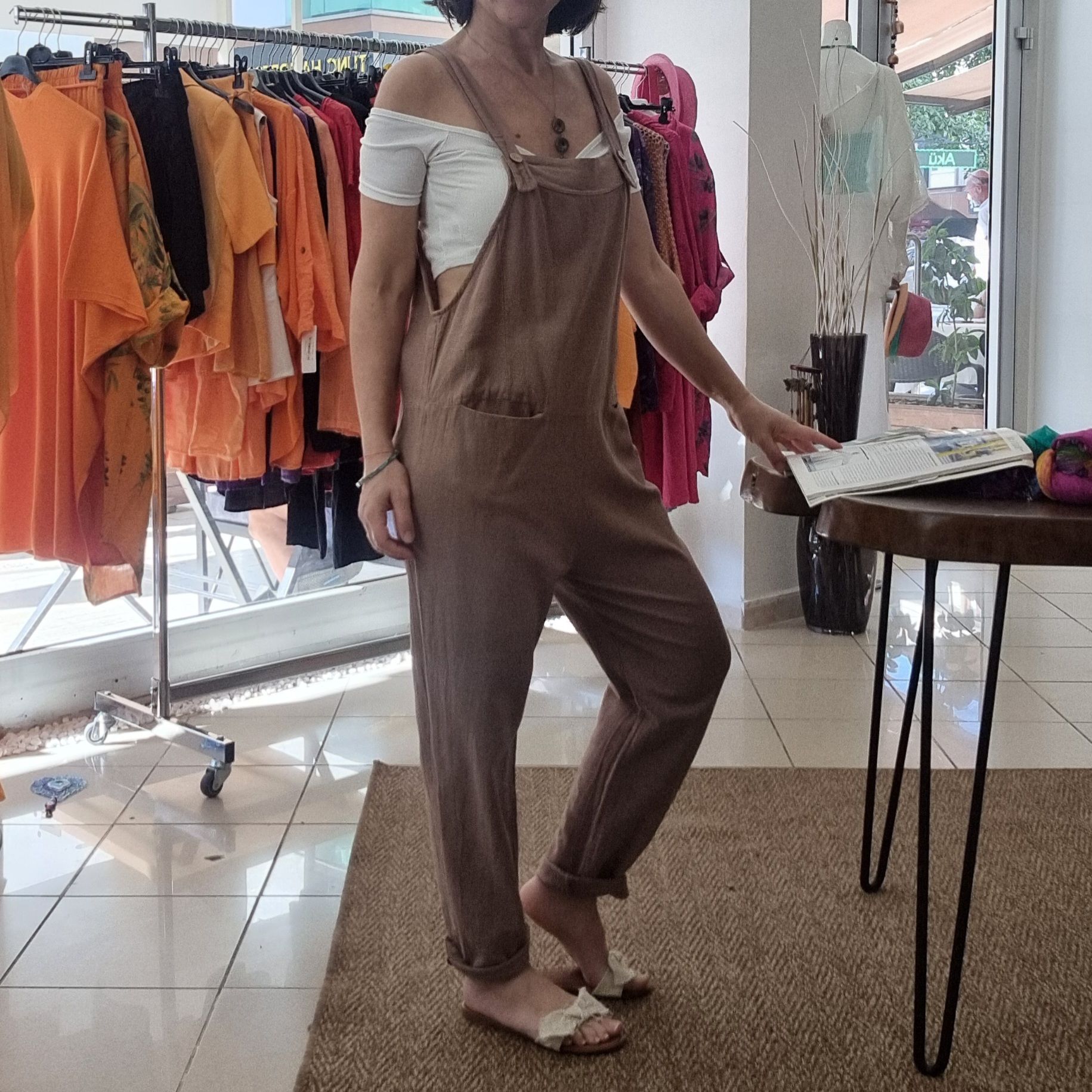 Doğal viskon kumaşıyla cilde nefes aldıran bu kahverengi ürün, salaş kesimi ve ayarlanabilir askılarıyla hareket özgürlüğü sağlar. Ön kısmındaki bohça cep detayı modele hem fonksiyonellik hem de tarz kazandırır. Yazlık ve mevsimlik kullanıma uygun olan bu tulum, hem evde hem dışarıda konforlu bir şıklık sunar. Farklı vücut tiplerine uyum sağlayan S/M ve L/XL beden seçenekleriyle pratik ve çok yönlü bir kullanım sunar.