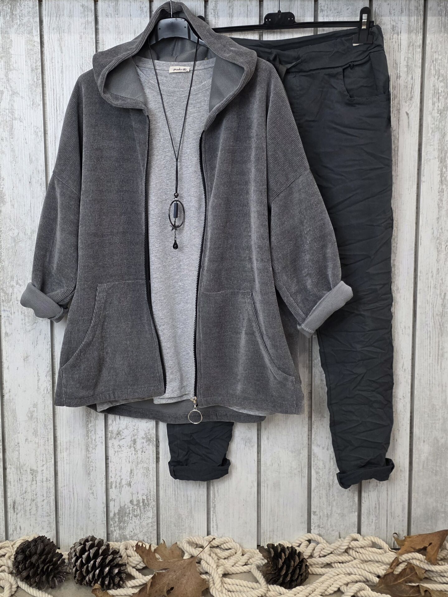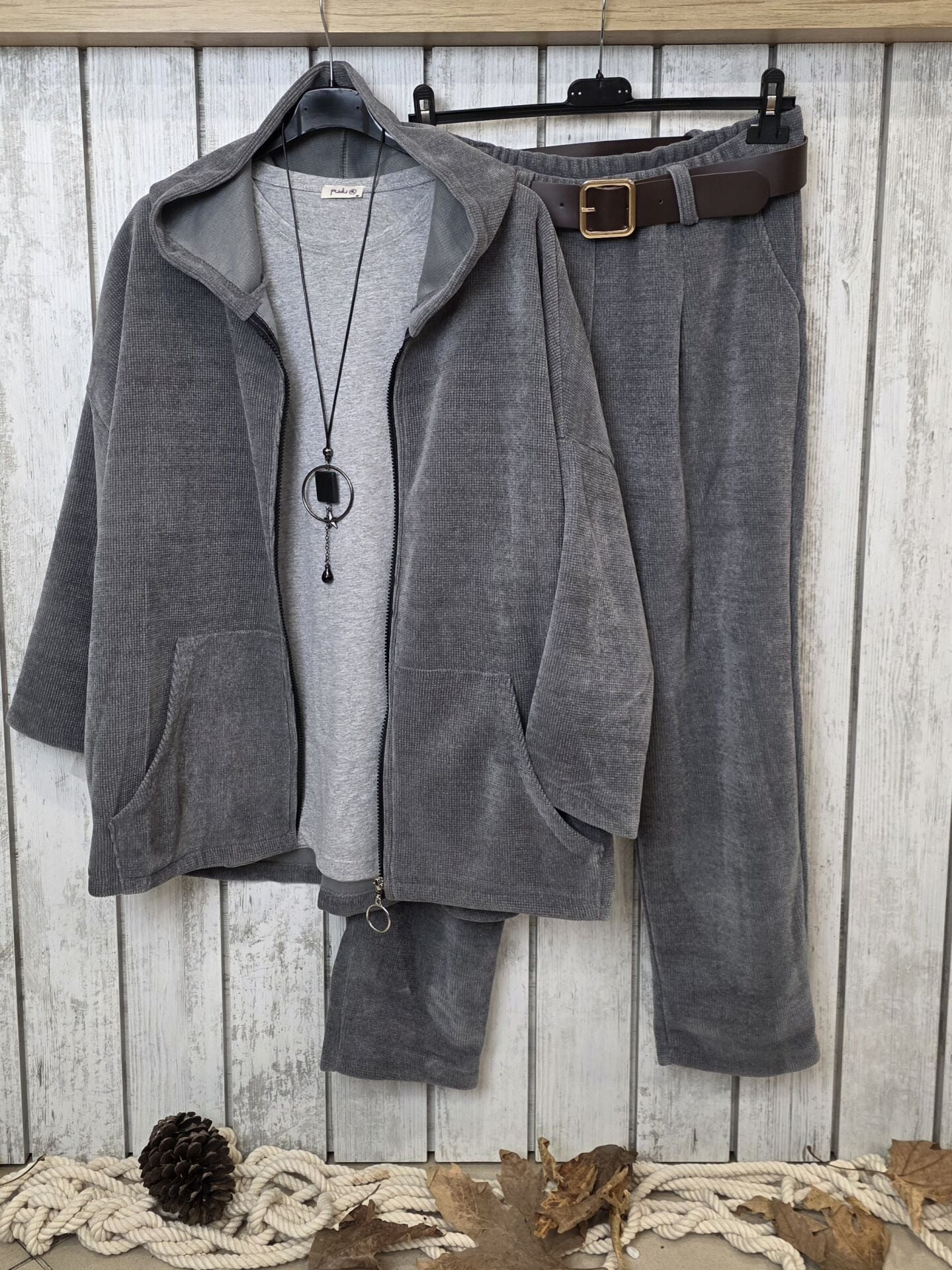 Gri Kapüşonlu Kadife Sweat Ceket