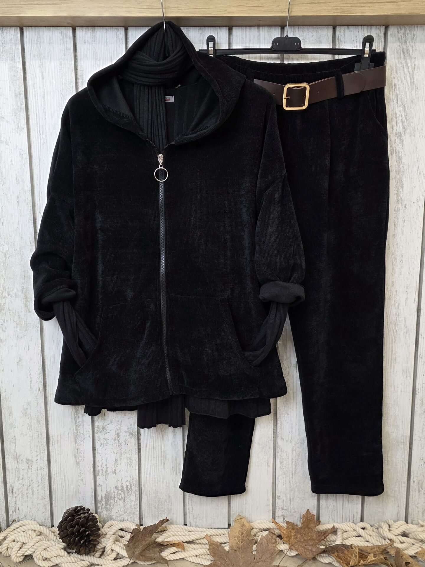 Siyah Kapüşonlu Kadife Sweat Ceket
