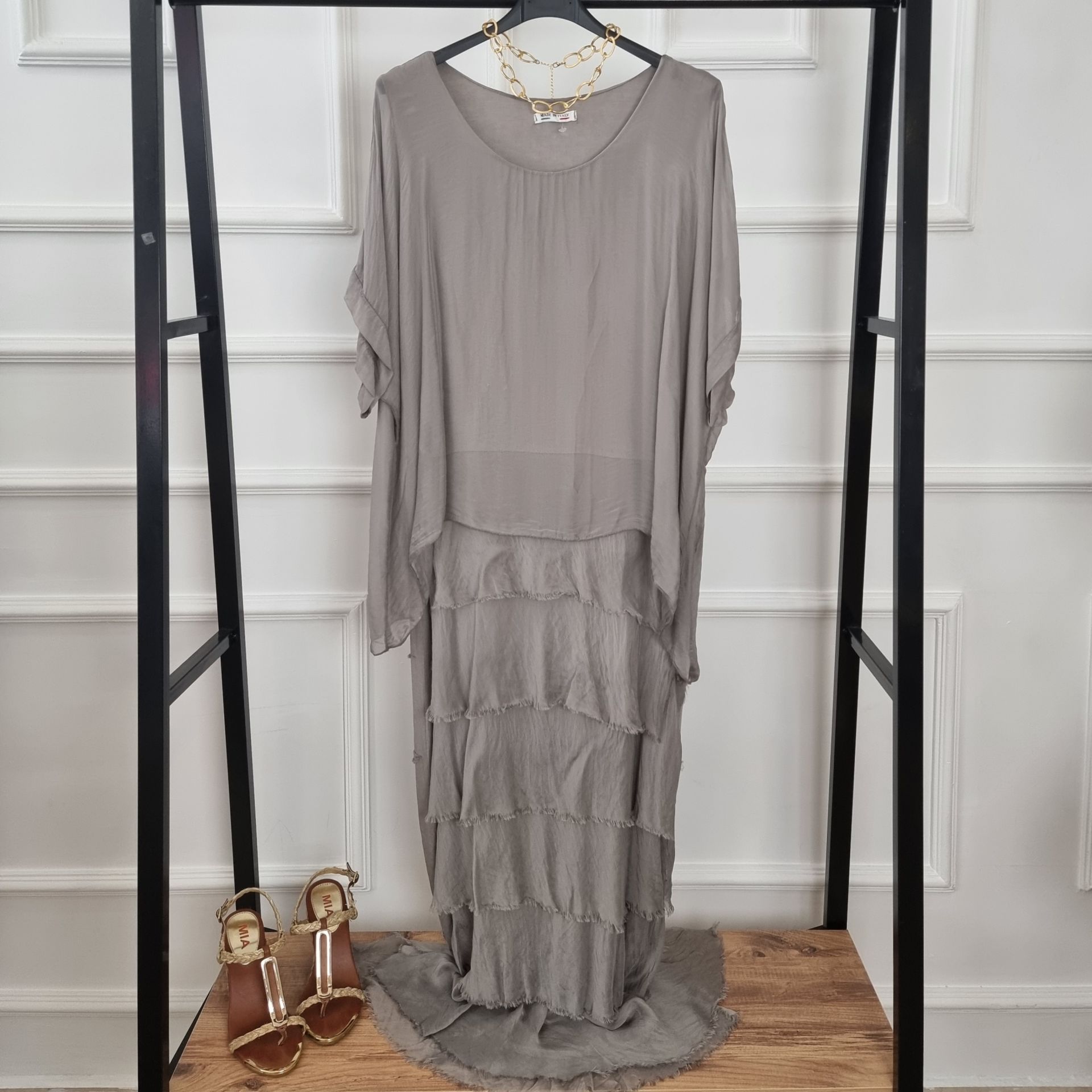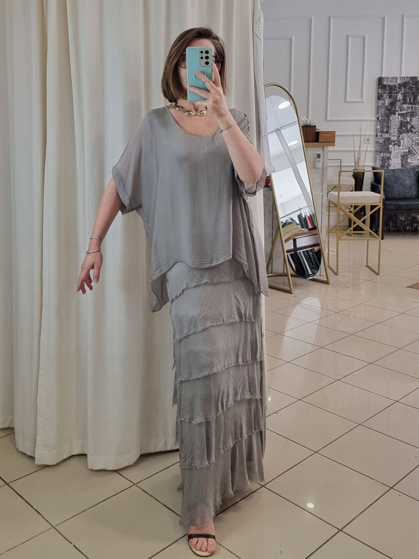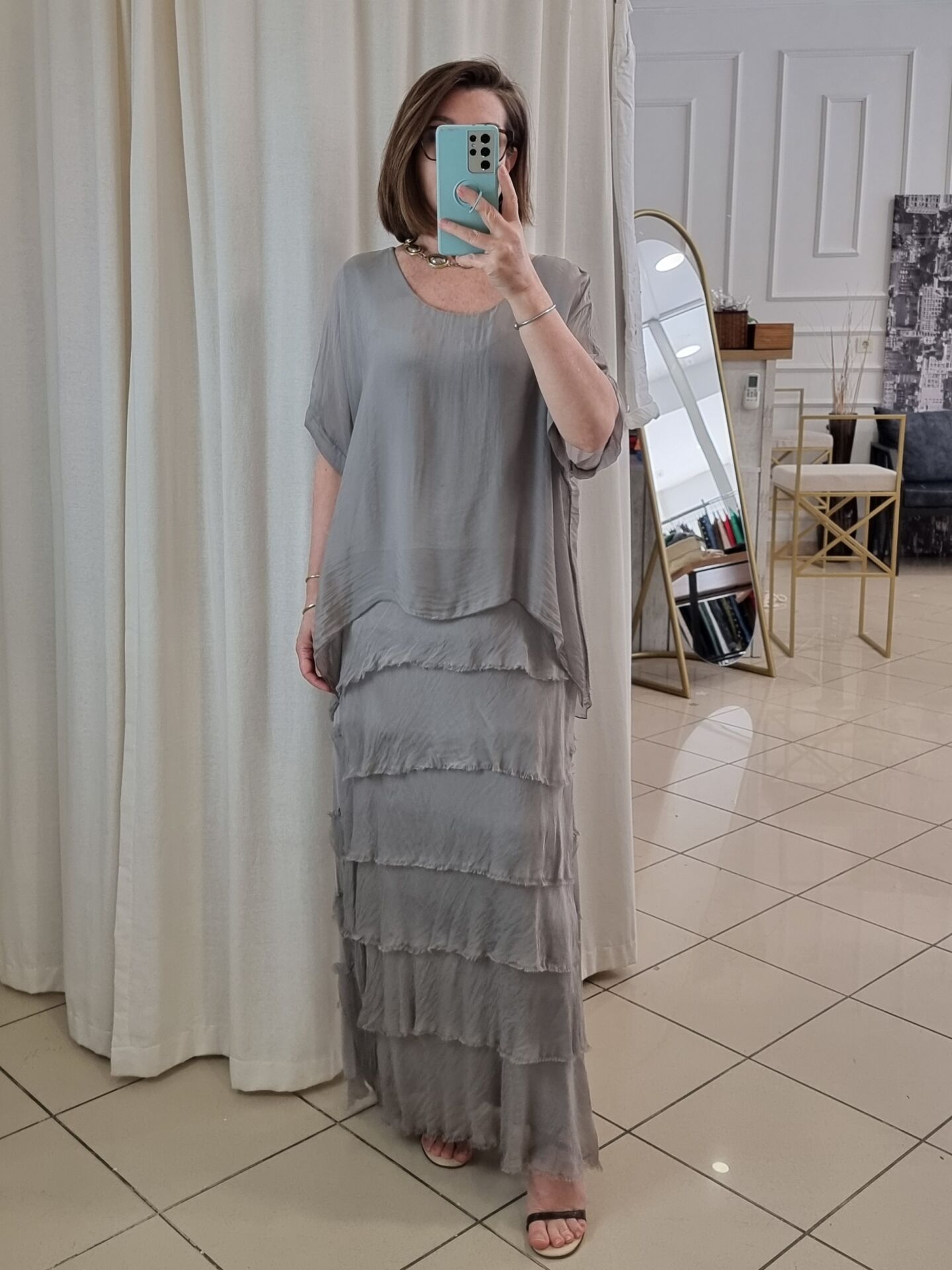 Katlı Uzun İpek Elbise Vizon İtalyan.