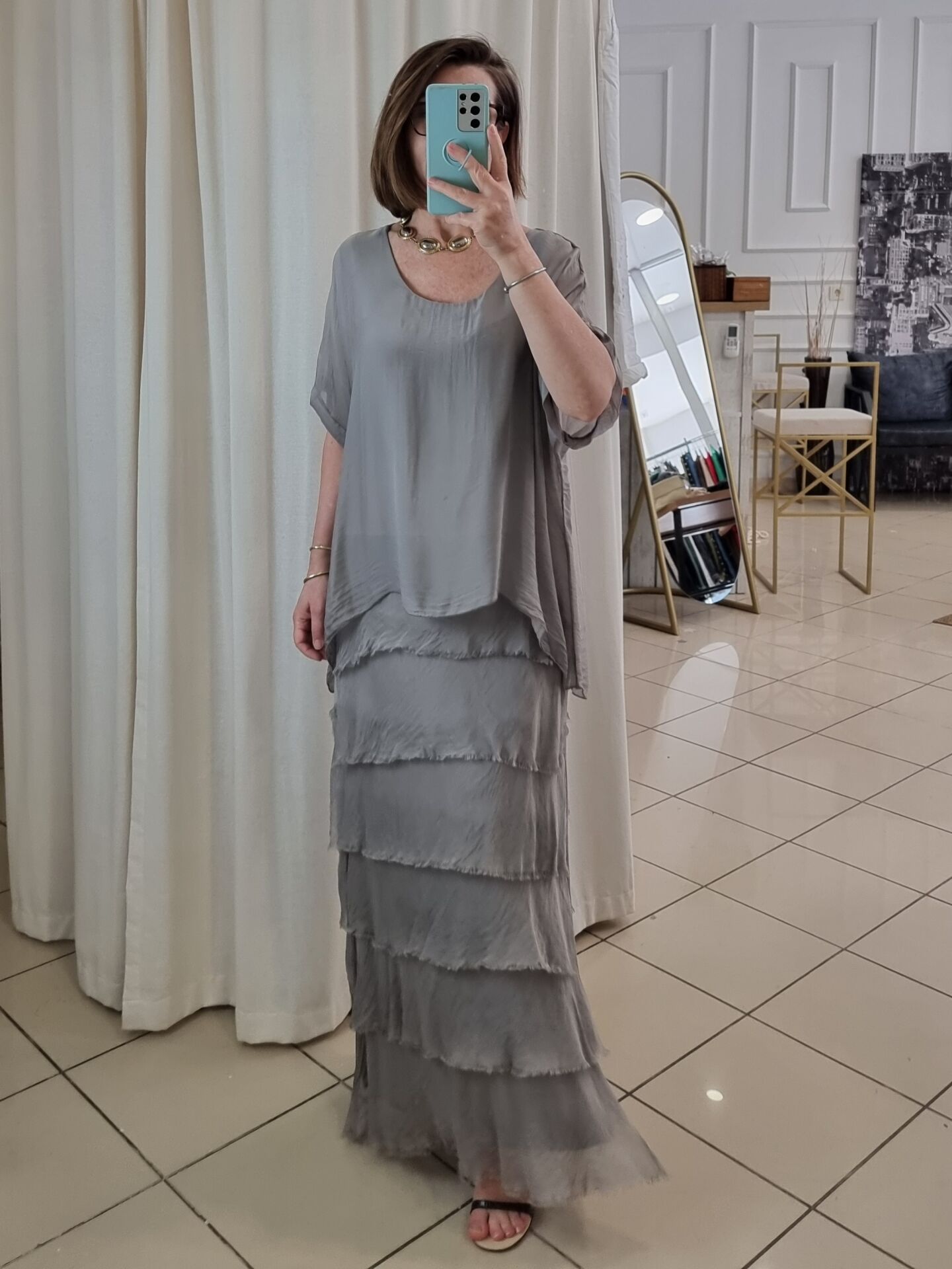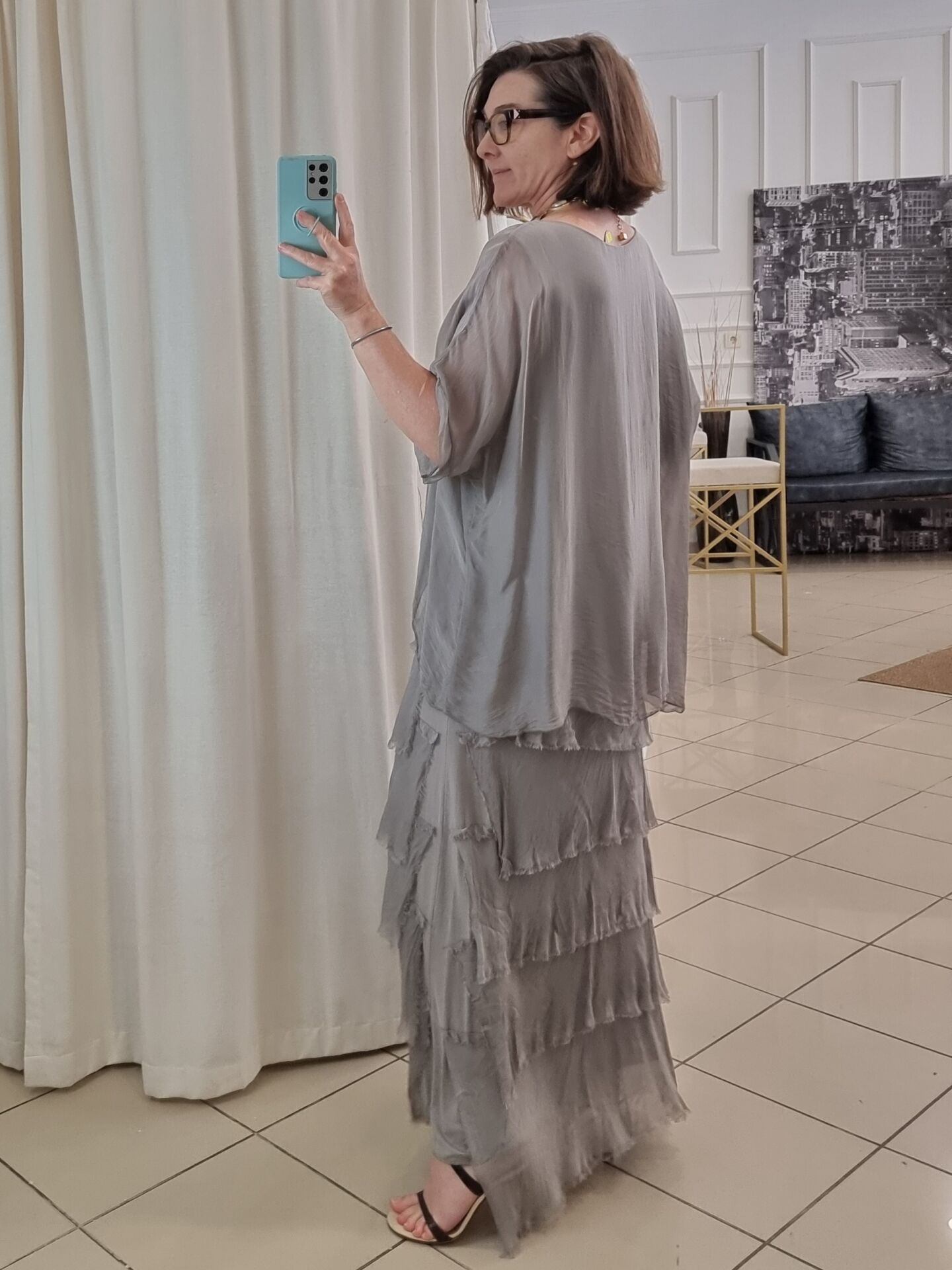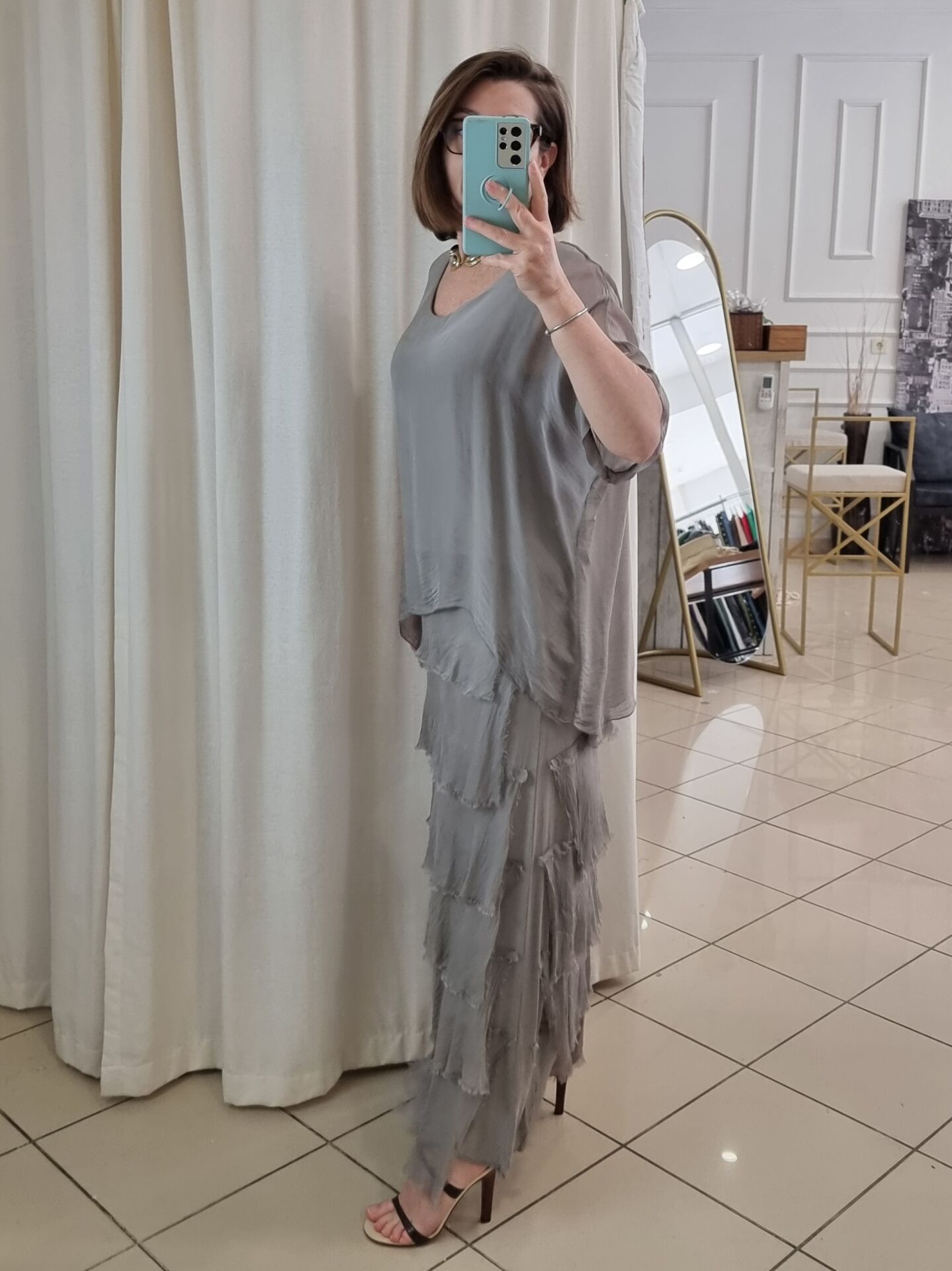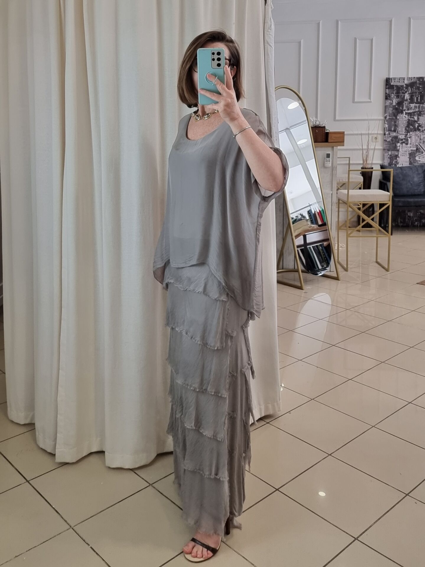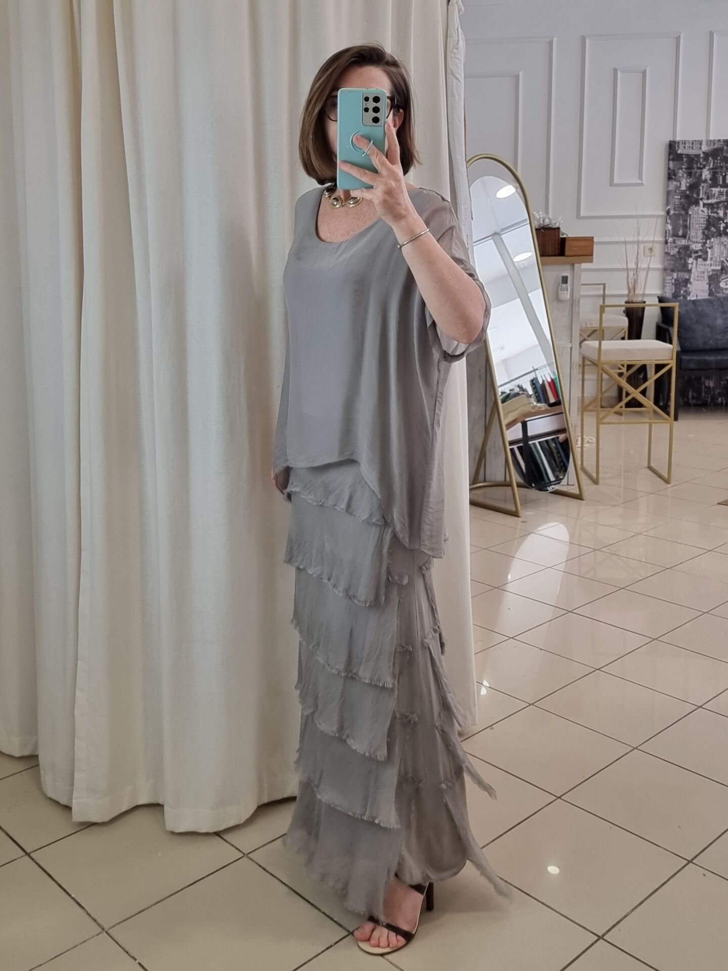 Zarif yapısı ve dökümlü şifon katlarıyla dikkat çeken bu ipek elbise, hareket ettikçe akışkan bir görünüm sunar. İç kısmındaki askılı elbise vücuda otururken, üzerine eklenen oversize ipek bluz hafiflik ve konfor kazandırır. %30 ipek içeriğiyle yumuşak ve lüks bir his sunan bu model, özel günlerden tatil akşamlarına kadar şık ve rahat bir alternatif oluşturur.