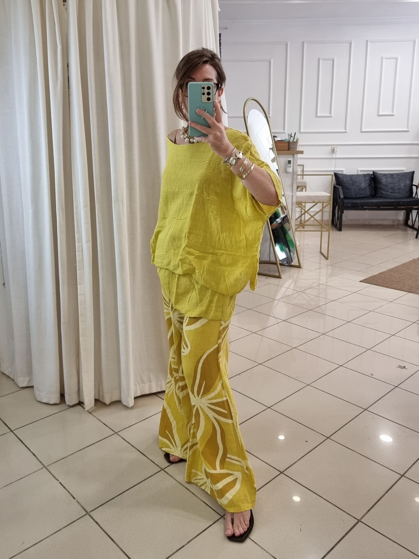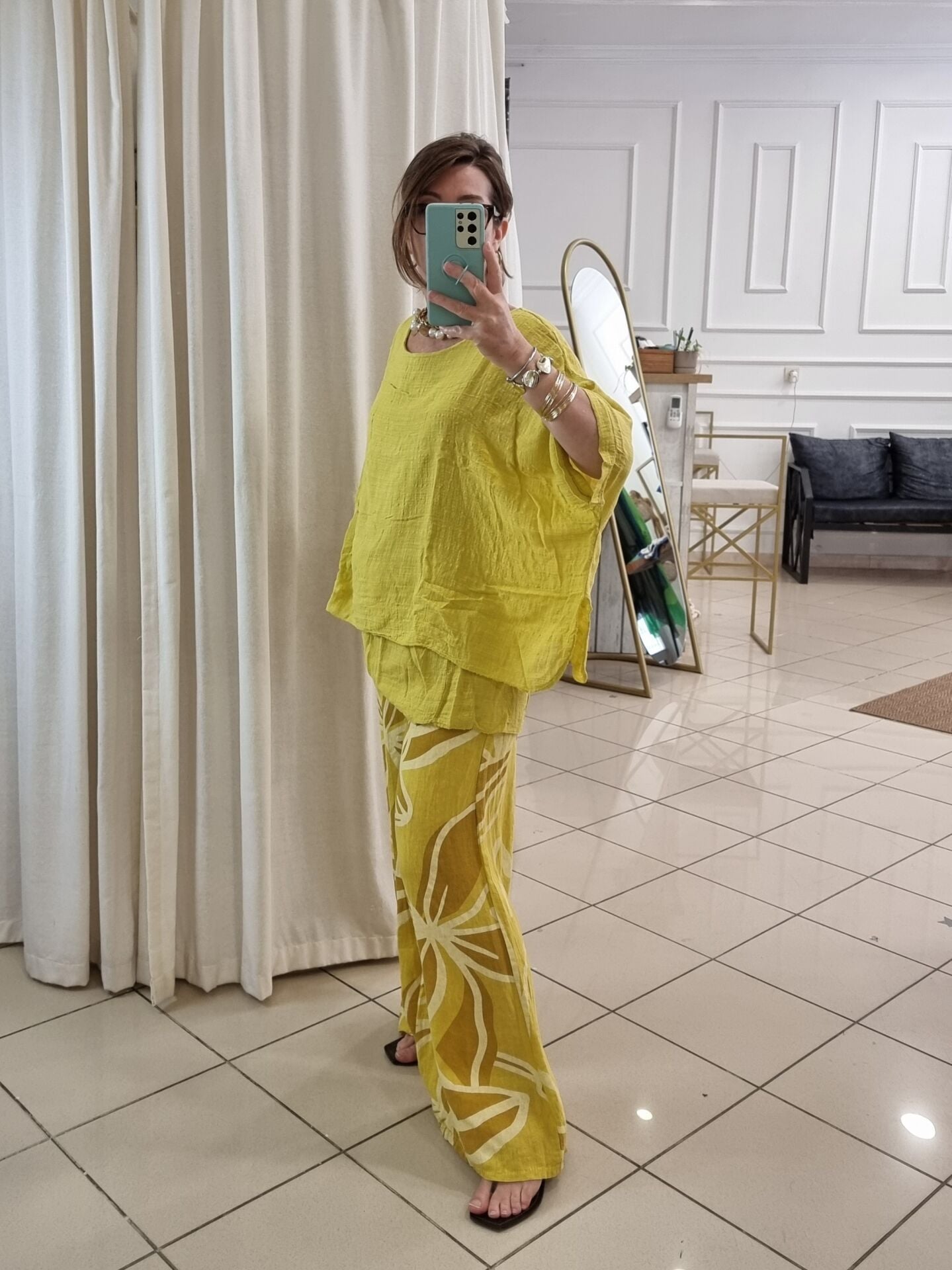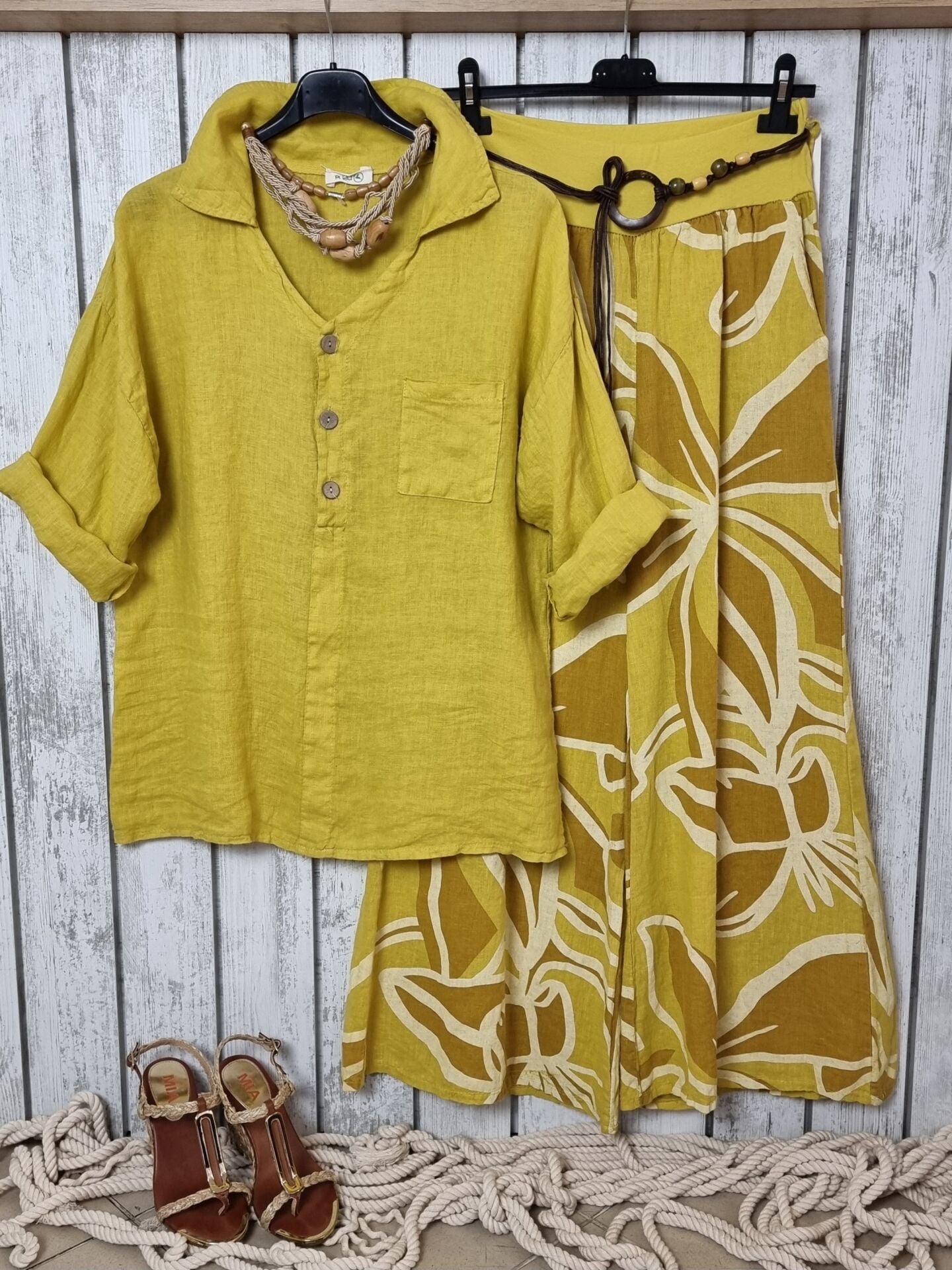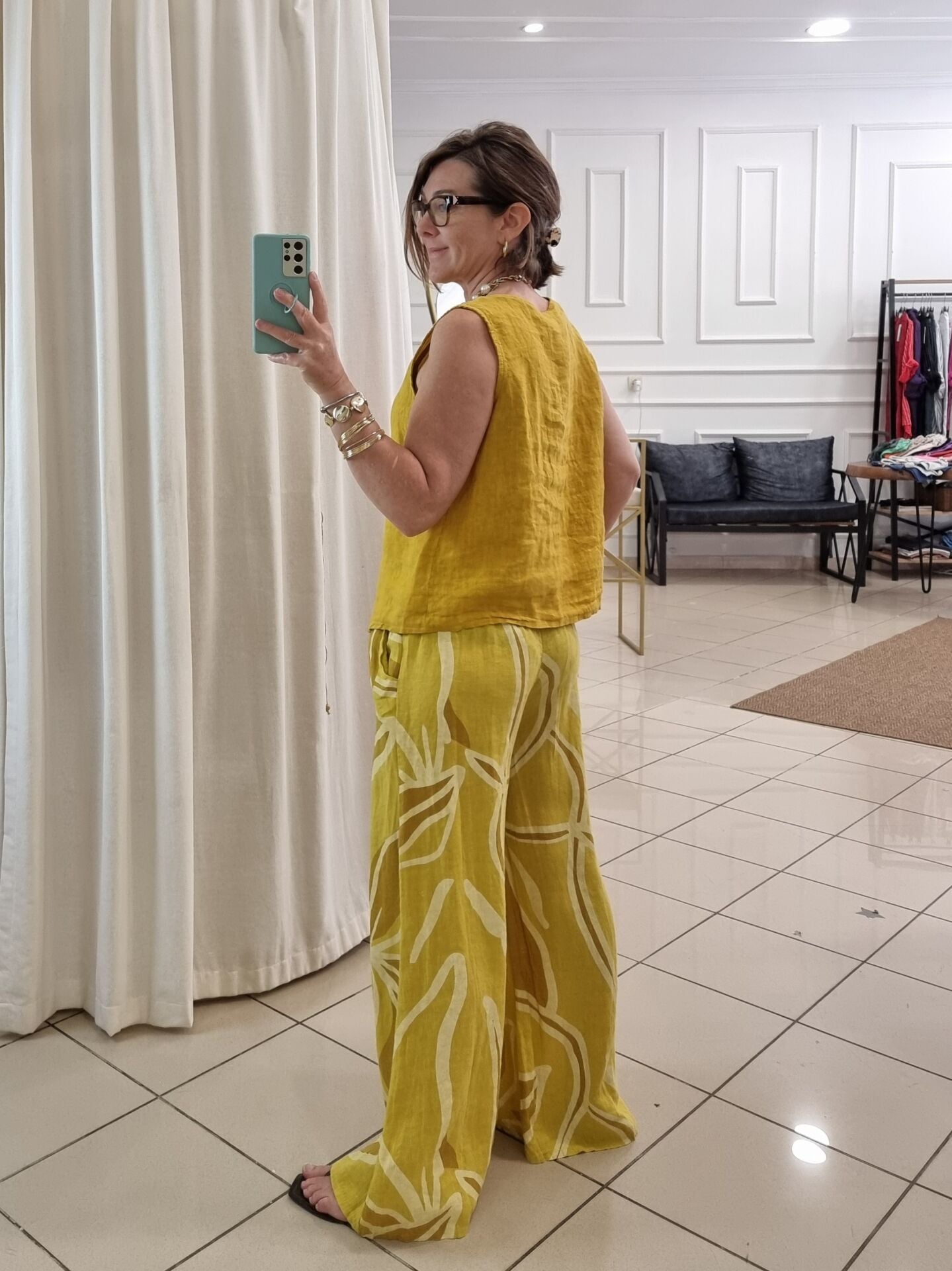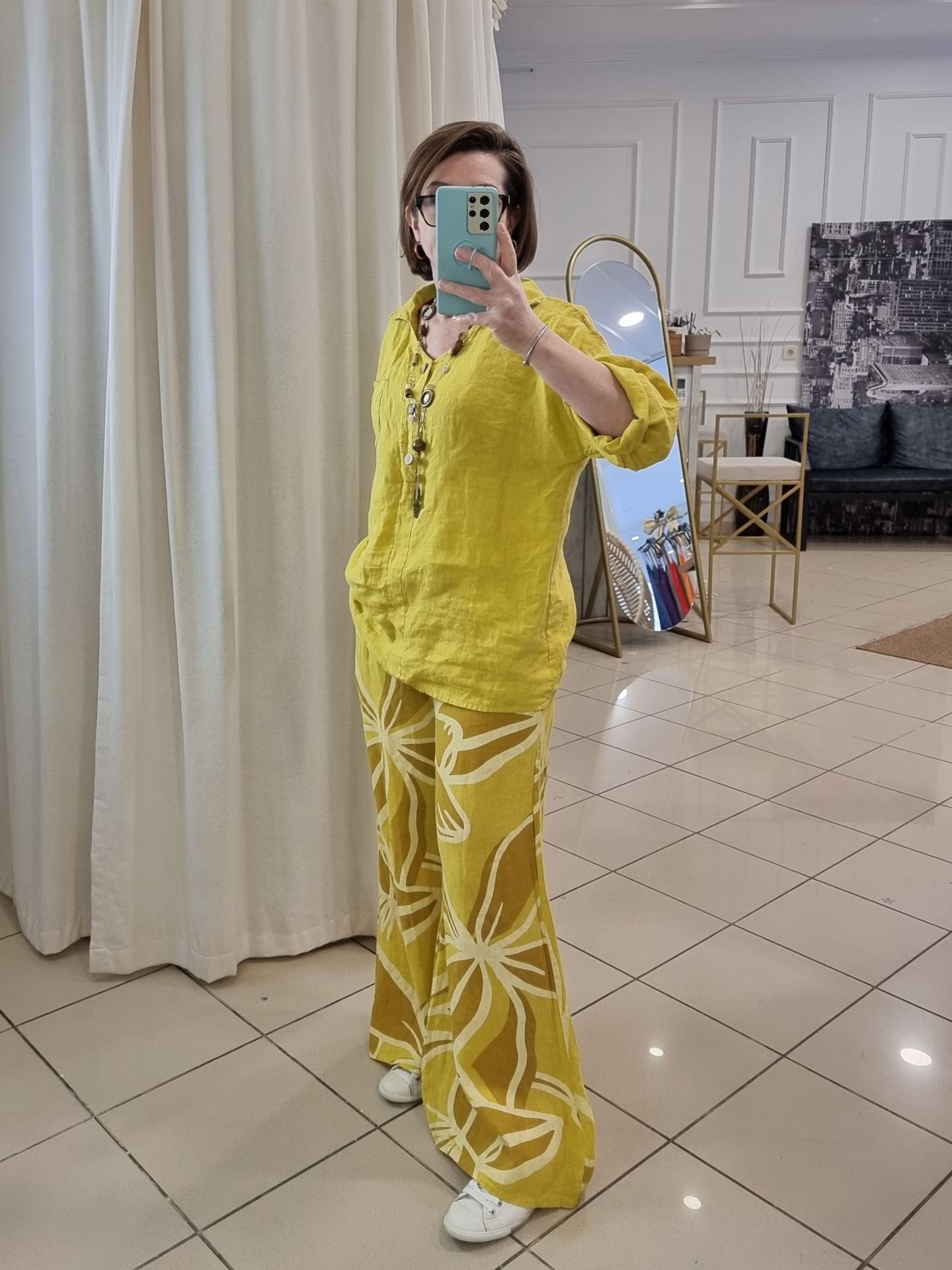 Desenli hardal sarı bol paça palazzo keten pantolon.
