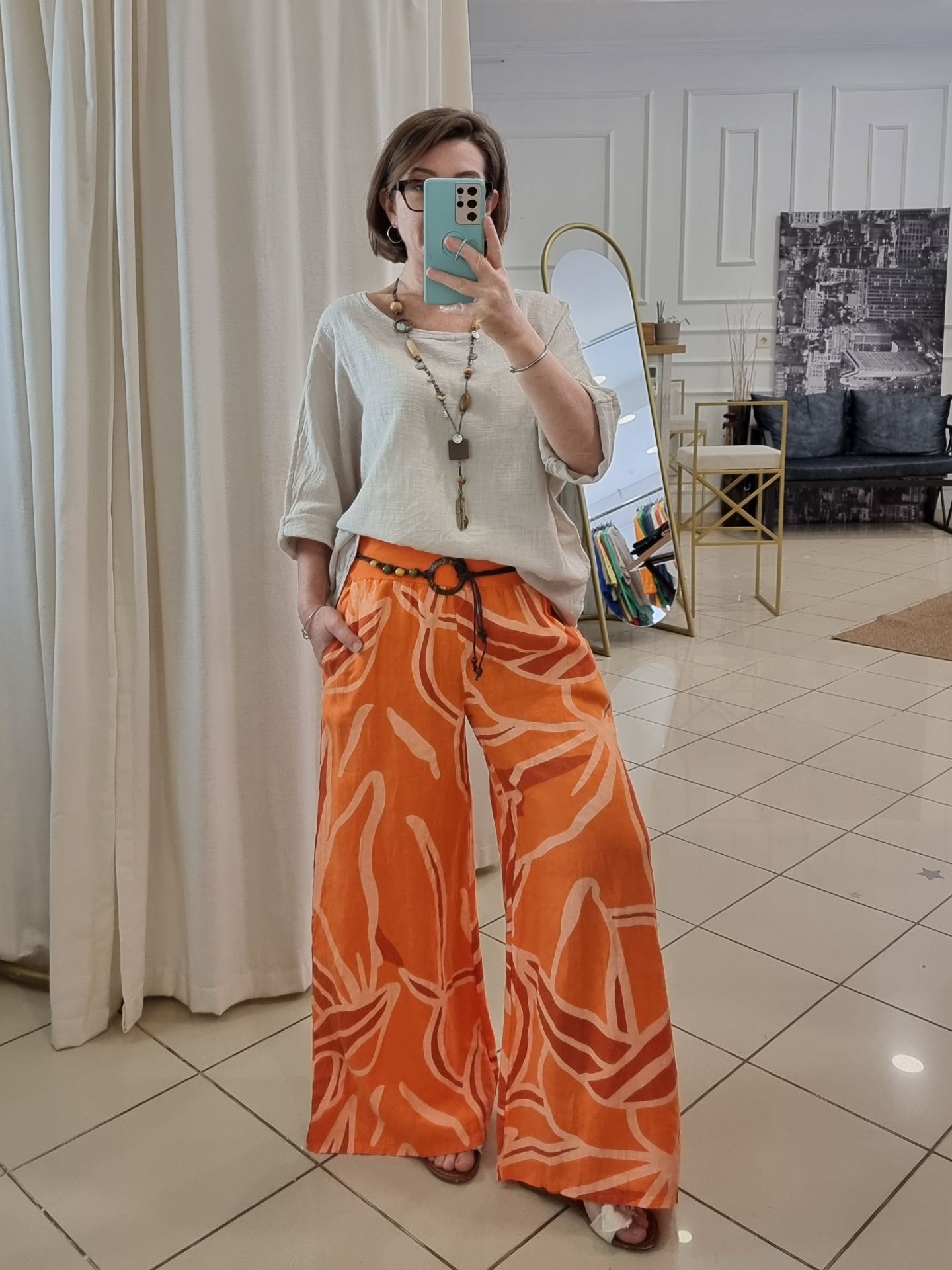 Desenli turuncu bol paça palazzo pantolon. Deri kemerli İtalyan pantolon. Yan cepli. Bol paça. Oversize. 44 bedene kadar uyumludur.