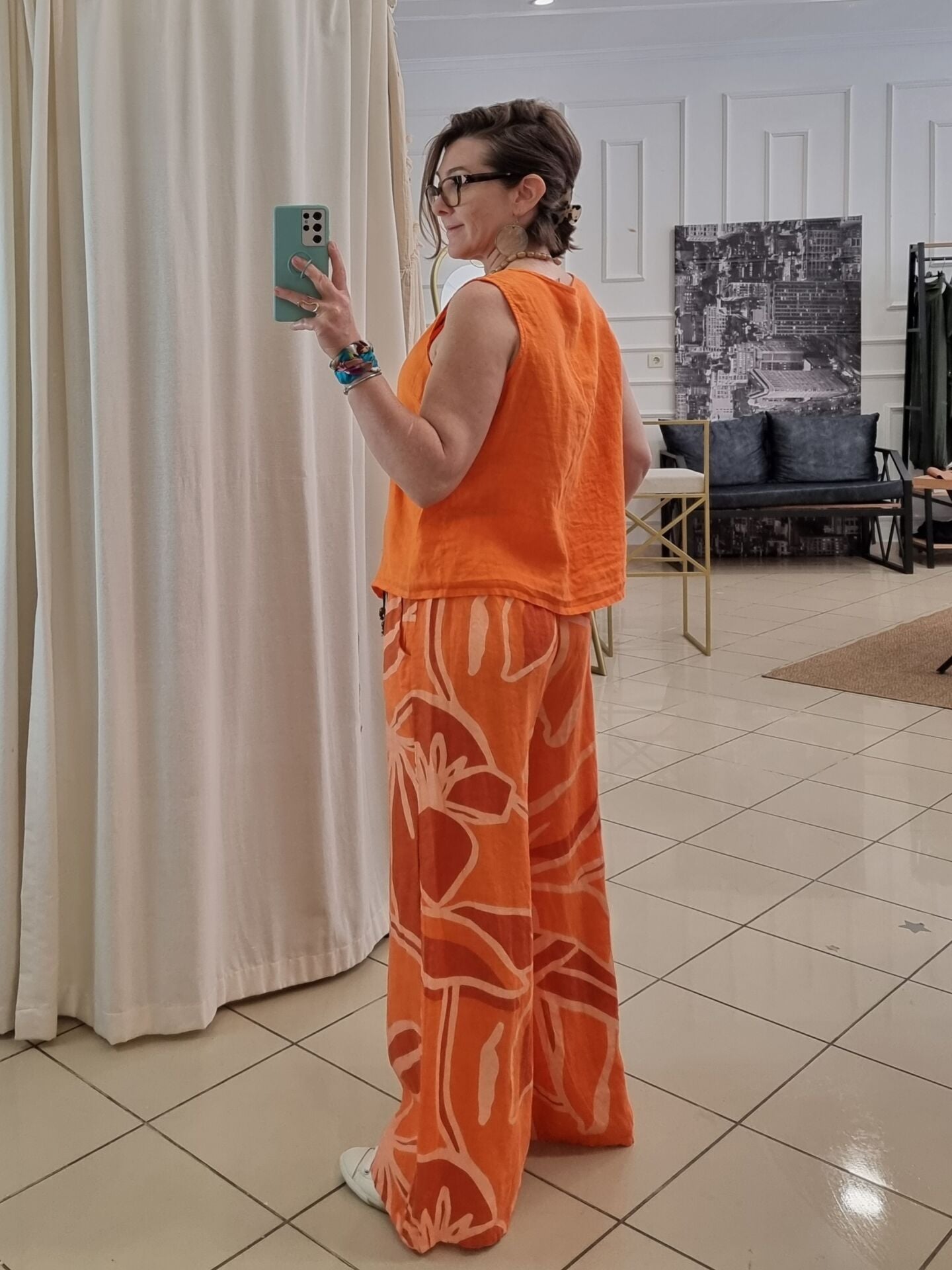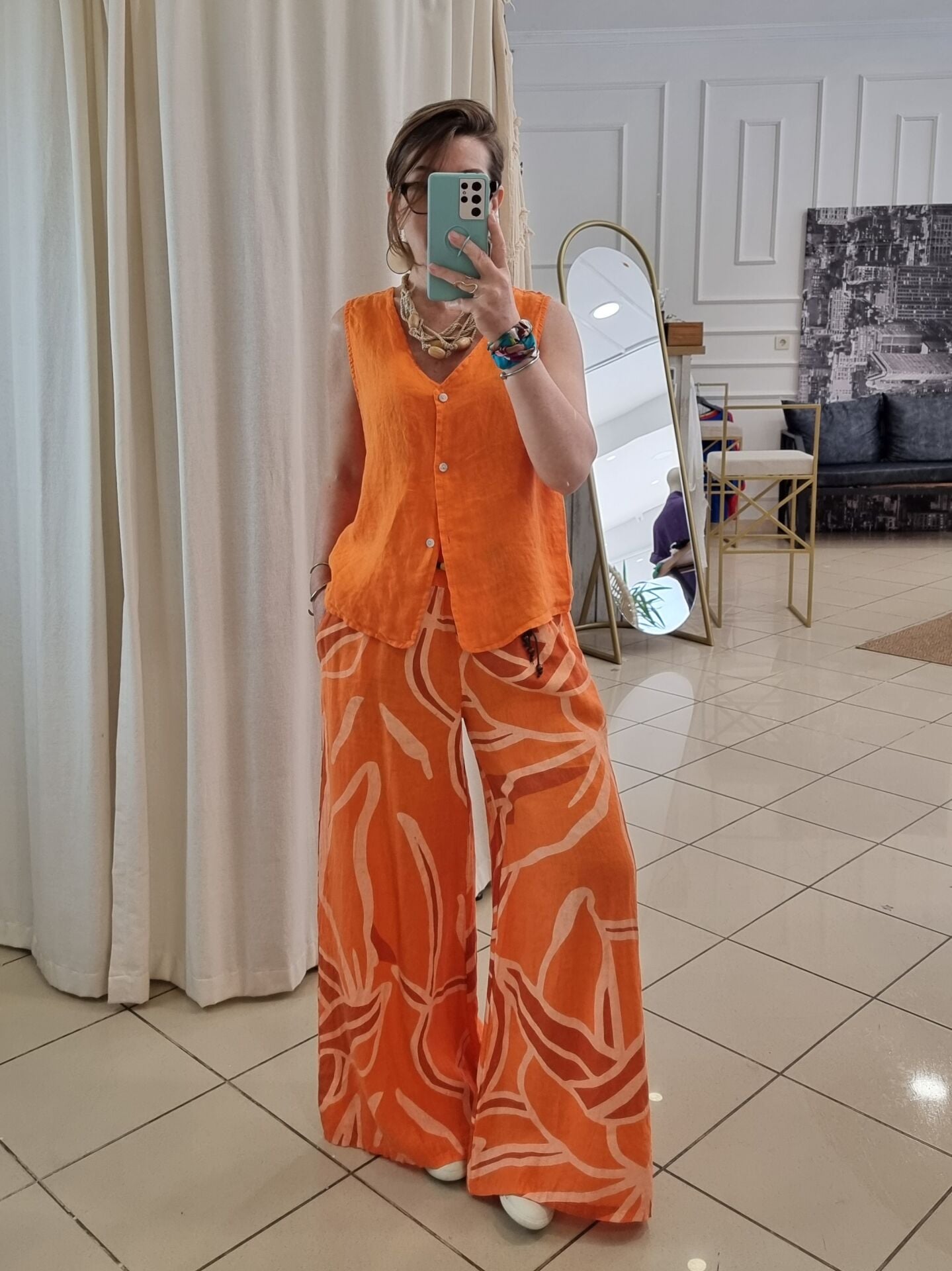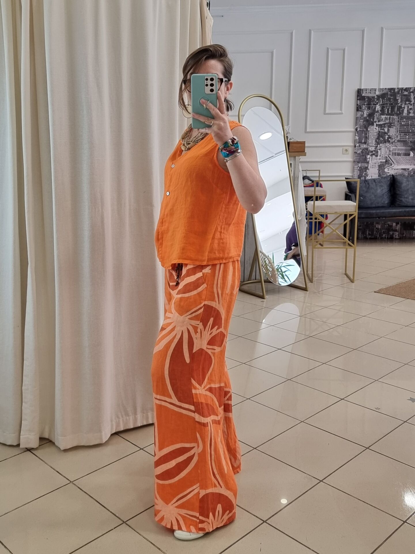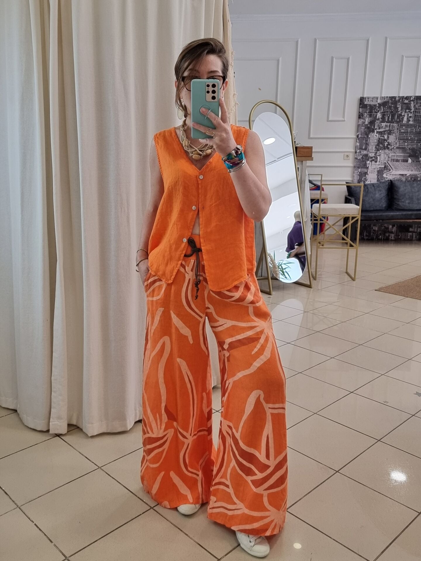 Desenli turuncu bol paça palazzo keten pantolon.