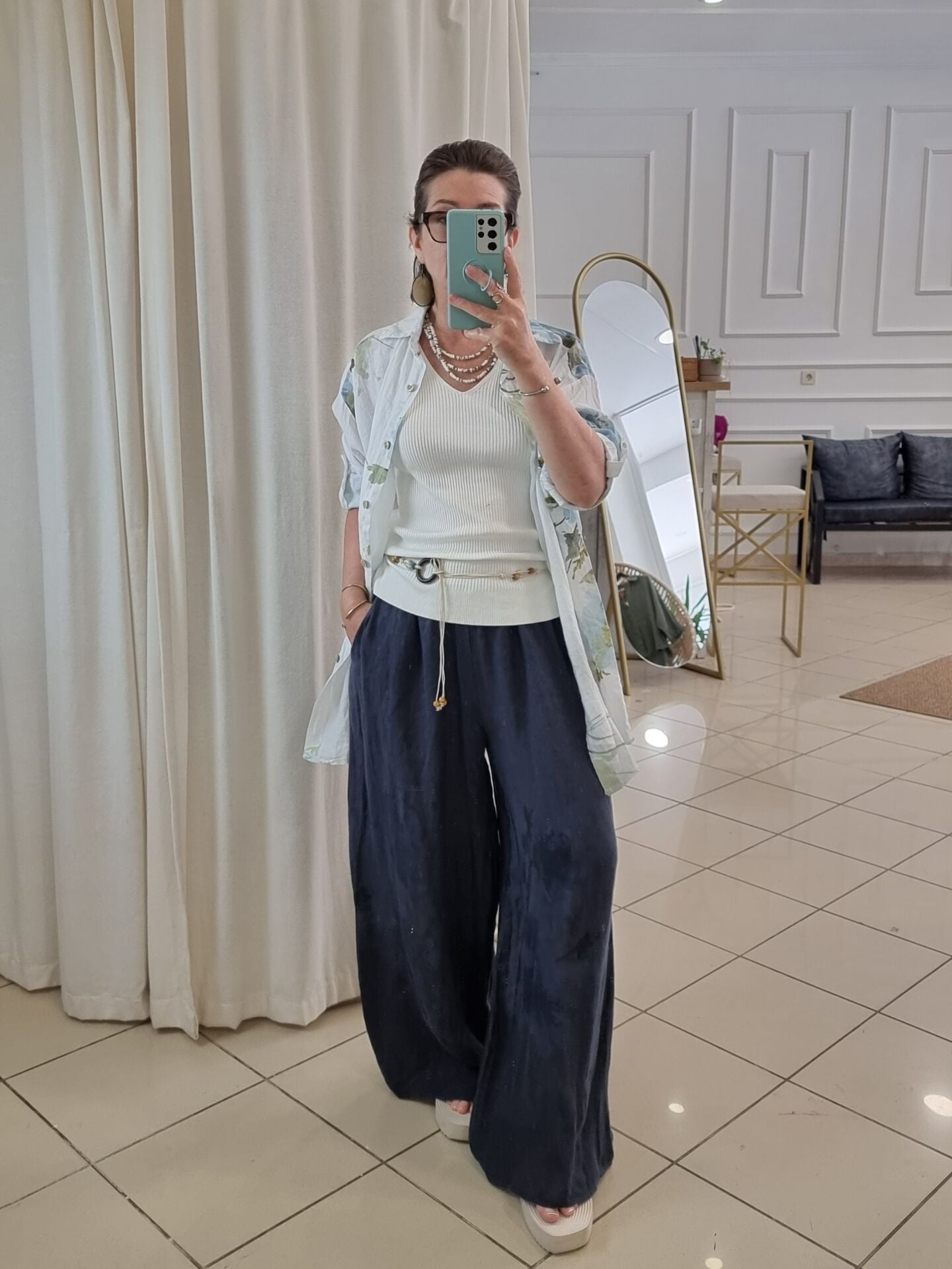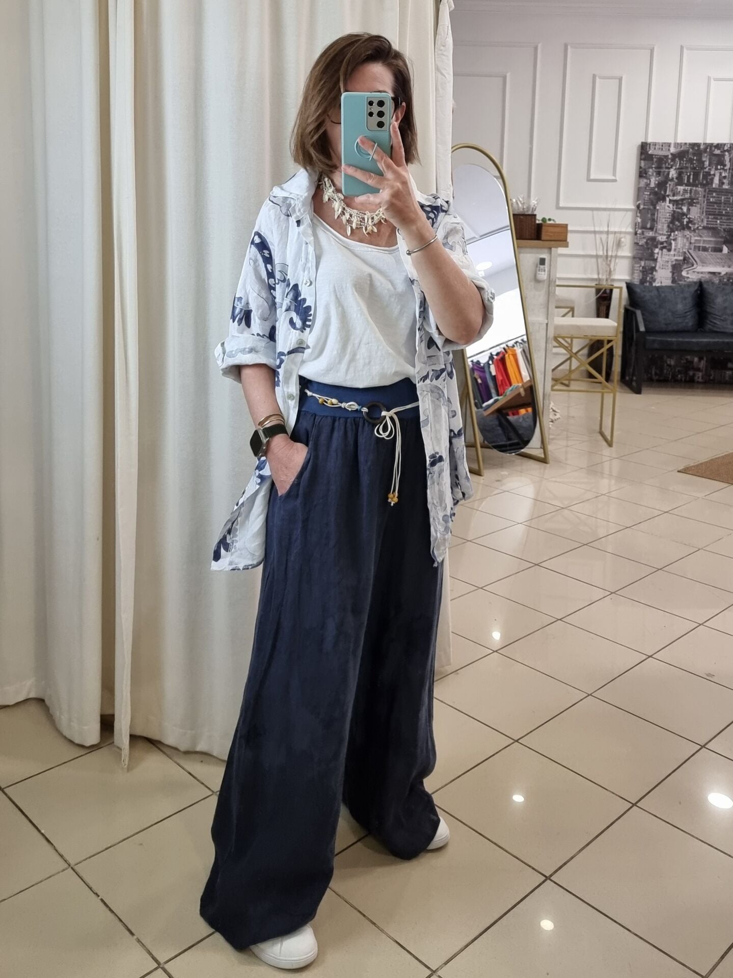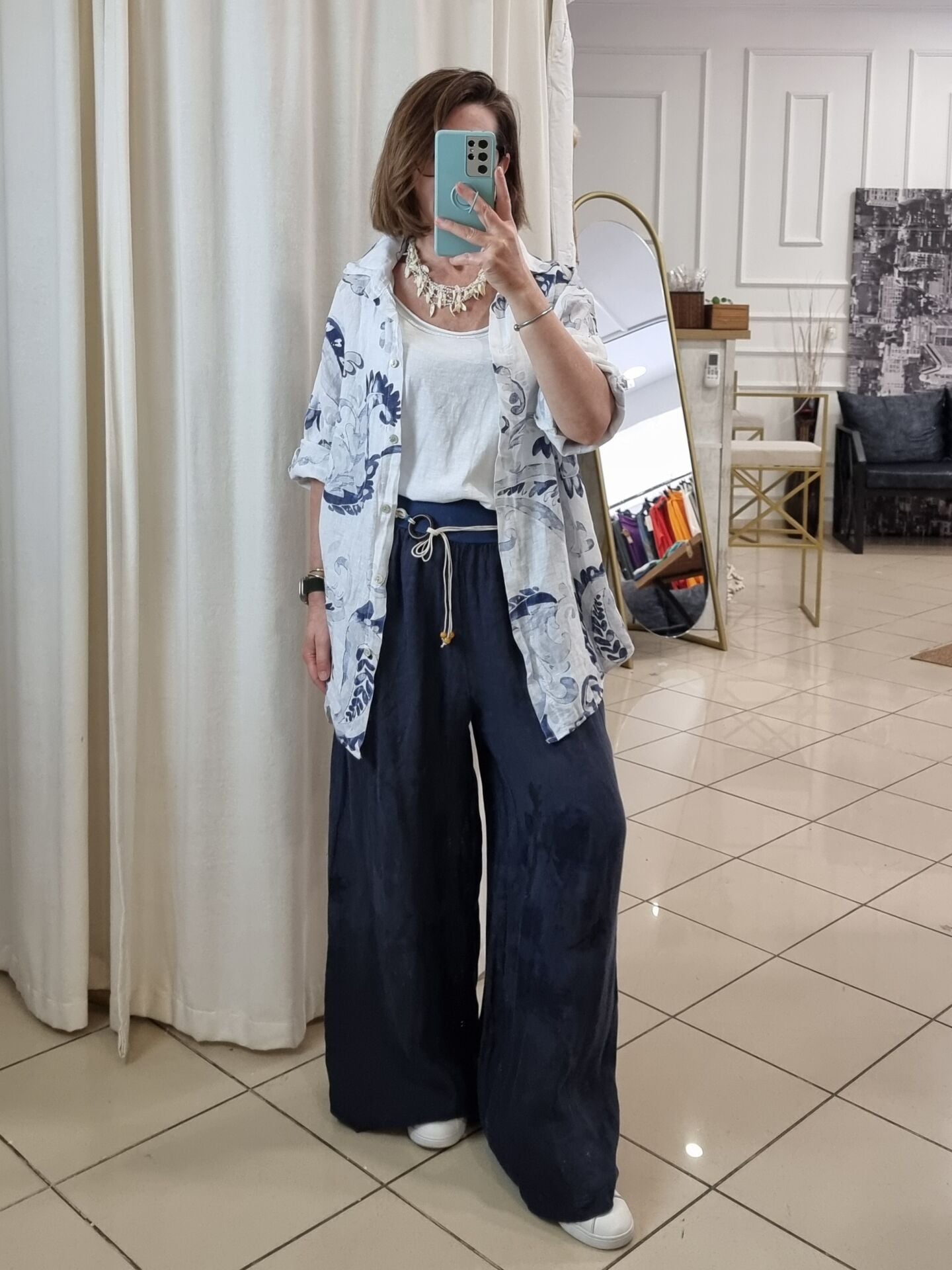 %100 keten kendinden desenli lacivert bol paça palazzo keten pantolon.