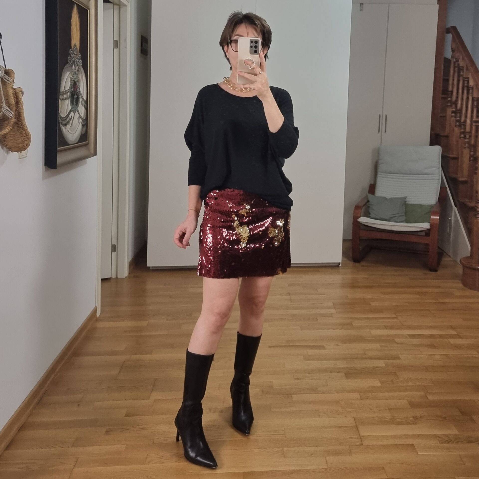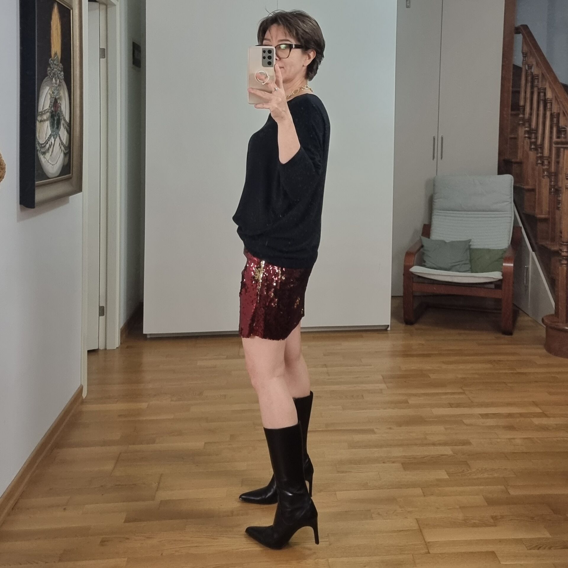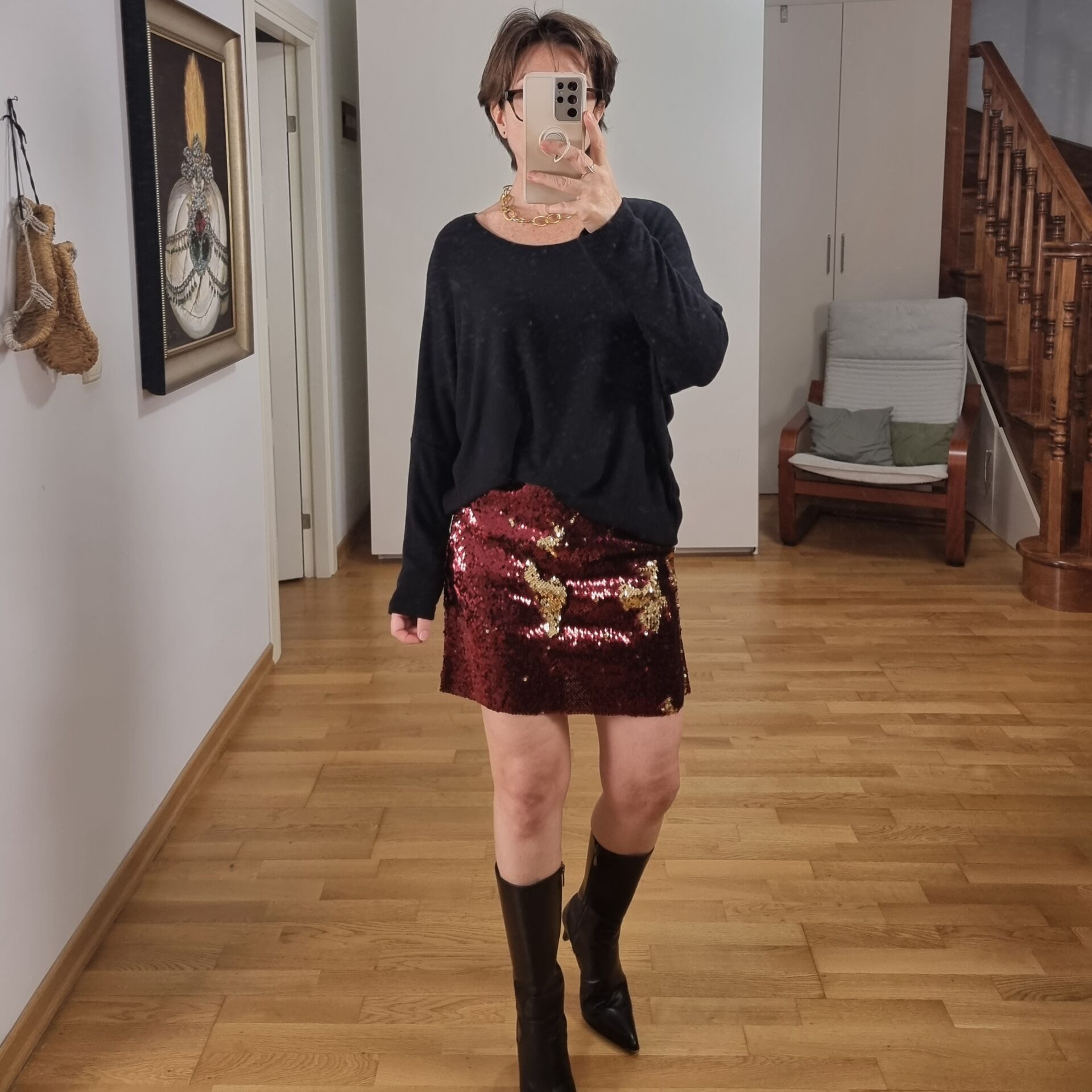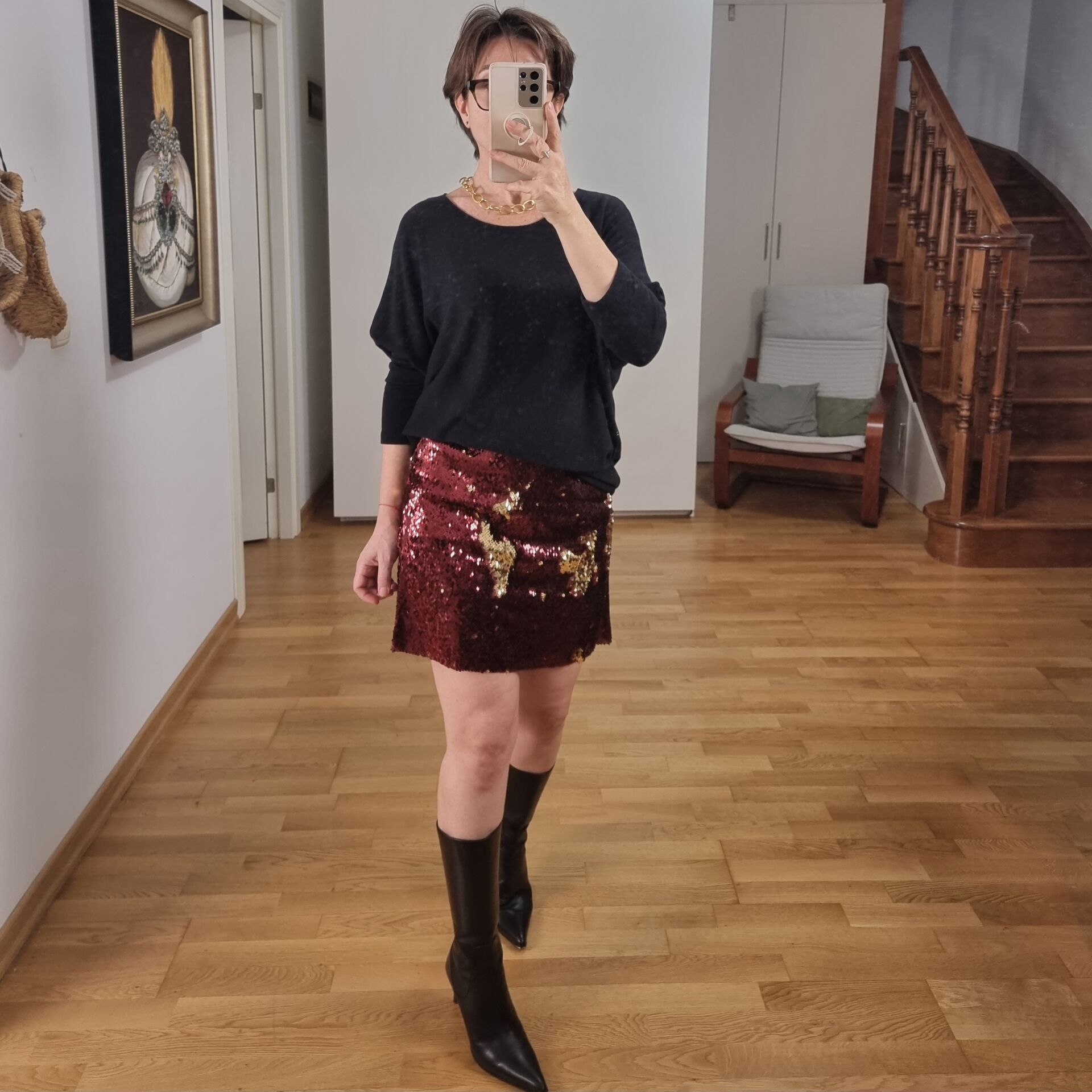Gece ışıklarını yansıtan etkileyici tasarımıyla öne çıkan pul payetli etek, çift yönlü parlak pulları sayesinde kırmızı ve sarı tonları arasında göz alıcı bir geçiş sunar. Esnek beli ve hafif genişleyen kesimiyle hareket özgürlüğü sağlar. Hem sahne ışıltısı arayanlar hem de özel günlerde fark yaratmak isteyen kadınlar için tasarlanmış bu payetli etek, güçlü stil duruşu ve eğlenceli yapısıyla tüm dikkatleri üzerine çeker.