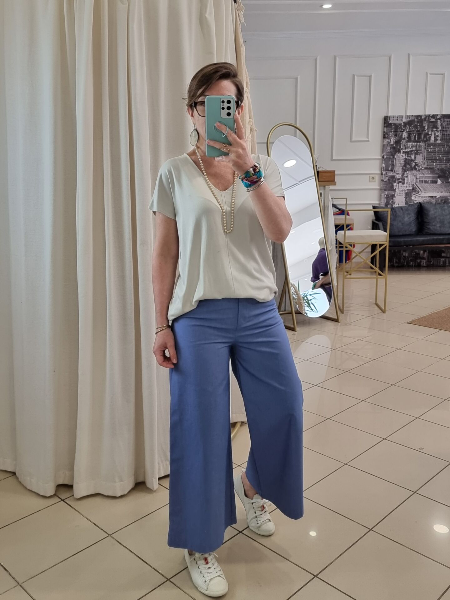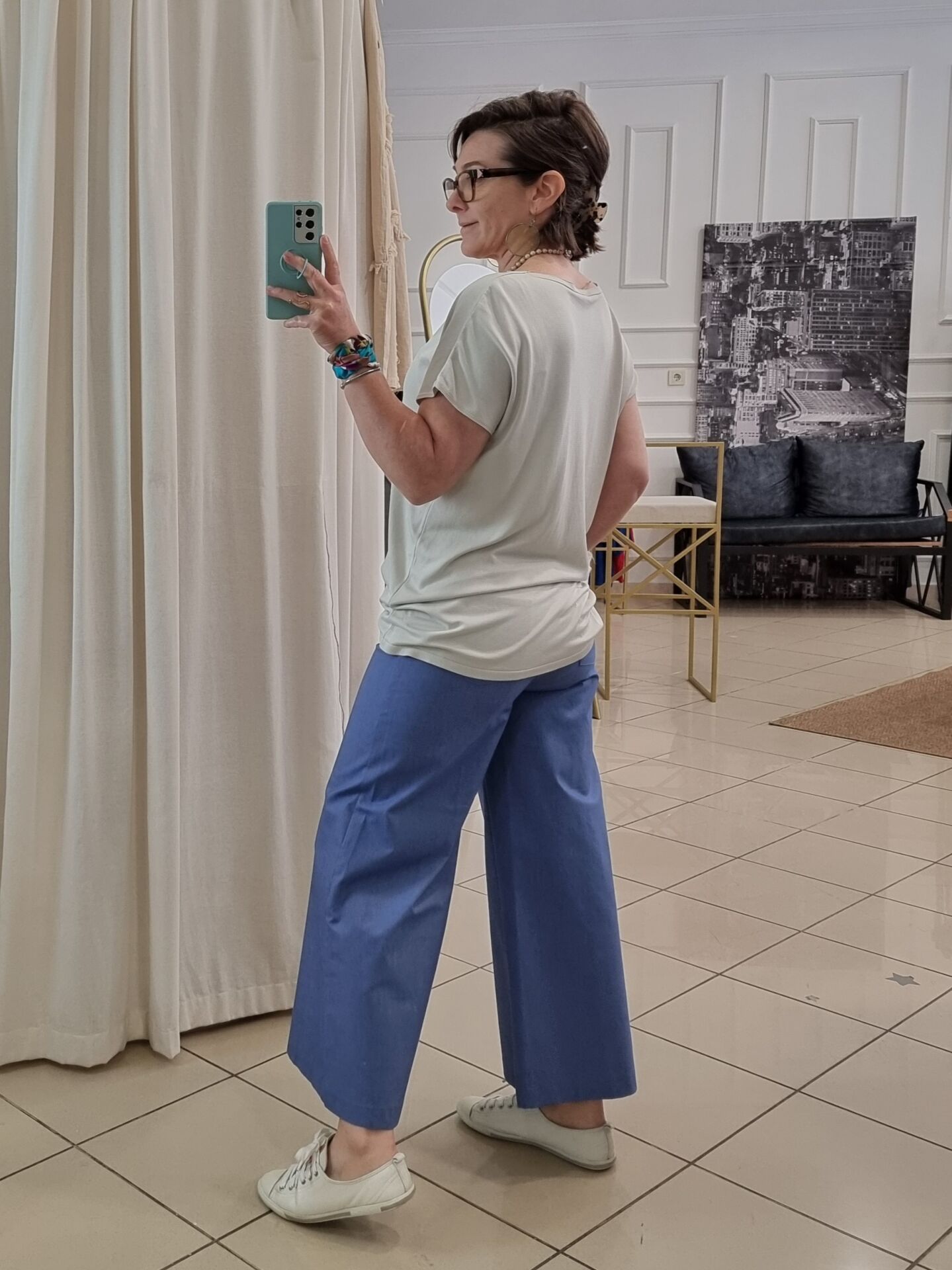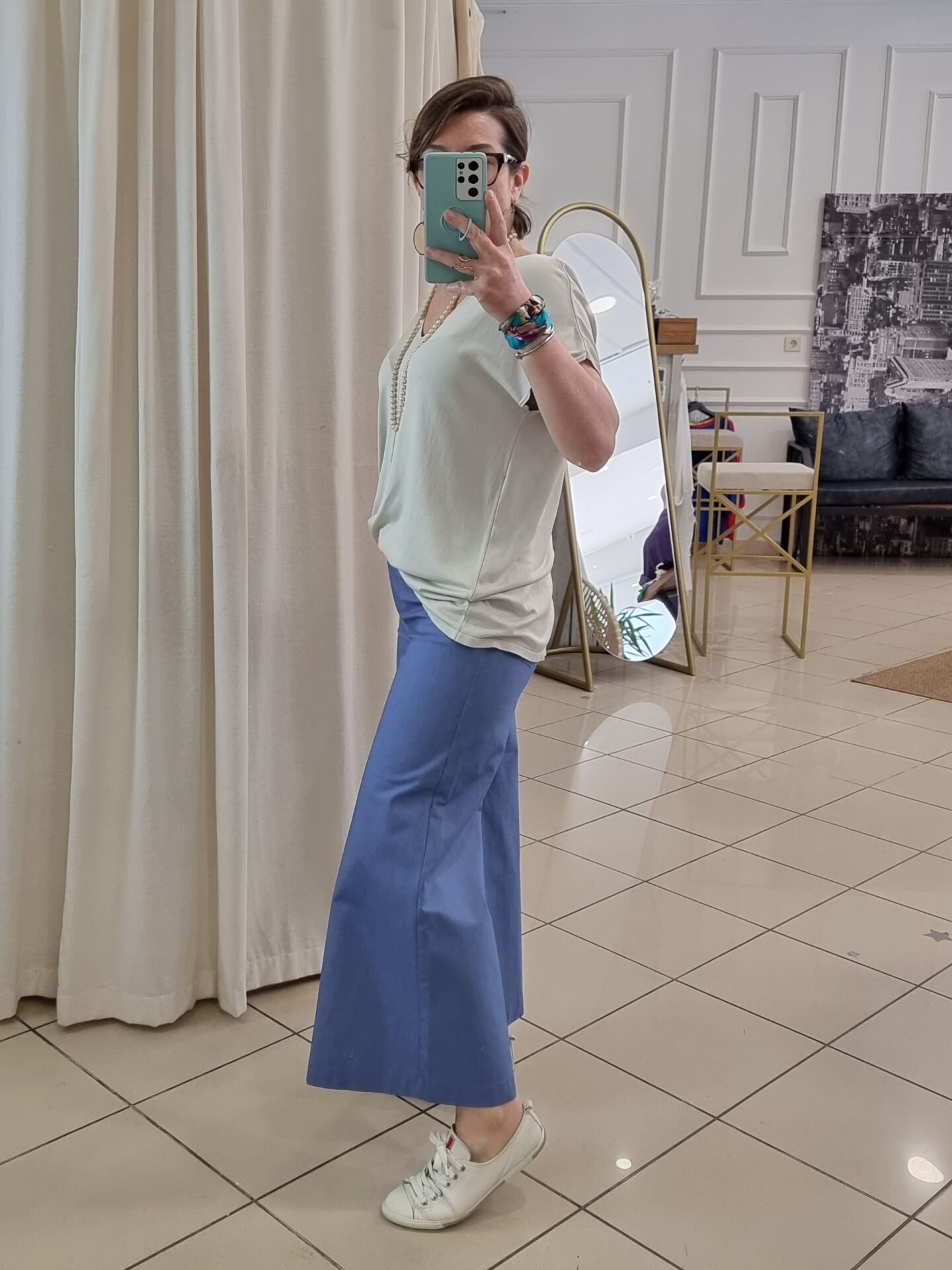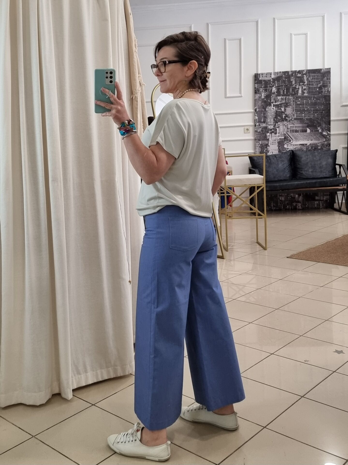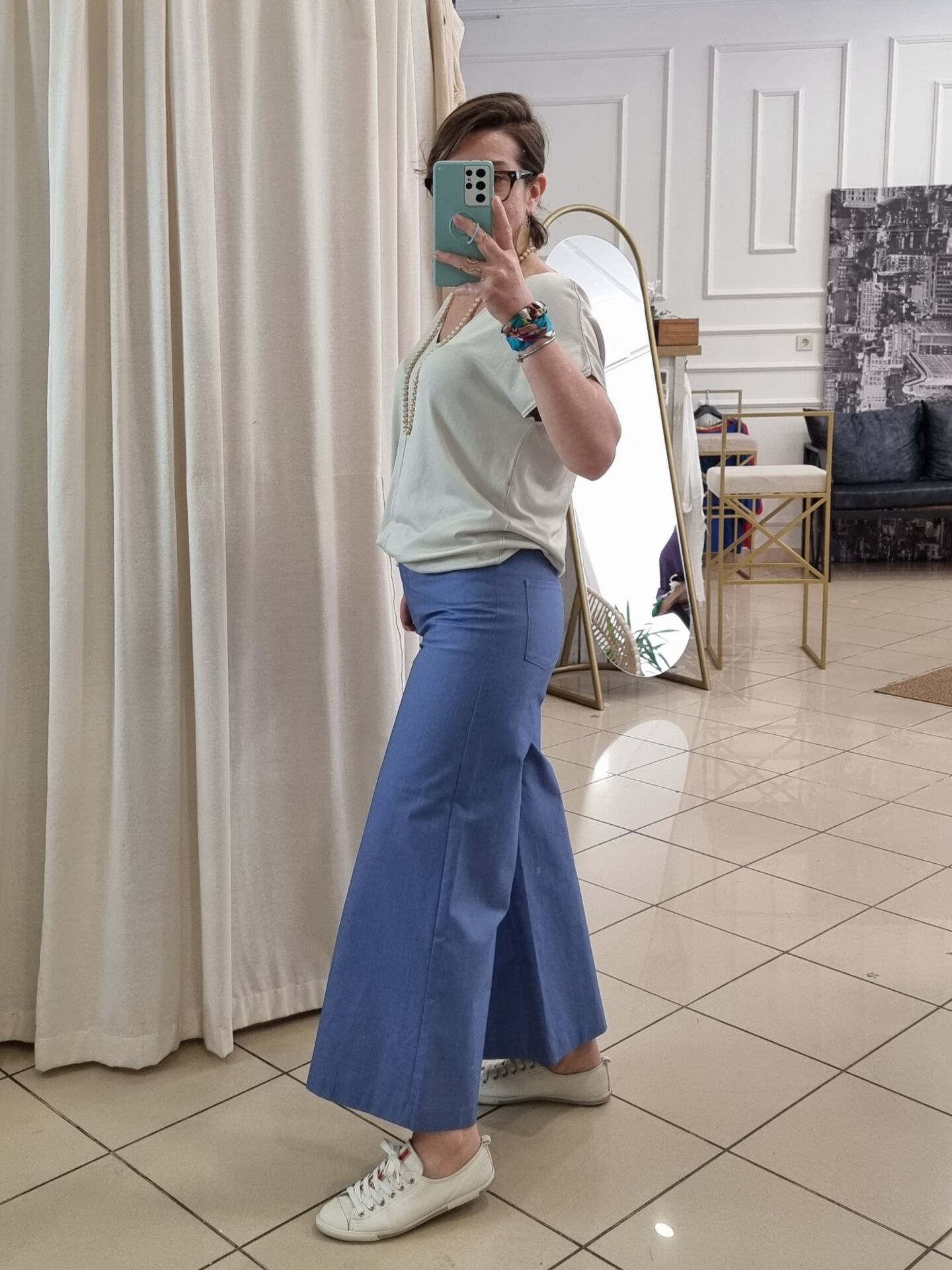 Beli oturan, kısa bol paça gabardin pantolon.