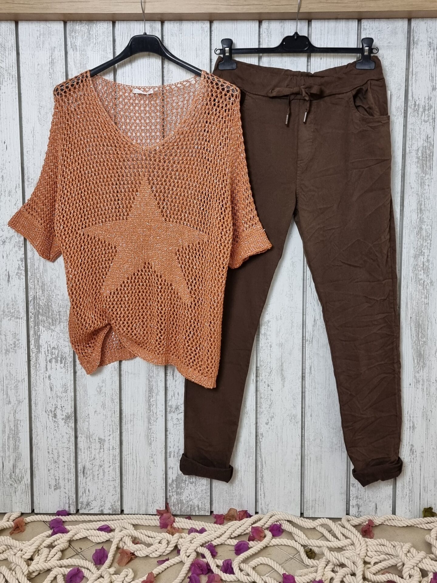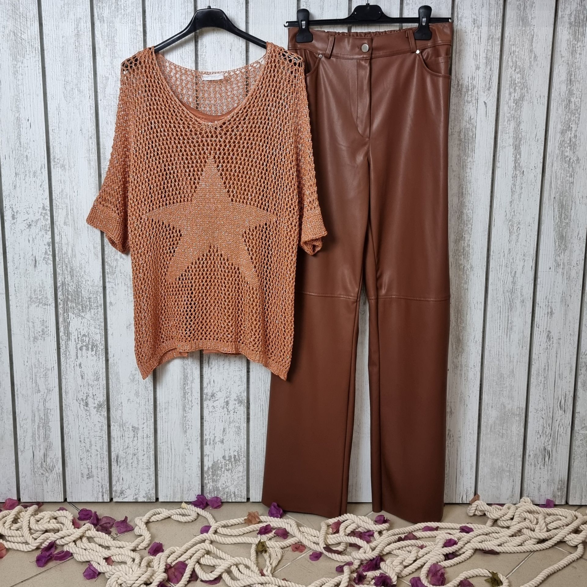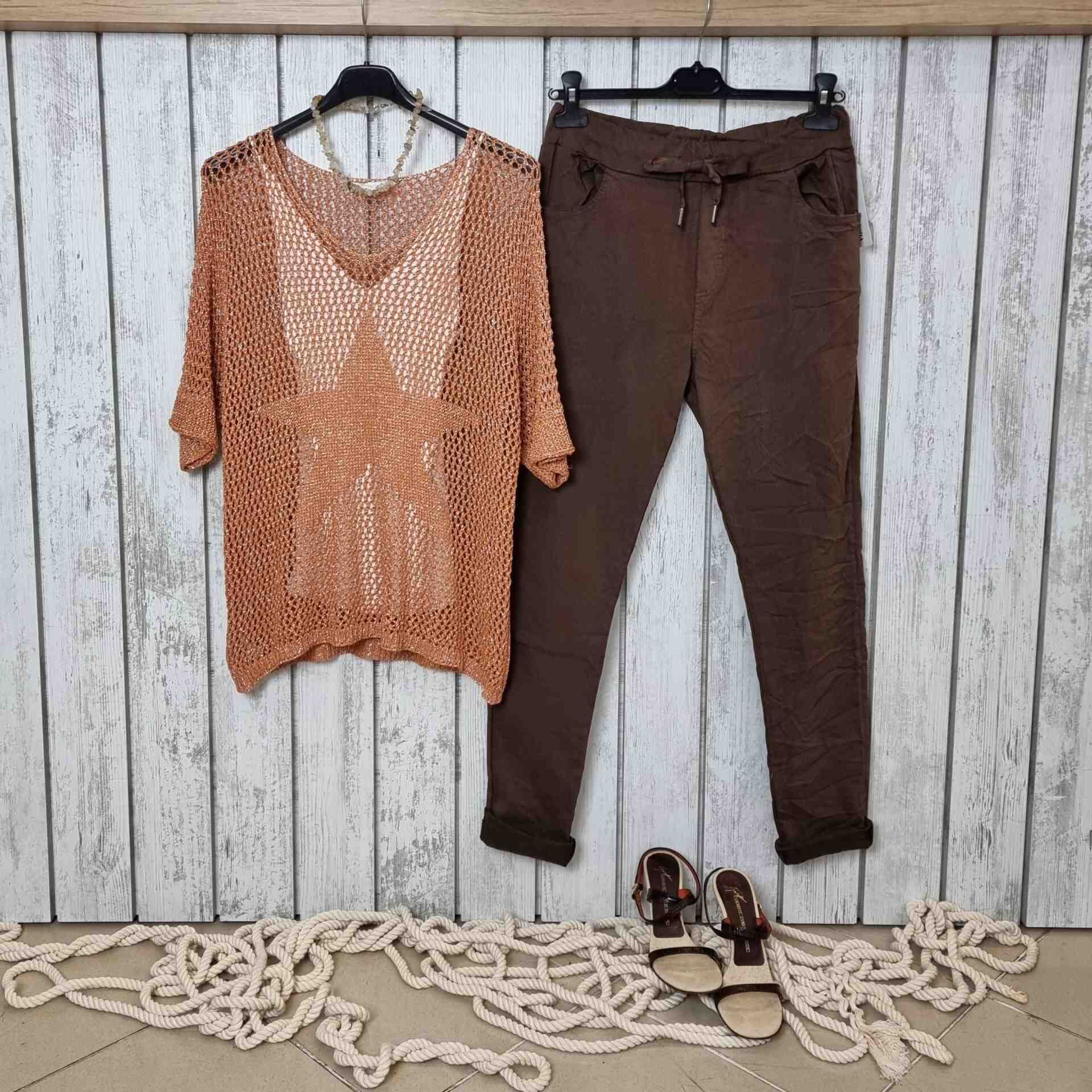 Tarçın tonunun sıcaklığıyla parlayan bu merserize bluz, hem doğallığı hem de modern ışıltıyı bir arada taşımak isteyen kadınlar için kusursuz bir tercih. File örgü yapısı ve yıldız detayı, klasik formu çağdaş bir stil haline getiriyor. V yaka kesimiyle feminen bir görünüm sunarken, esnek yapısı farklı bedenlerle uyum içinde hareket eder. Bu İtalyan tasarımı triko bluz, hem günlük kombinlerde hem de özel anlarda sade ama güçlü bir duruş sergiler.