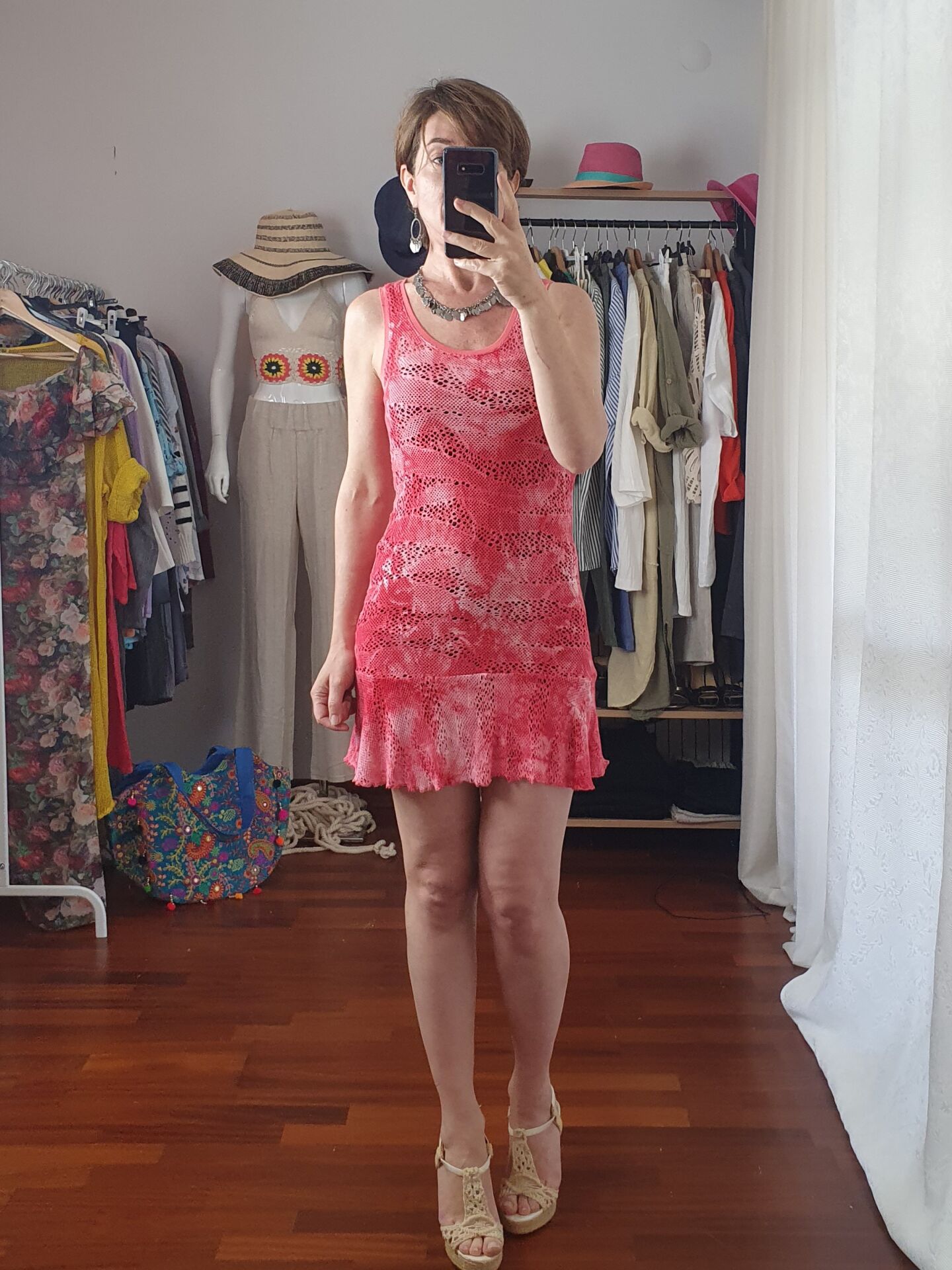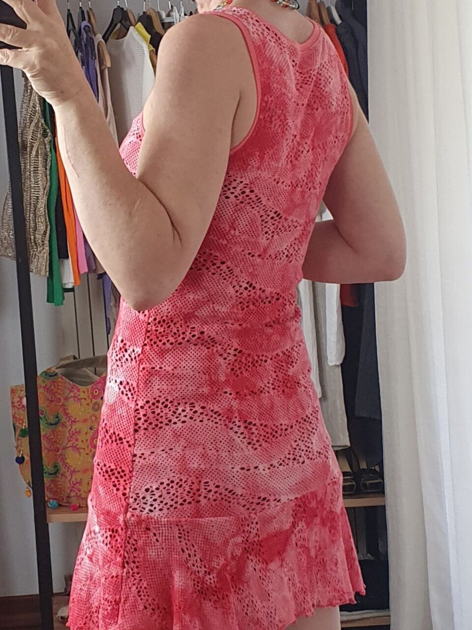 Fuşya file elbise. Mini plaj elbisesi. Esnek dokuma. Slim fit.