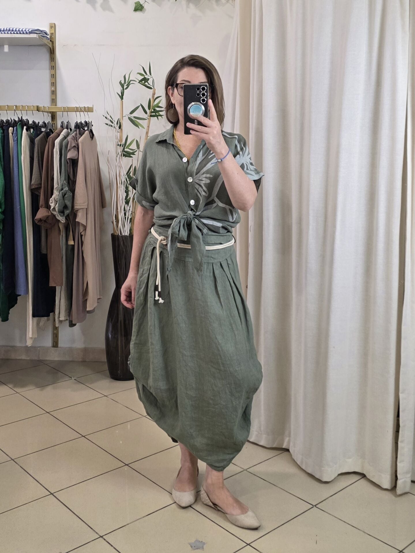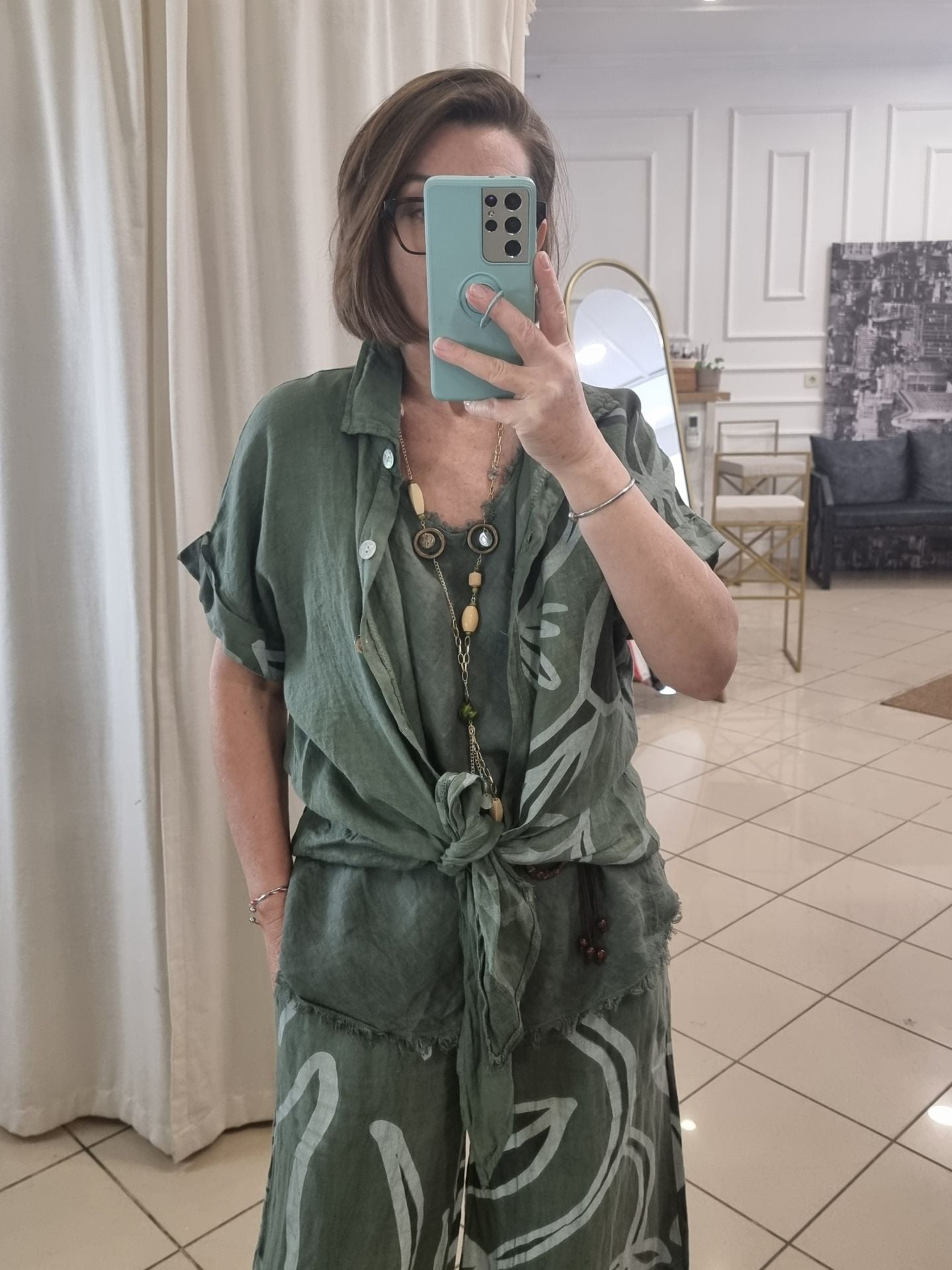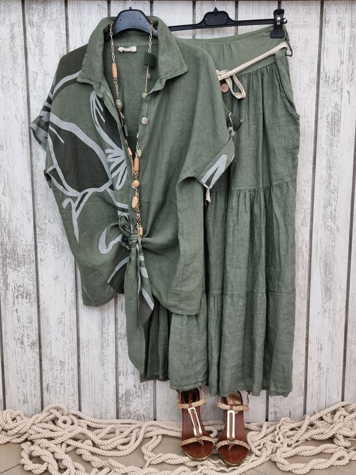 Önü bağlamalı haki desenli keten gömlek.