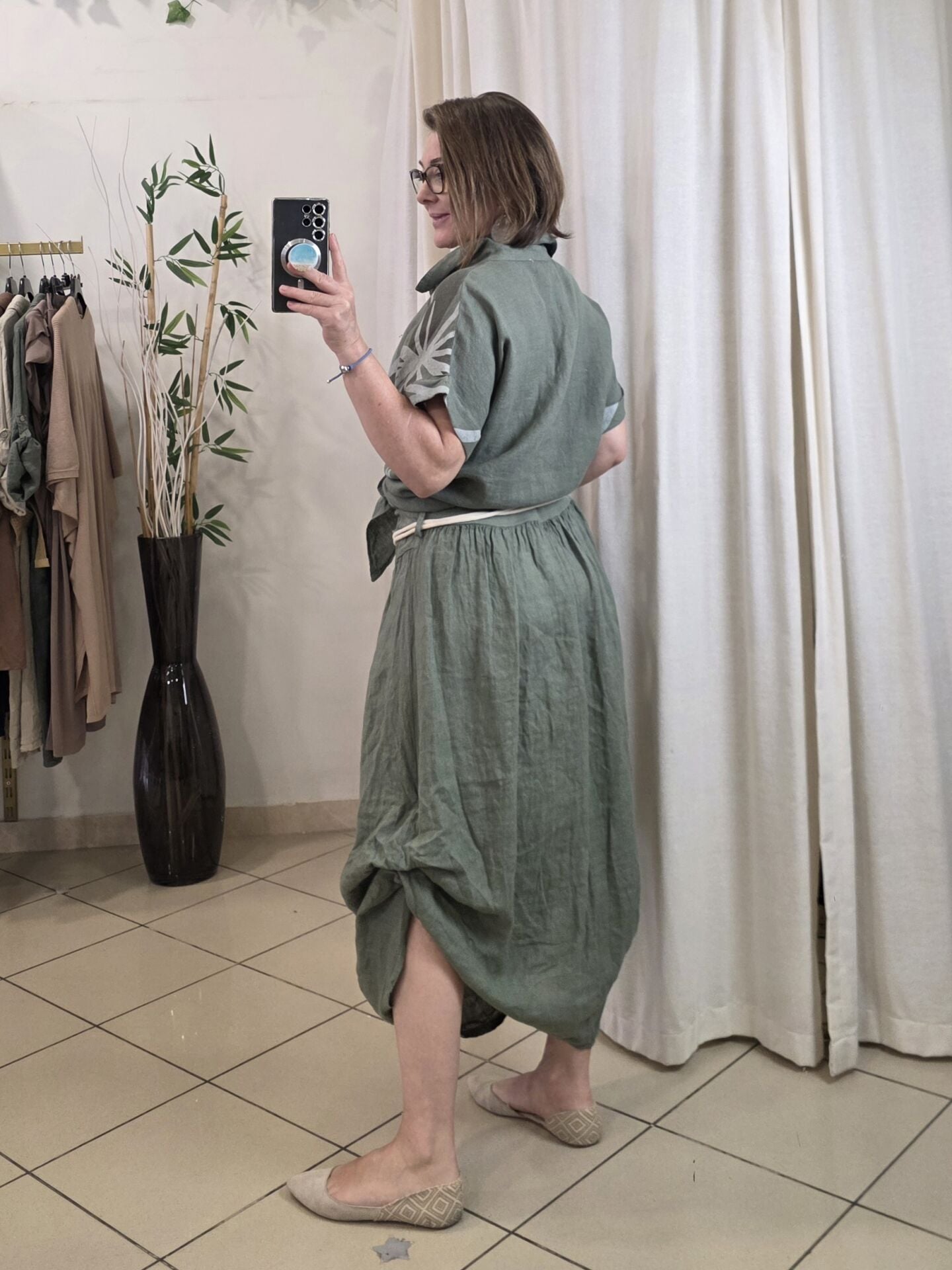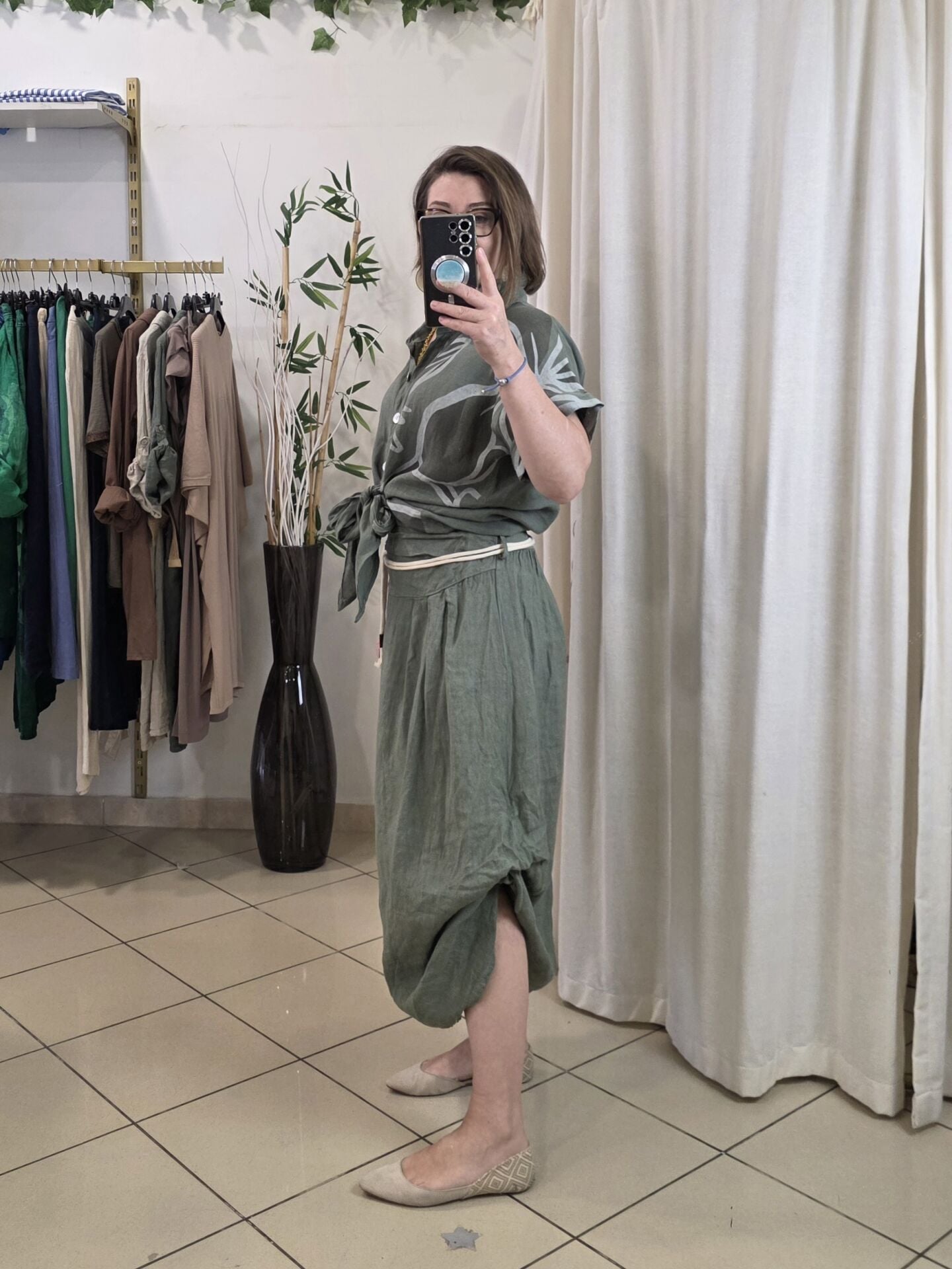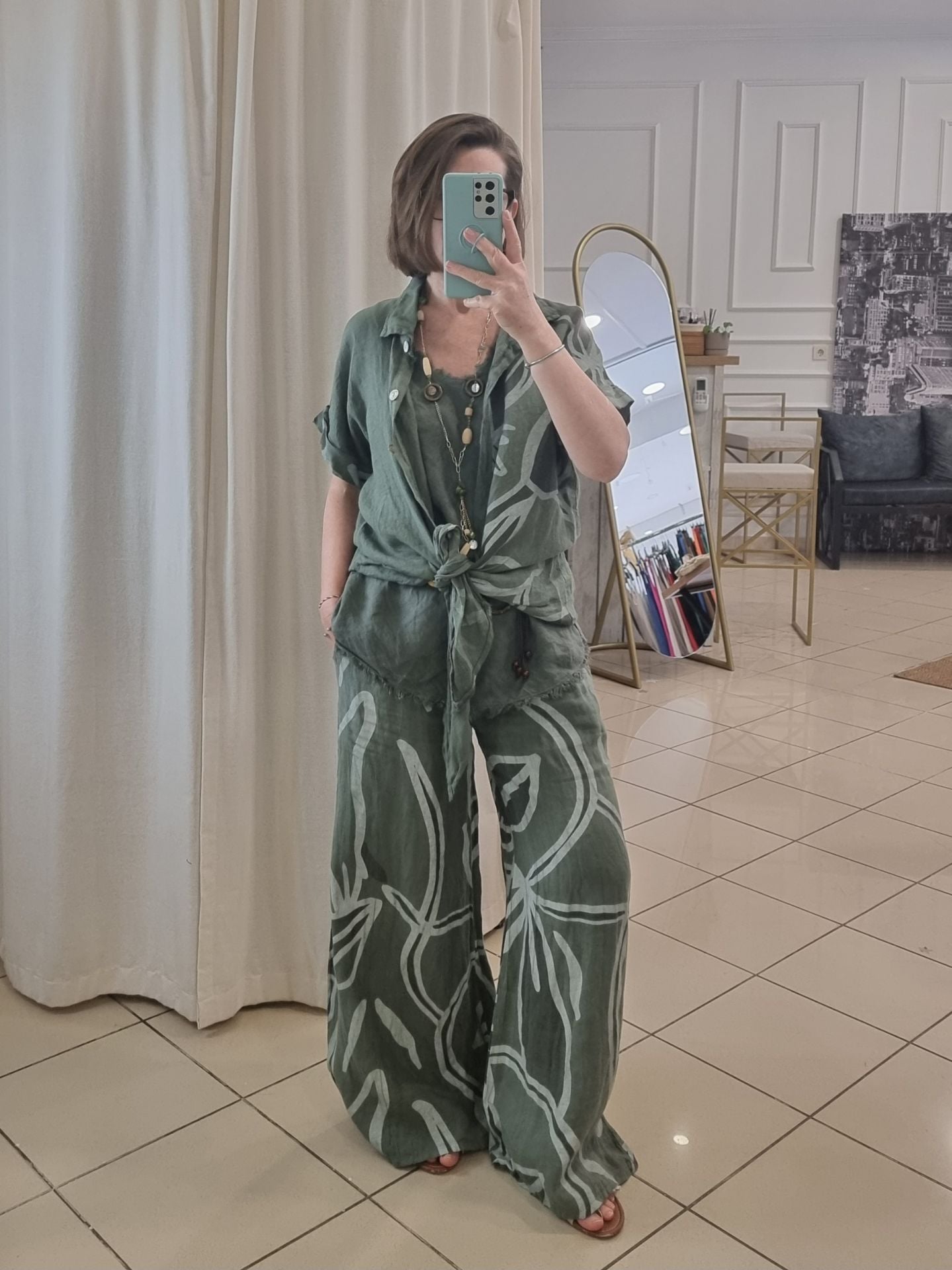 Önü bağlamalı haki desenli keten gömlek.