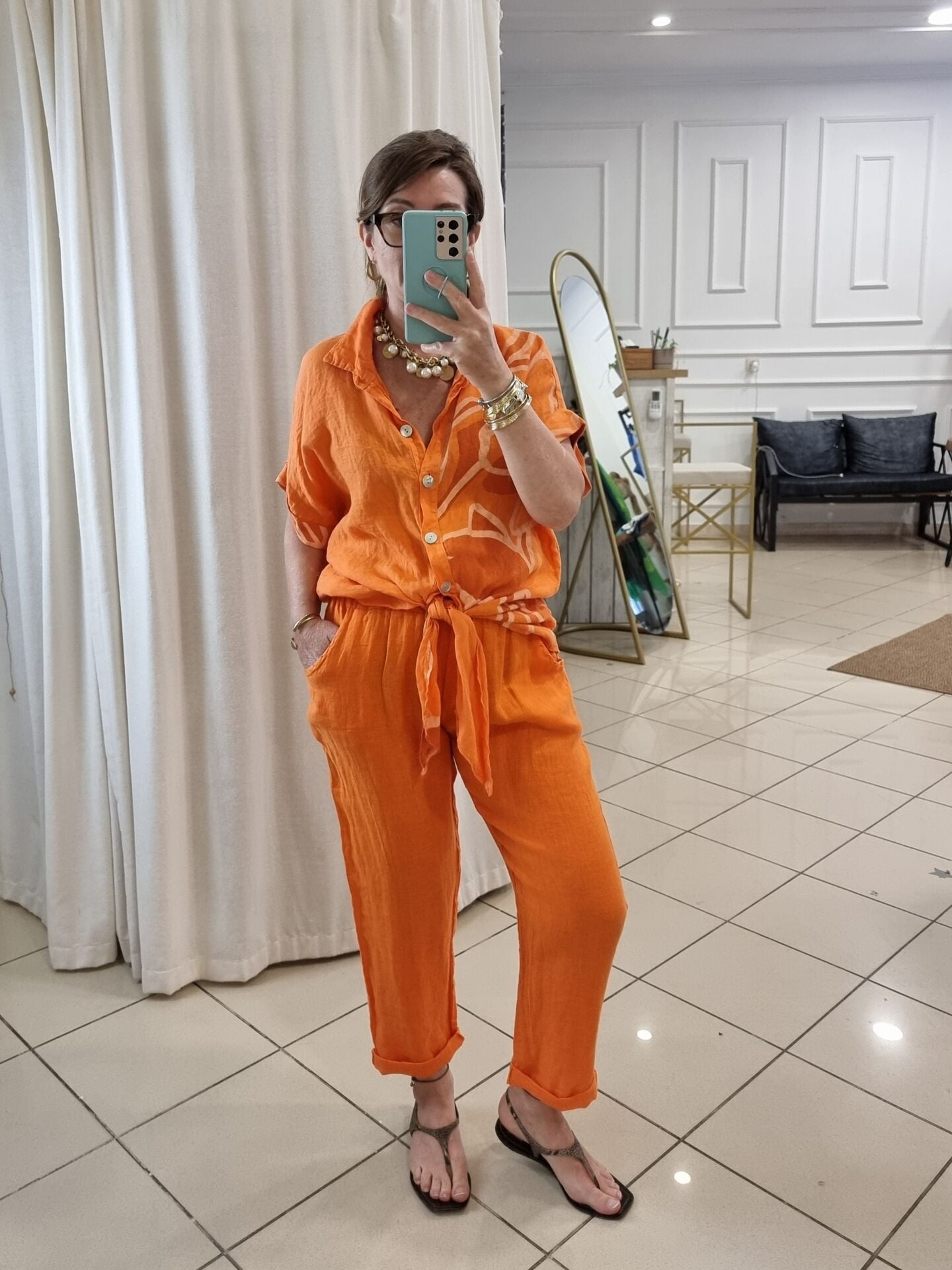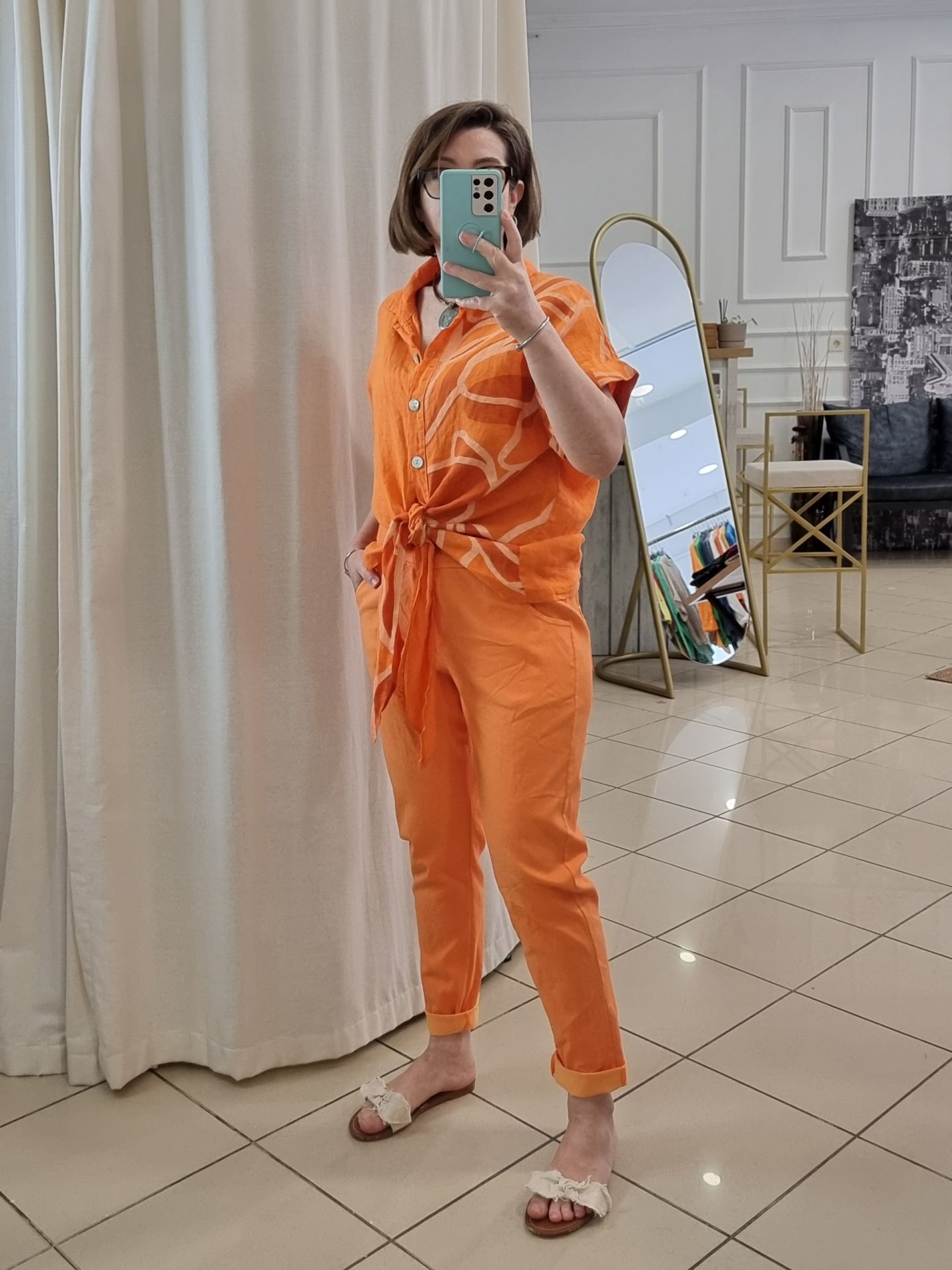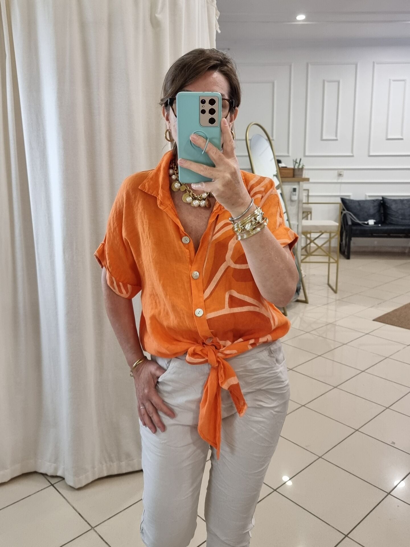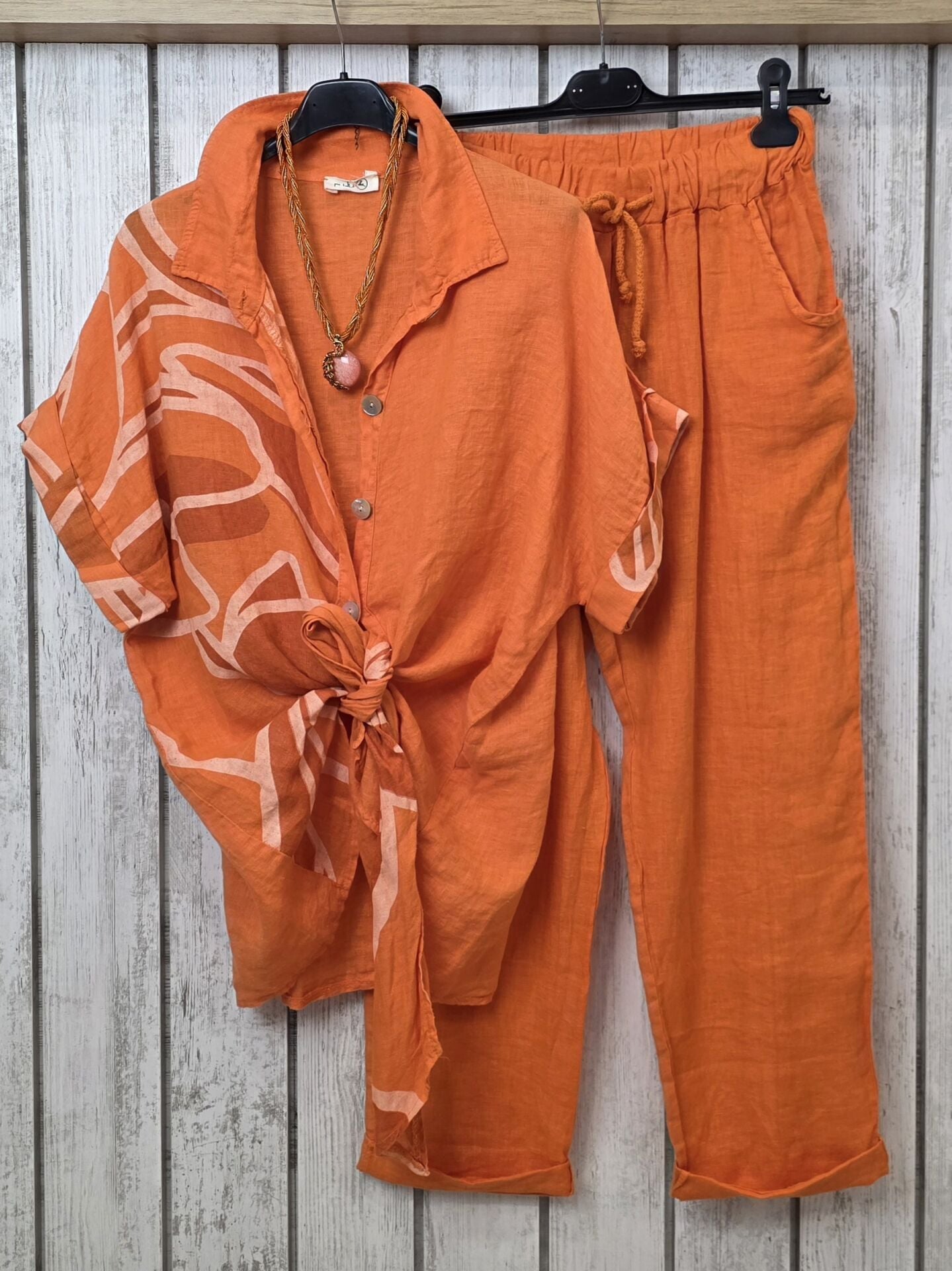 Önü bağlamalı turuncu desenli keten gömlek.