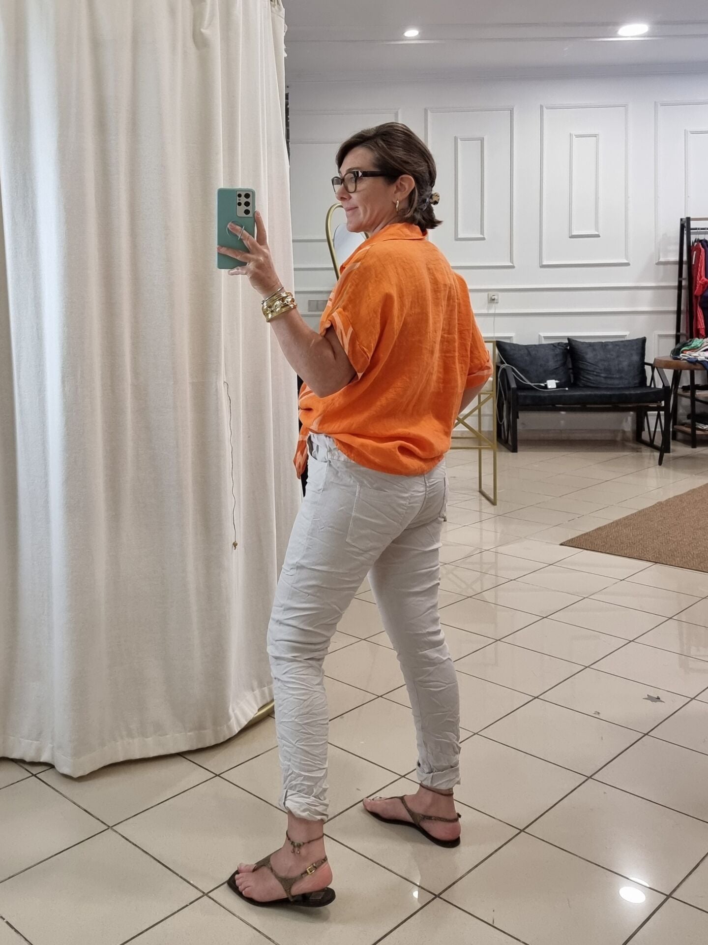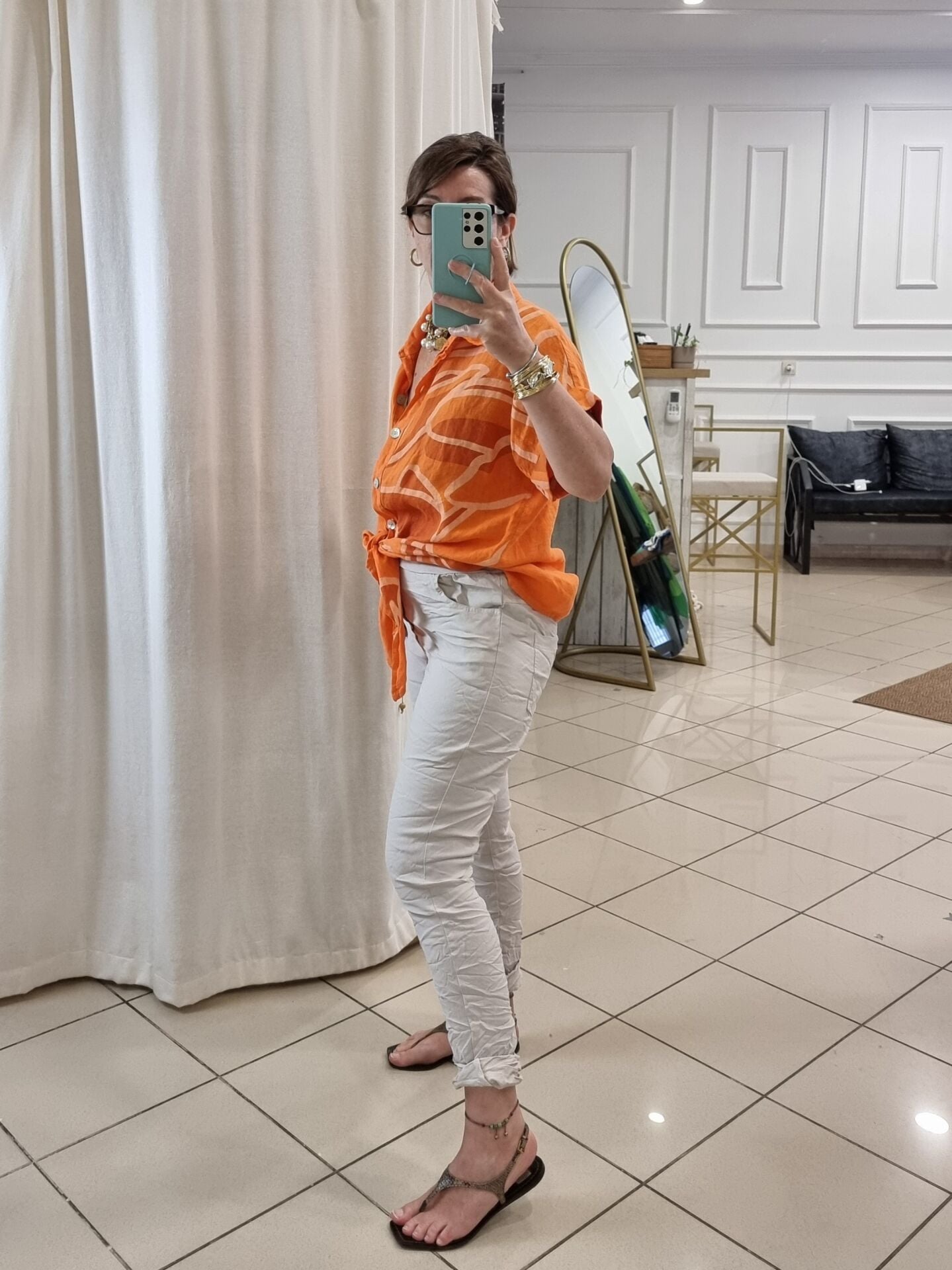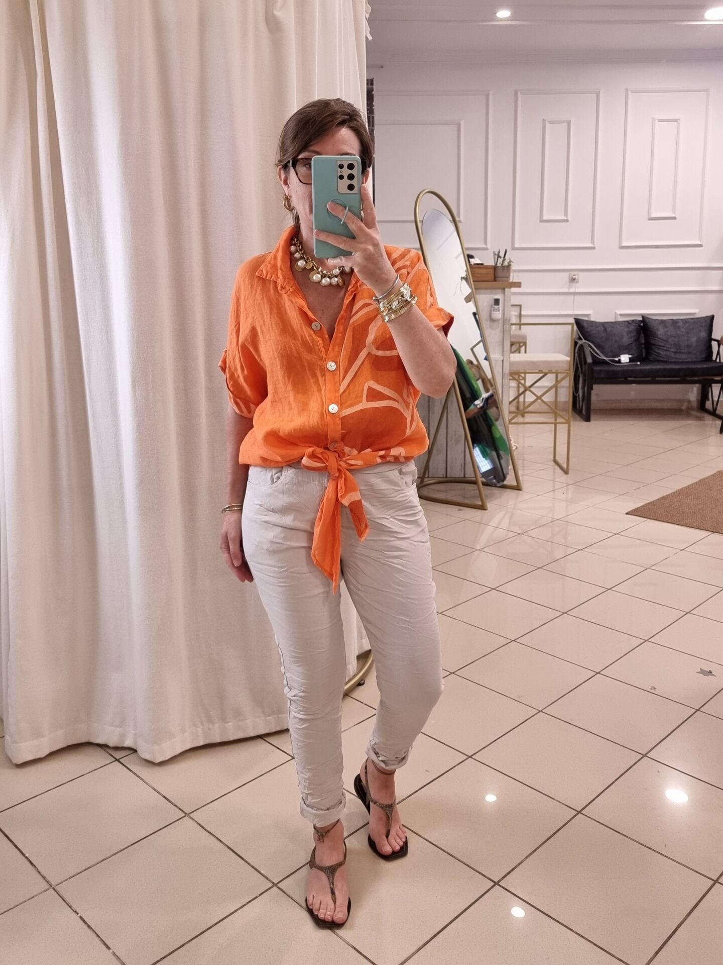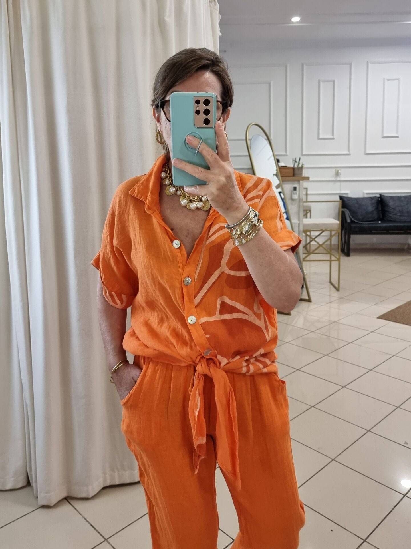 Önü bağlamalı turuncu desenli keten gömlek.