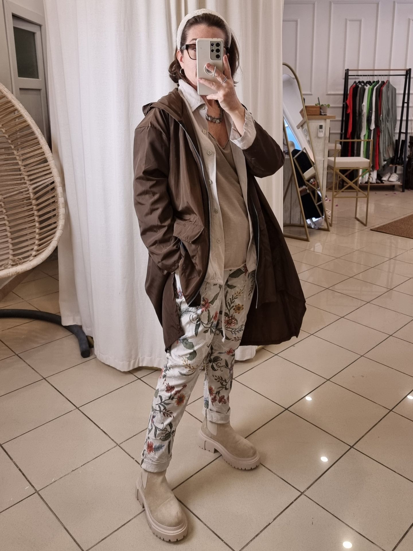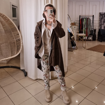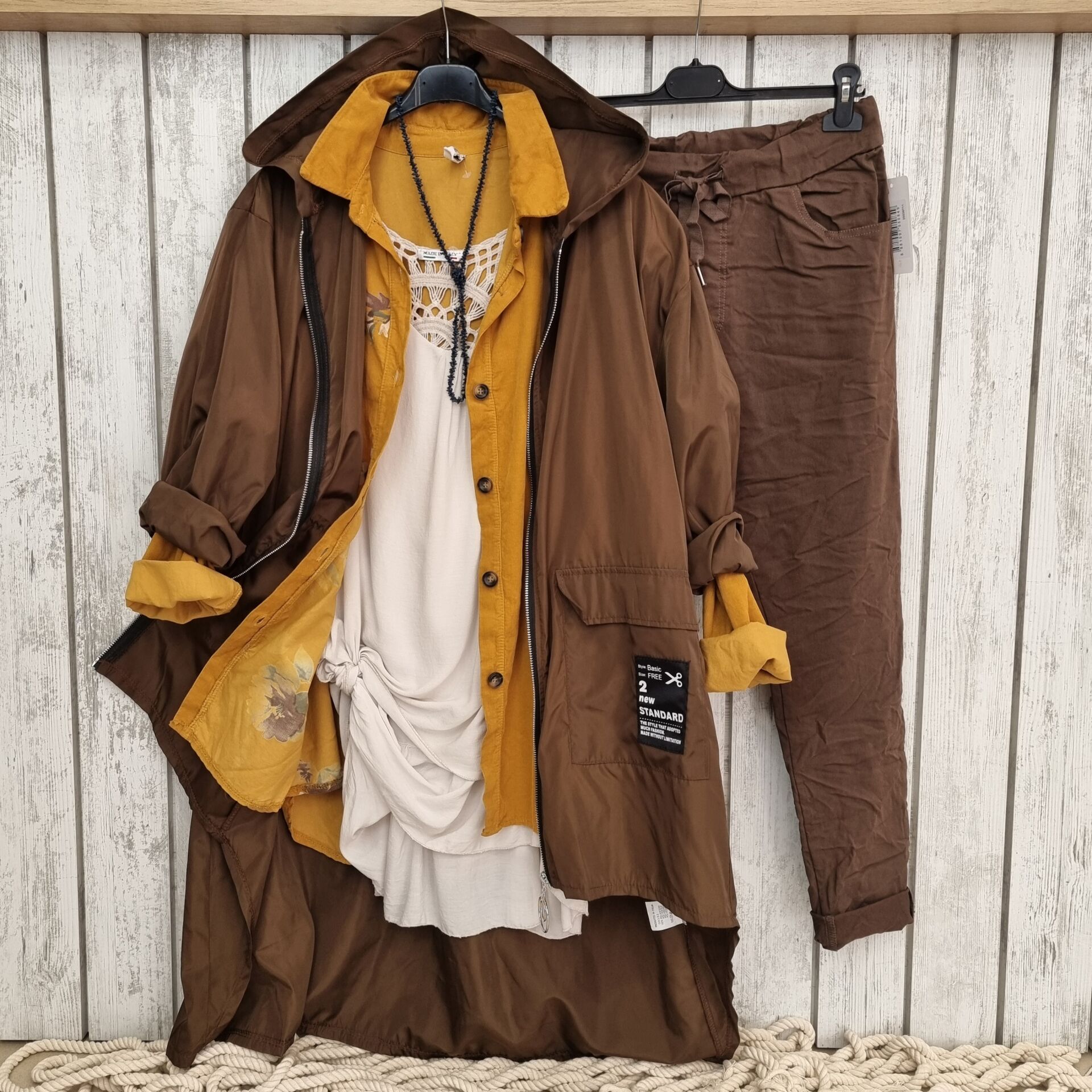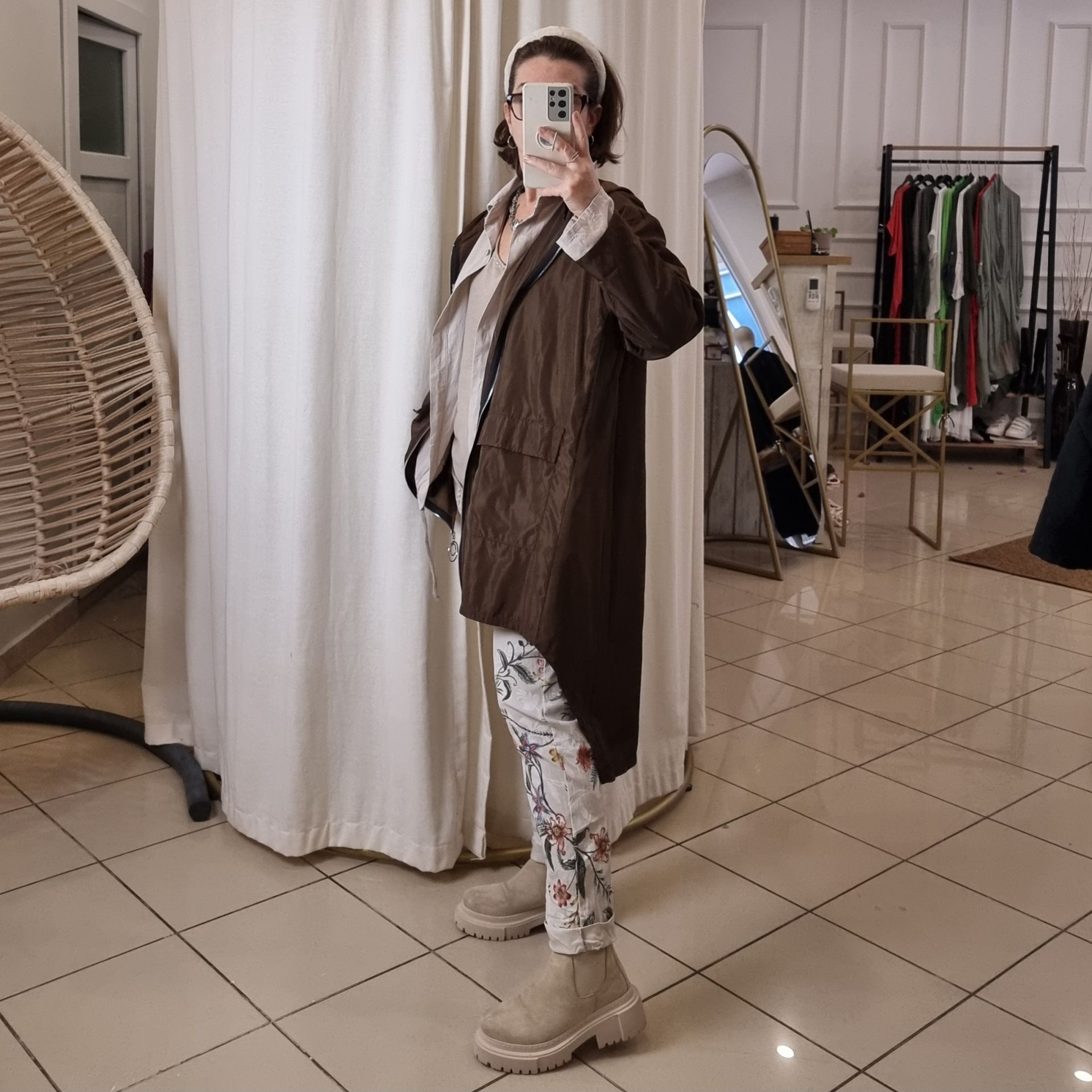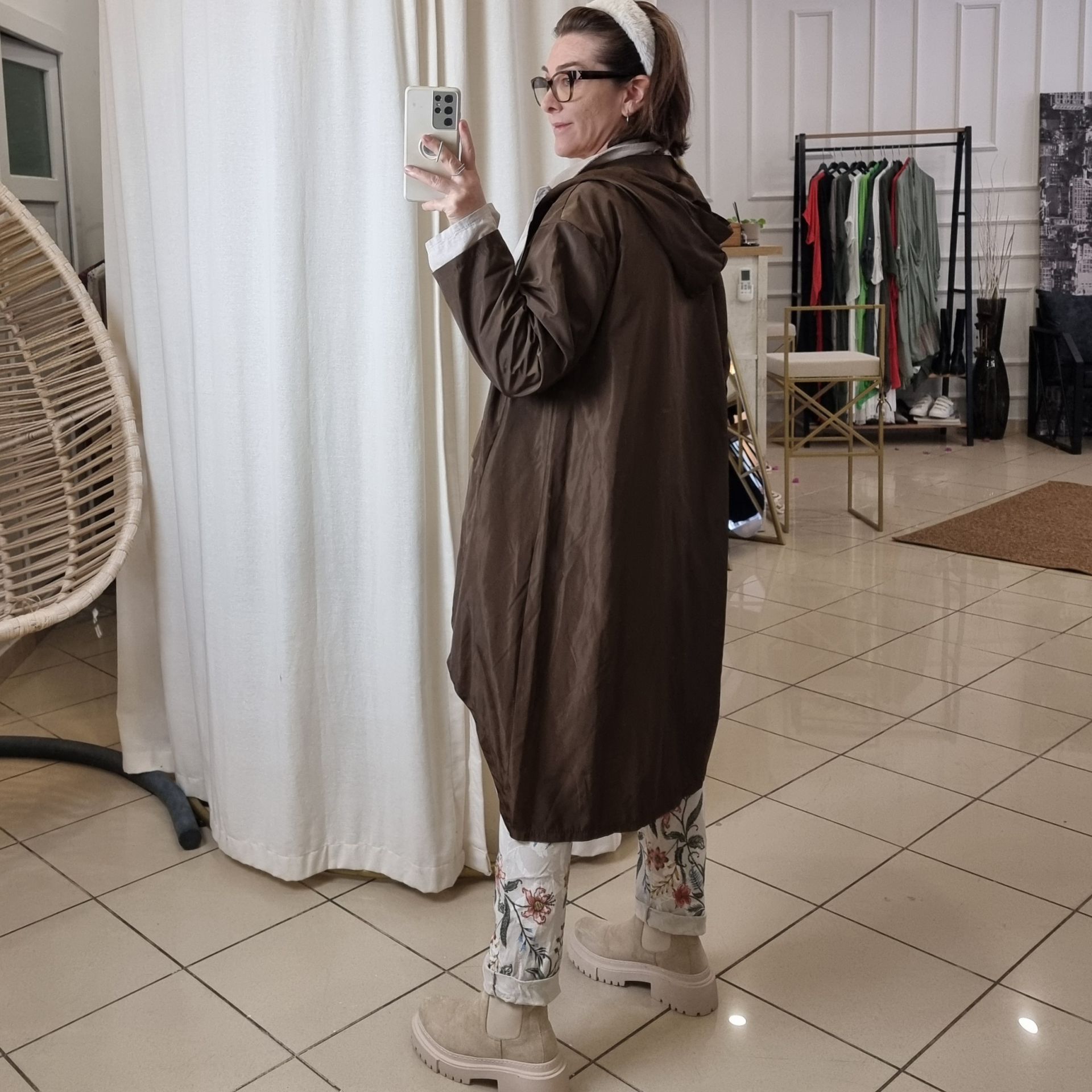 Şehirli ve dinamik kadınlar için tasarlanan bu kahverengi yağmurluk, oversize formu ve su geçirmez yapısıyla gün boyu konfor sunar. İtalyan kalıbıyla dikkat çeken tasarım, önde yer alan fermuar ve kapaklı cep detaylarıyla işlevselliği artırırken; arkası uzun kesimiyle modern bir silüet oluşturur. Kapüşonu sayesinde ani hava değişimlerine karşı hazırlıklı olmanızı sağlar. Her bedene uyumlu bu yağmurluk, stilinden ödün vermeyen kadınlar için kurtarıcı bir dış giyim parçasıdır.