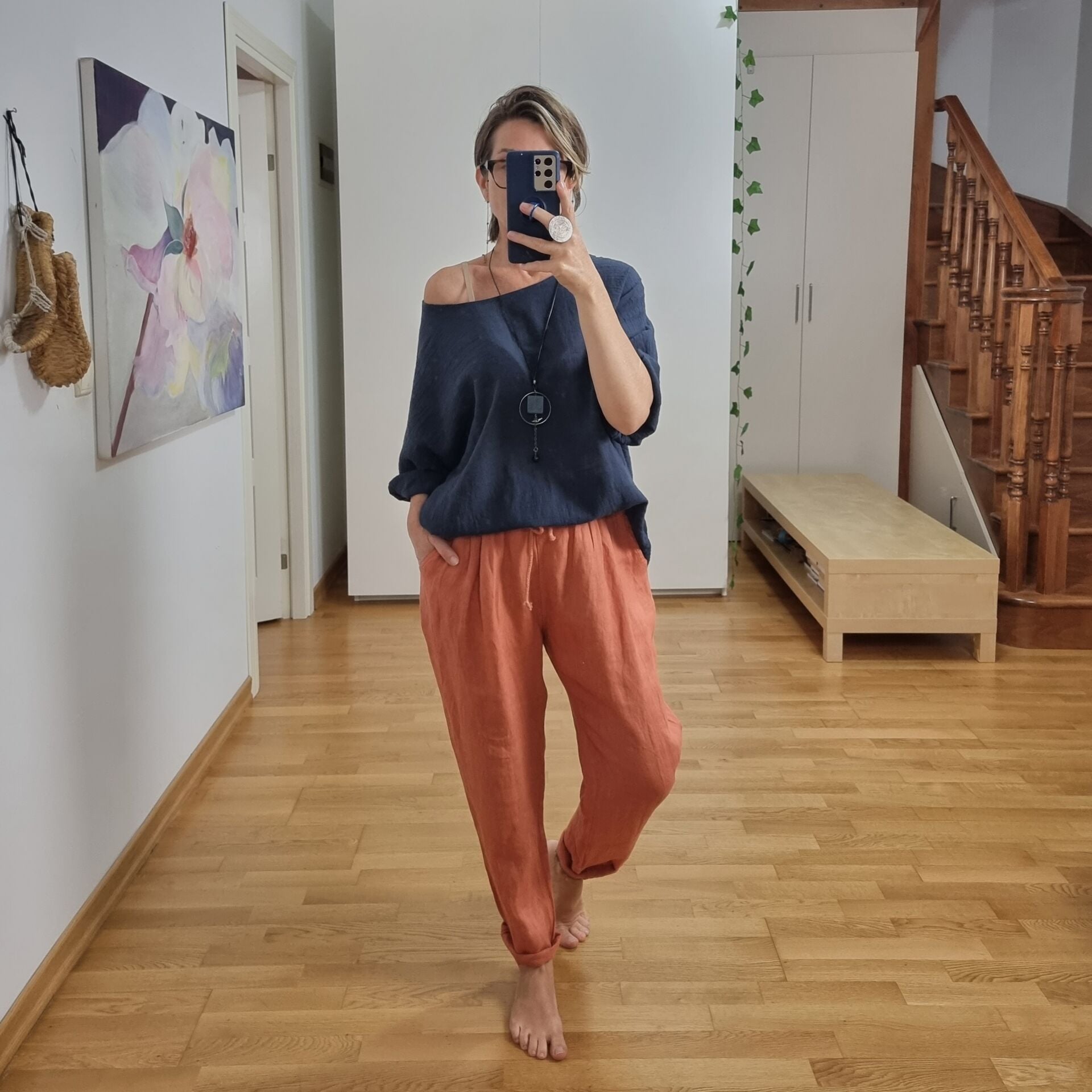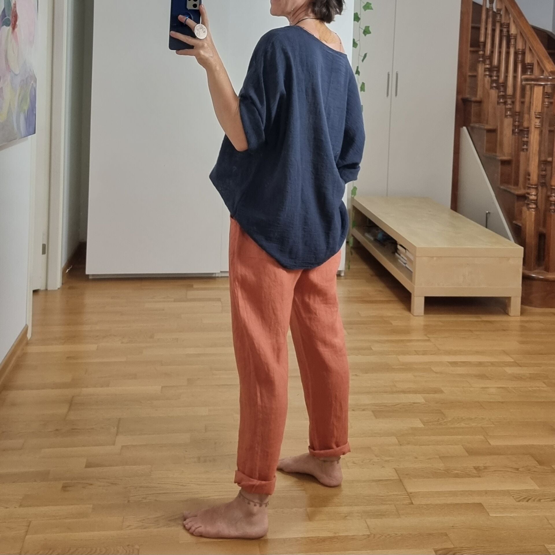 Derinliğiyle zarafeti buluşturan lacivert oversize müslin bluz, sade stilin güçlü bir ifadesi. %100 pamuklu, ince ve nefes alabilir kumaşı sayesinde gün boyu serinlik hissi sunar. Bol kesimi ve eksik kol detayıyla rahatlığı estetik bir çizgiye dönüştürür. Gündüzden geceye geçişi kolaylaştıran bu müslin bluz, gösterişten uzak ama etkileyici bir duruş arayan kadınların kombinlerinde sessiz bir yıldız gibi parlar.