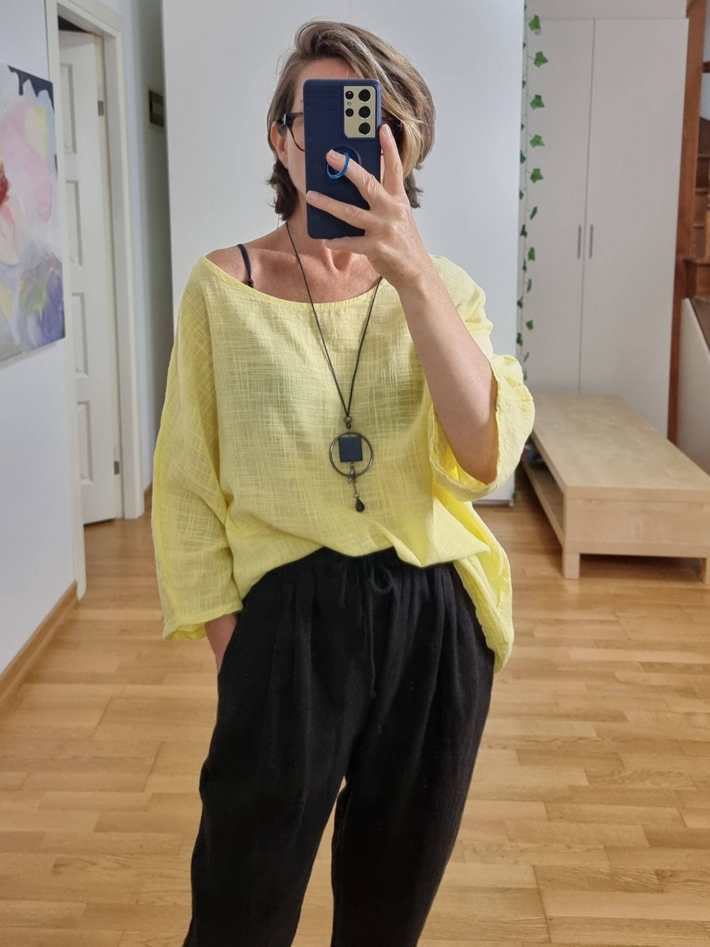 Güneşin enerjisini üzerinizde taşımak isteyen kadınlar için tasarlanan bu sarı oversize müslin bluz, pozitifliği ve hafifliği bir arada sunuyor. %100 pamuk dokusu, gün boyu nefes alan bir konfor sağlarken, bol kesimiyle her bedene özgürlük tanıyor. Eksik kol detayı yazın sıcaklığına uyum sağlarken, canlı rengi modunuzu anında yukarı taşır. Bu müslin bluz, neşeli ve dinamik kadınların sade ama etkili stilini tamamlayan favori parçası olacak.