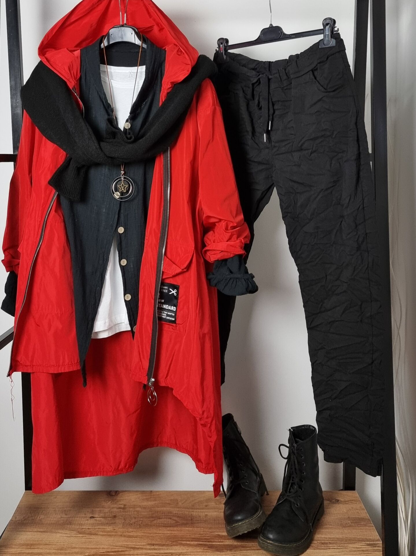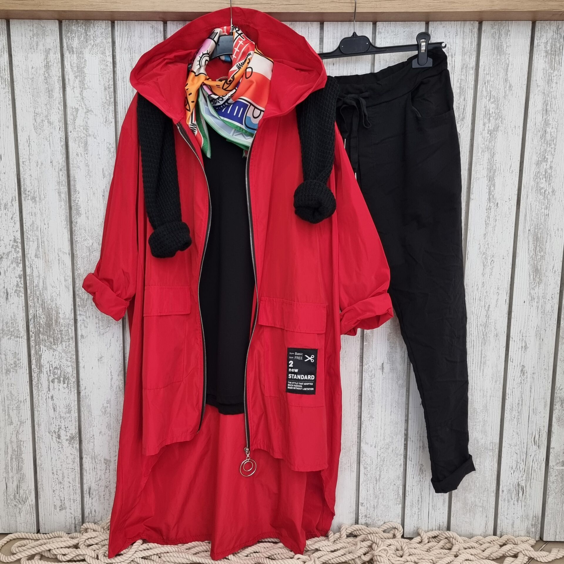 Cesur bir stilin habercisi olan bu kırmızı oversize yağmurluk, gri gökyüzüne inat canlılığıyla dikkat çeker. İtalyan dokunuşu taşıyan tasarımı, kapüşon ve cepli detaylarıyla pratikliği ön planda tutarken; önü kısa, arkası uzun kesimiyle sokak modasında enerjik bir imza bırakır. Tüm bedenlerle uyumlu rahat kalıbı sayesinde yalnızca yağmurdan değil, sıradanlıktan da korur. Bu yağmurluk, özgüvenli kadınların şehir temposuna attığı cesur bir adımdır.