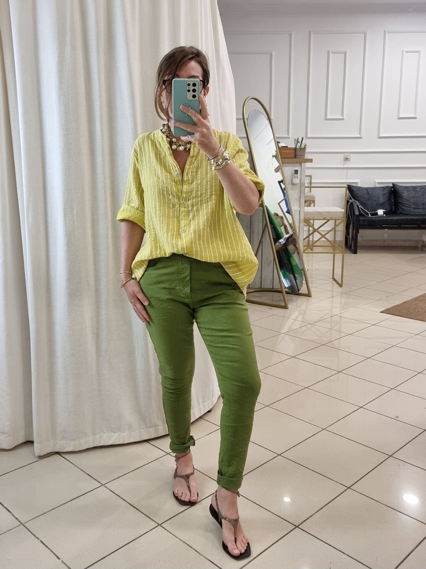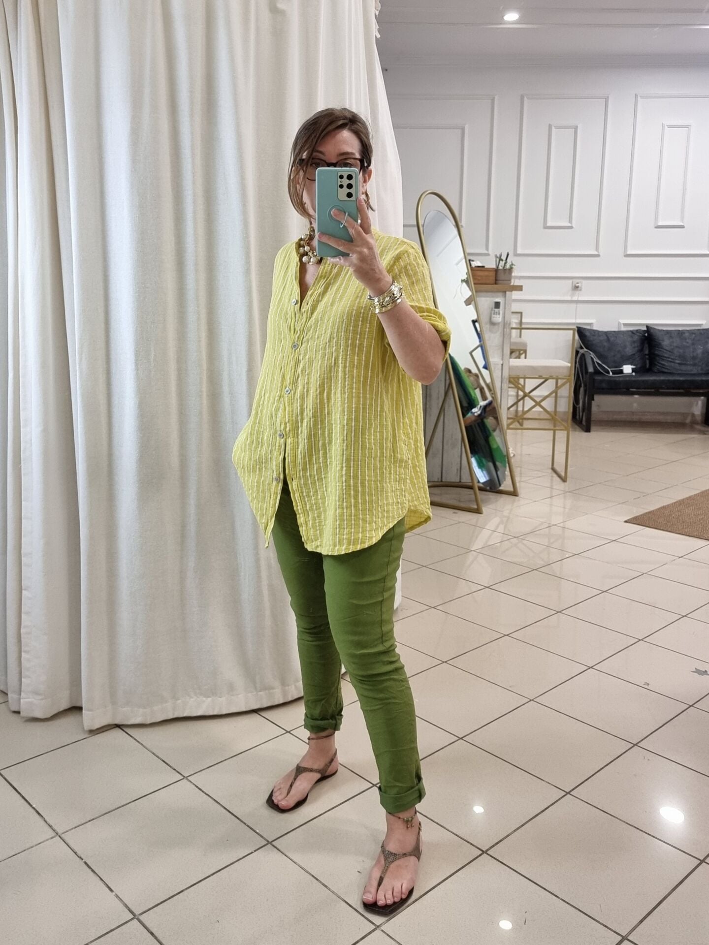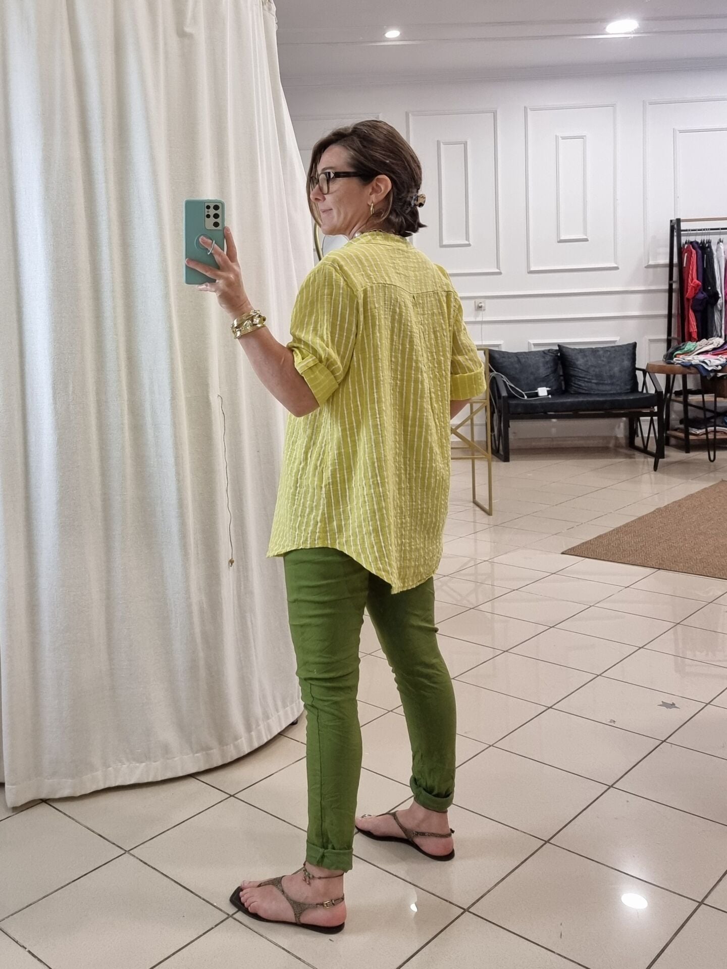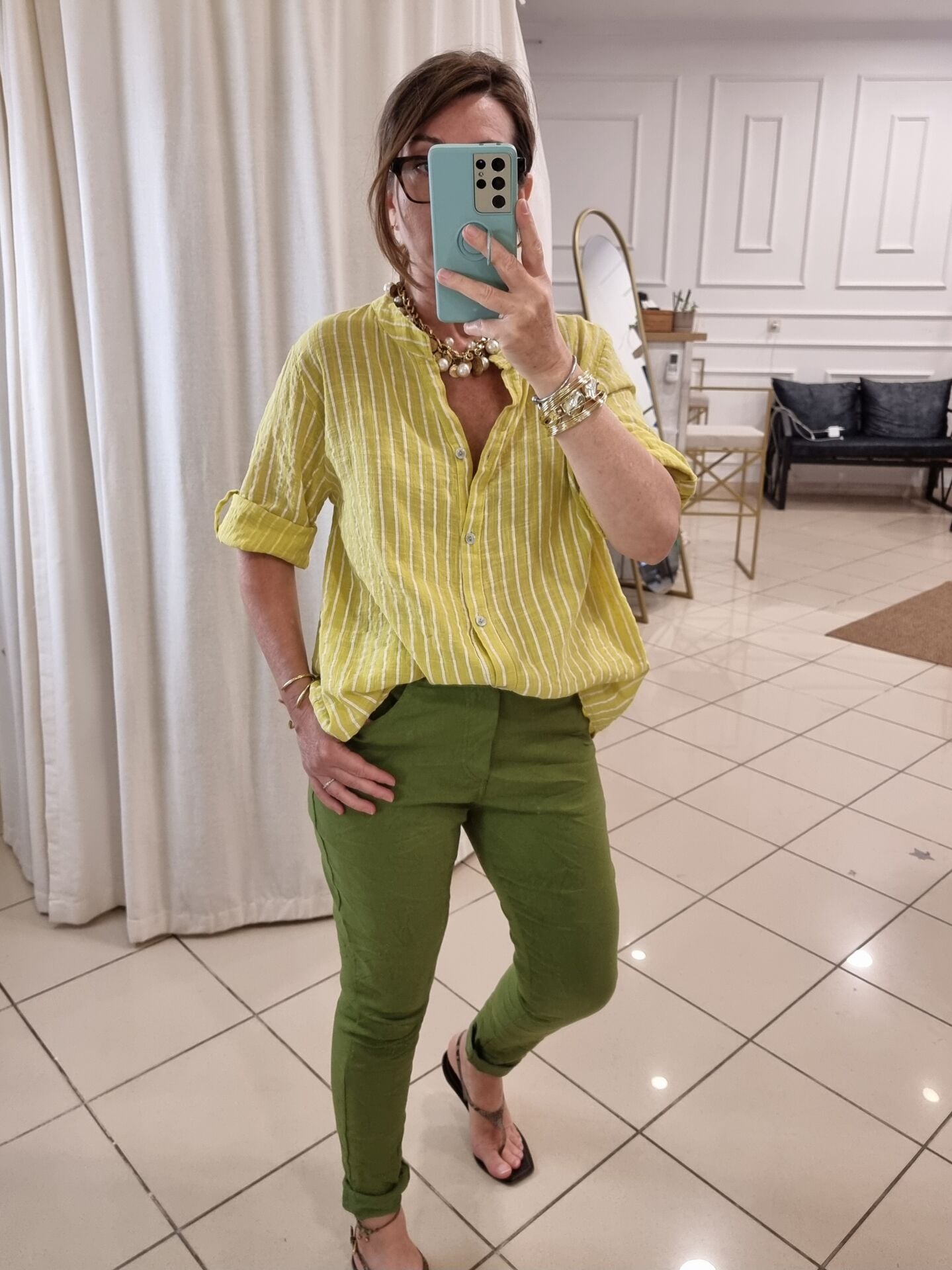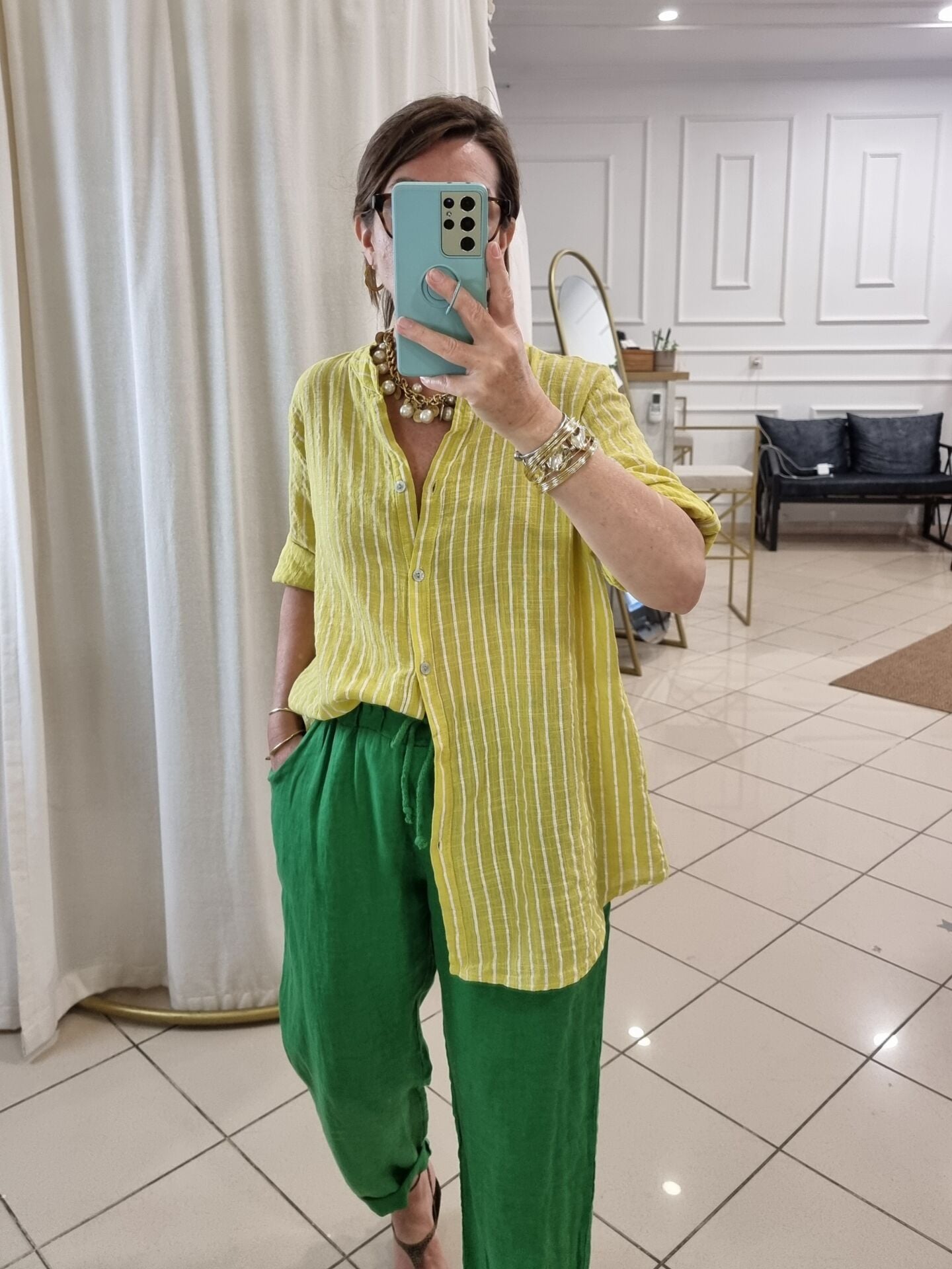 Açık sarı beyaz boyuna çizgili gömlek.