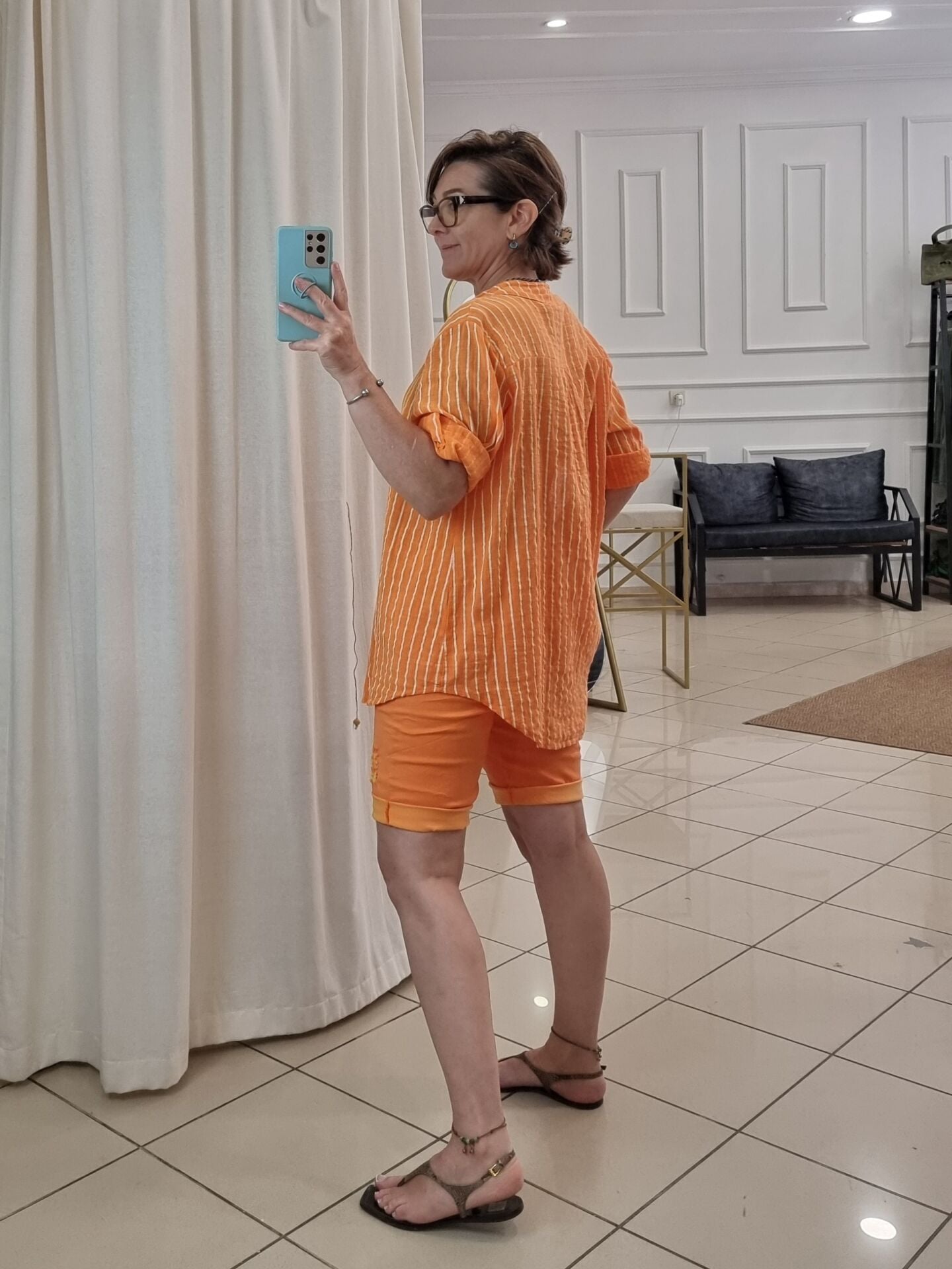 Turuncu beyaz boyuna çizgili gömlek.