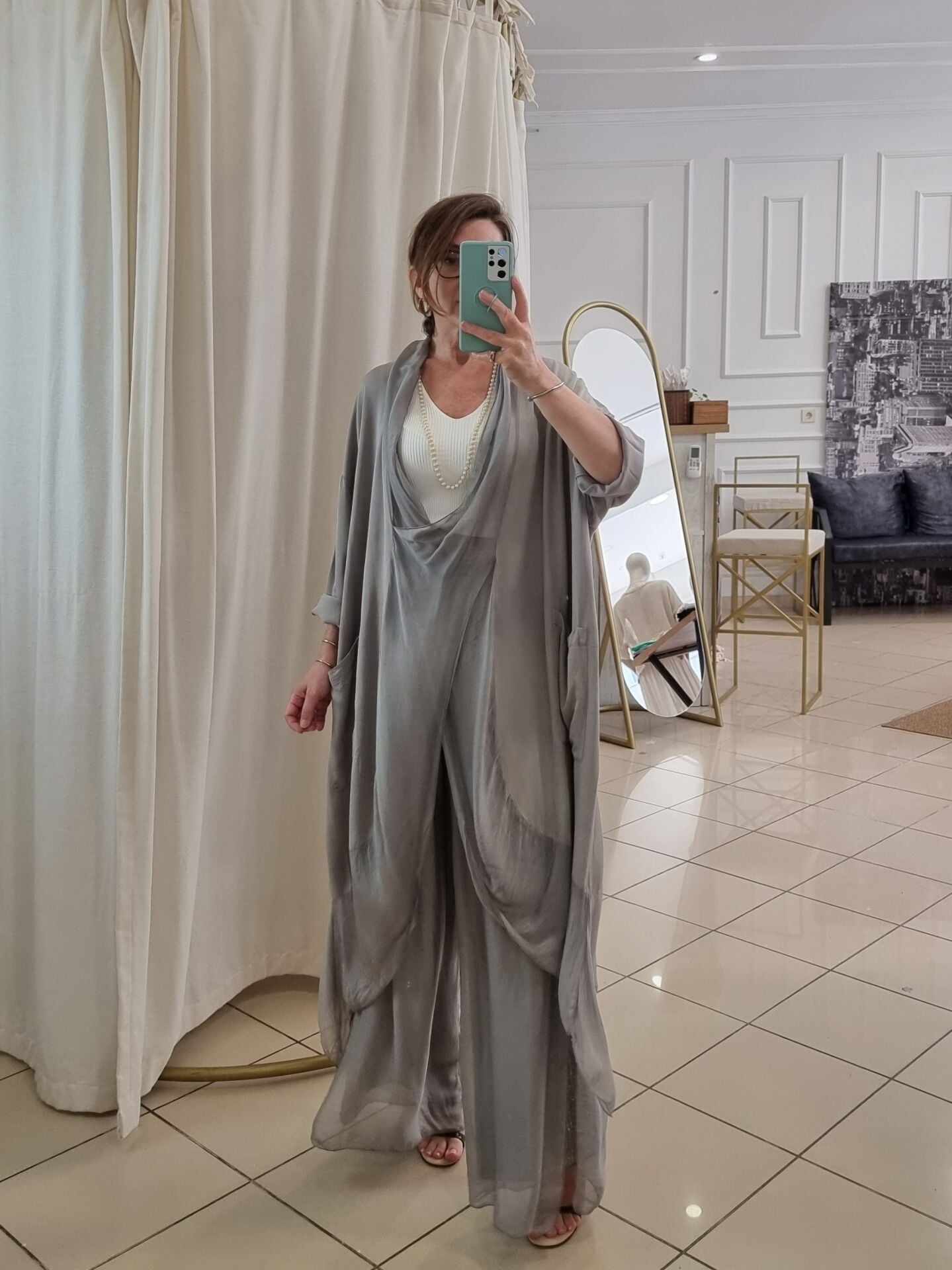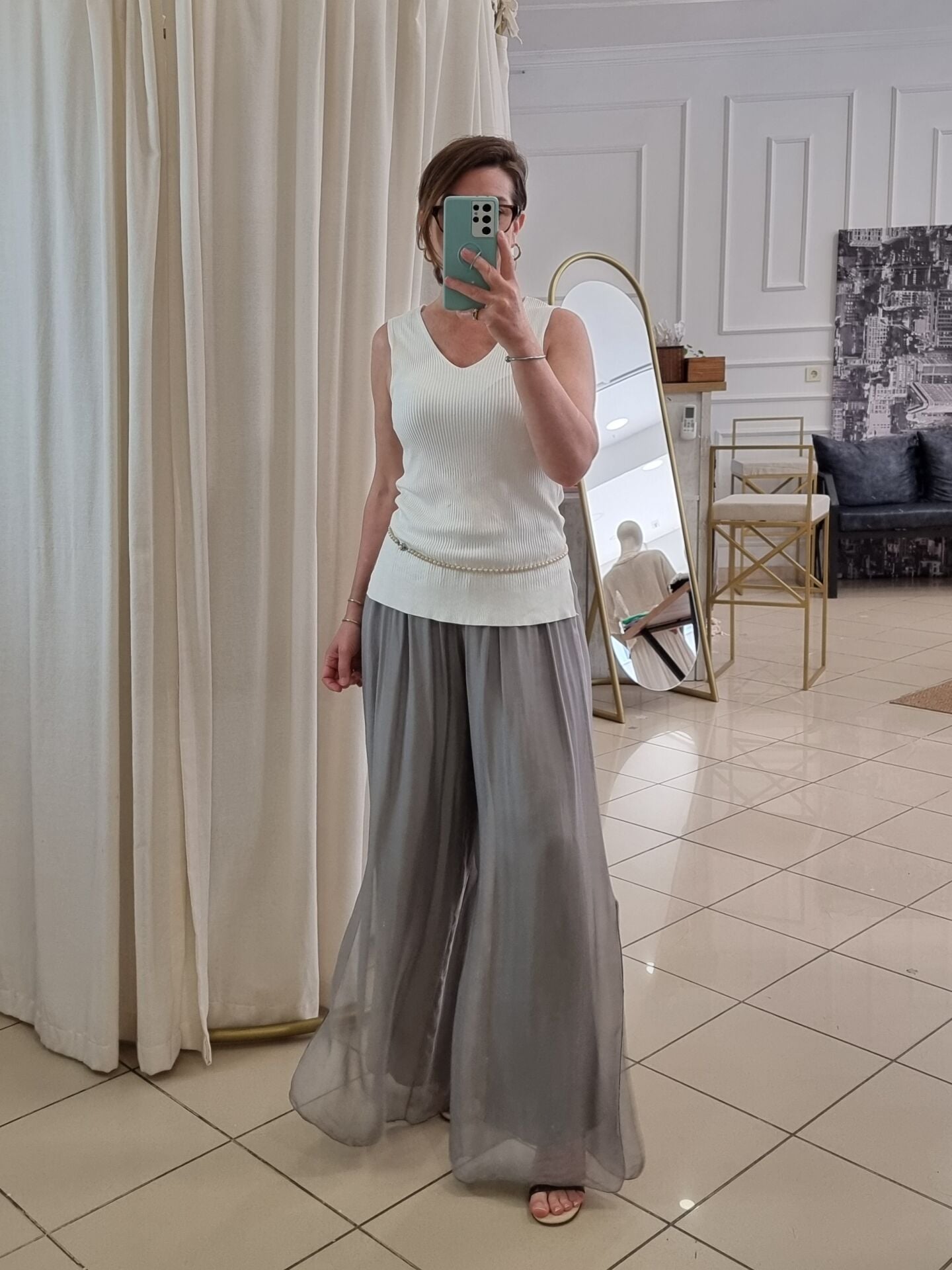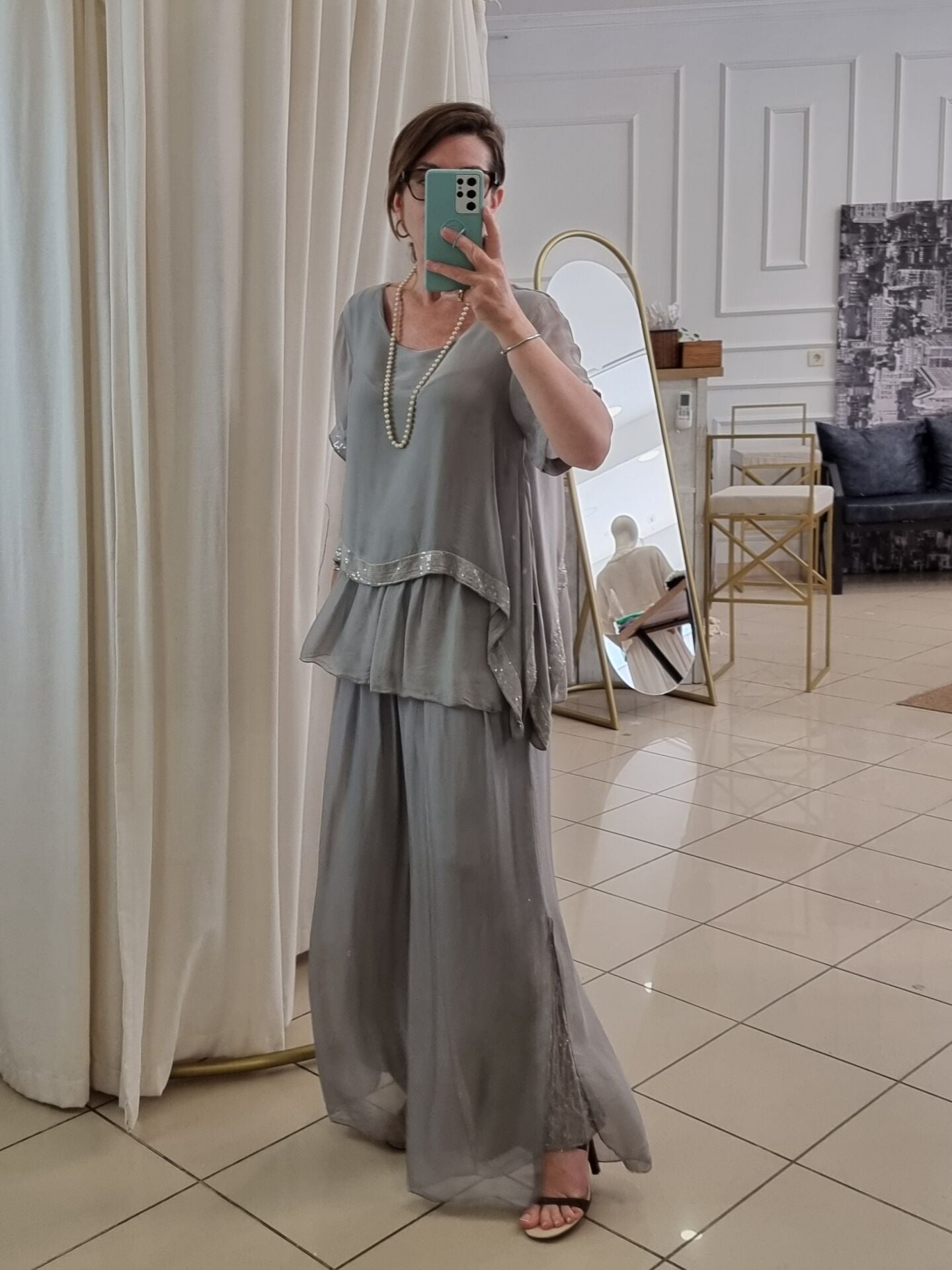 Paça kenarları yırtmaçlı. İç astarı payetli.