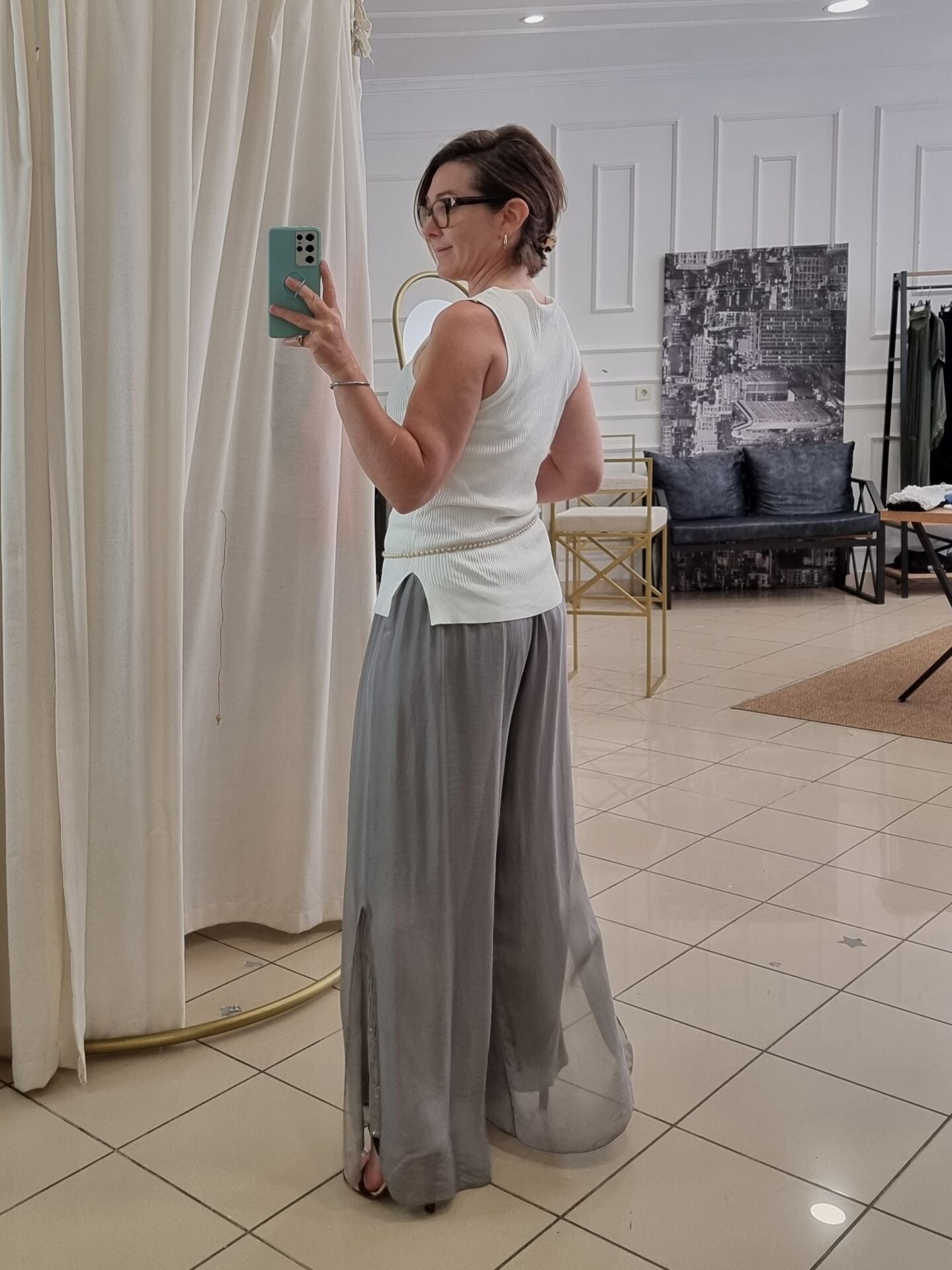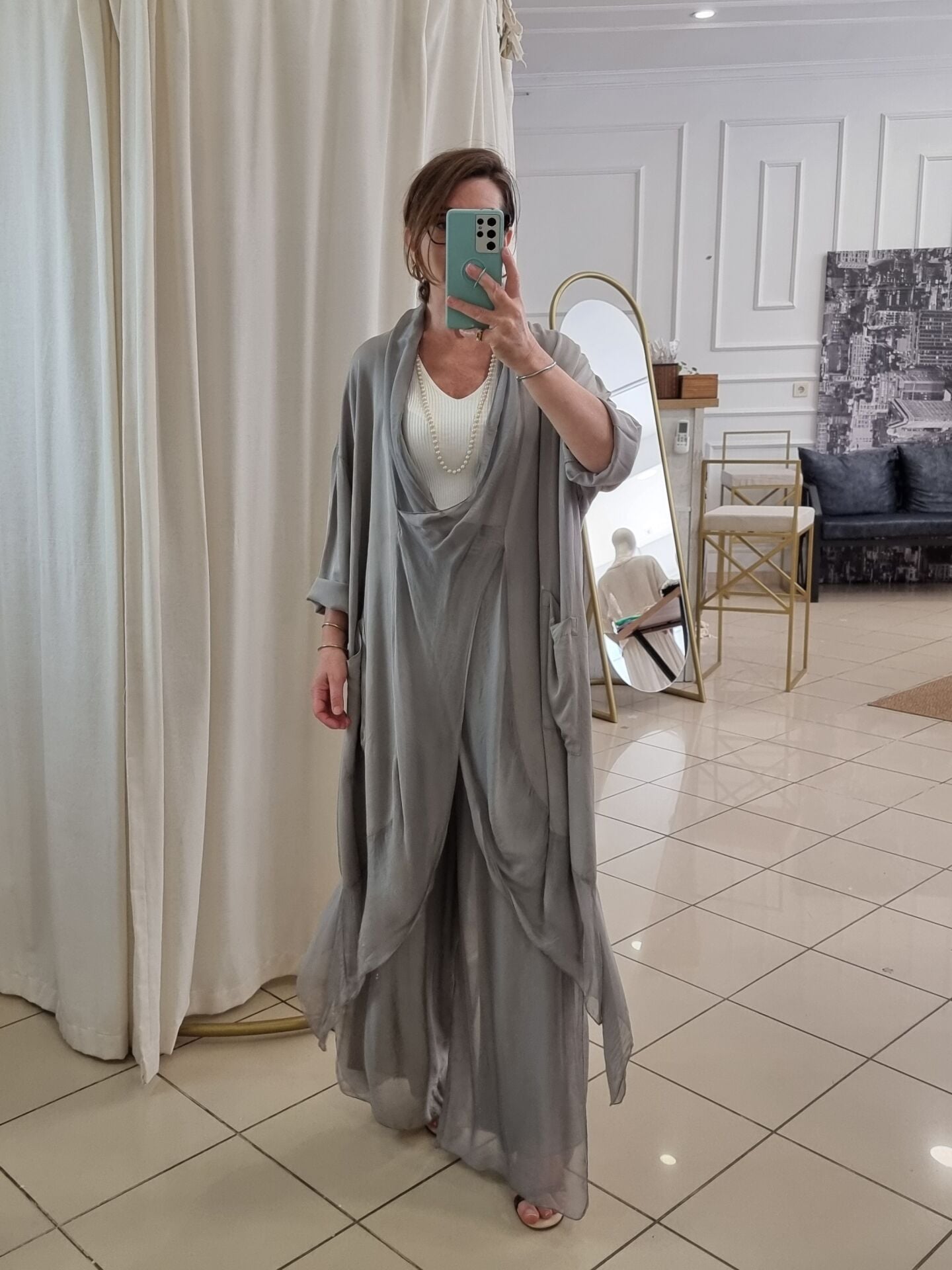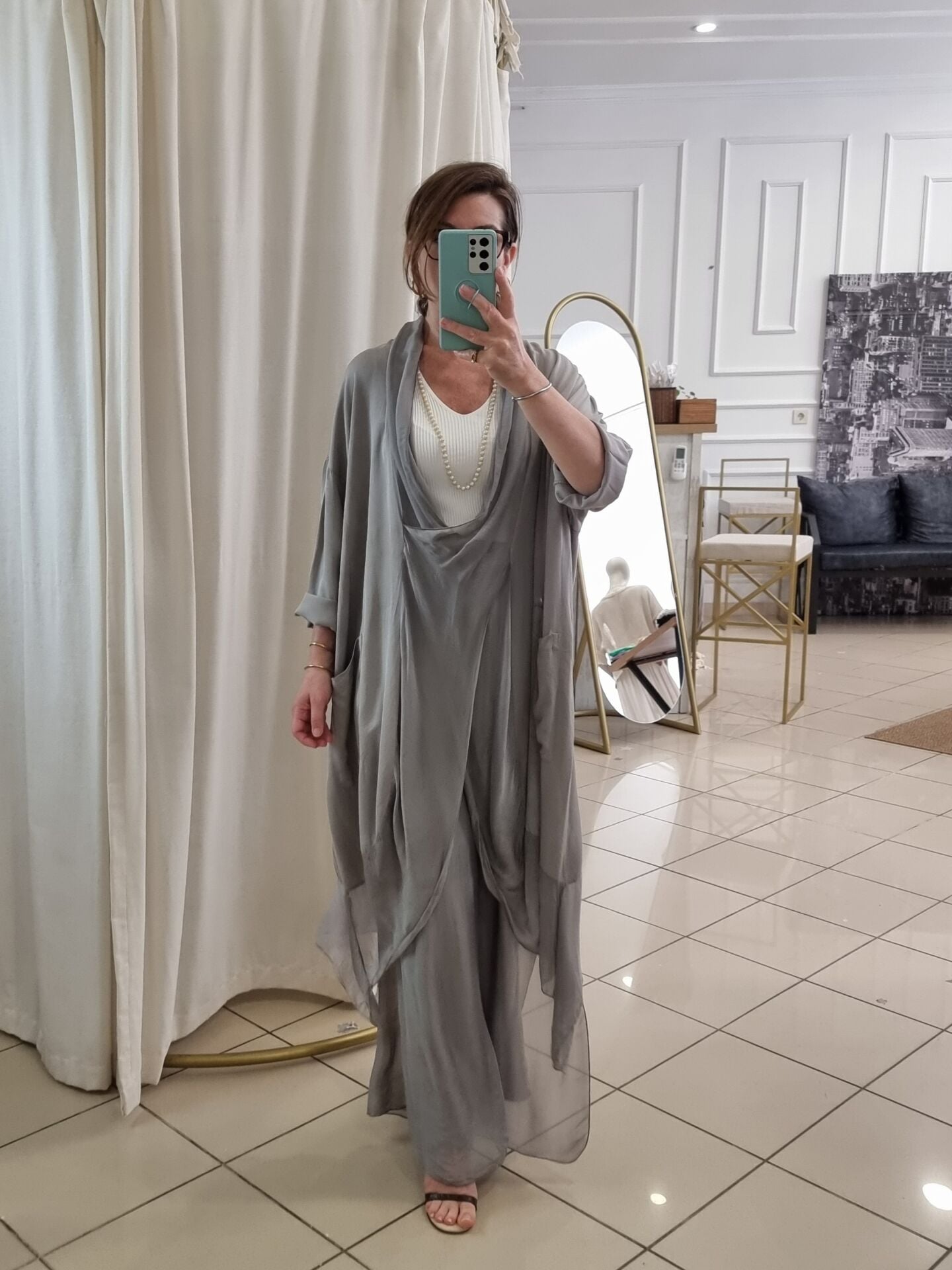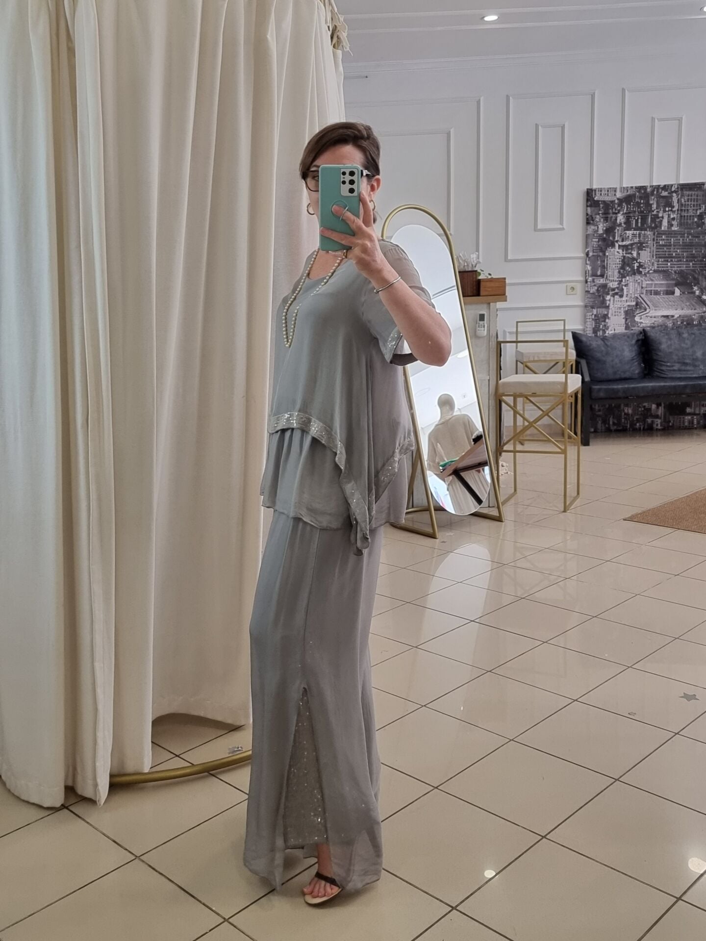 Paça kenarları yırtmaçlı. İç astarı payetli.