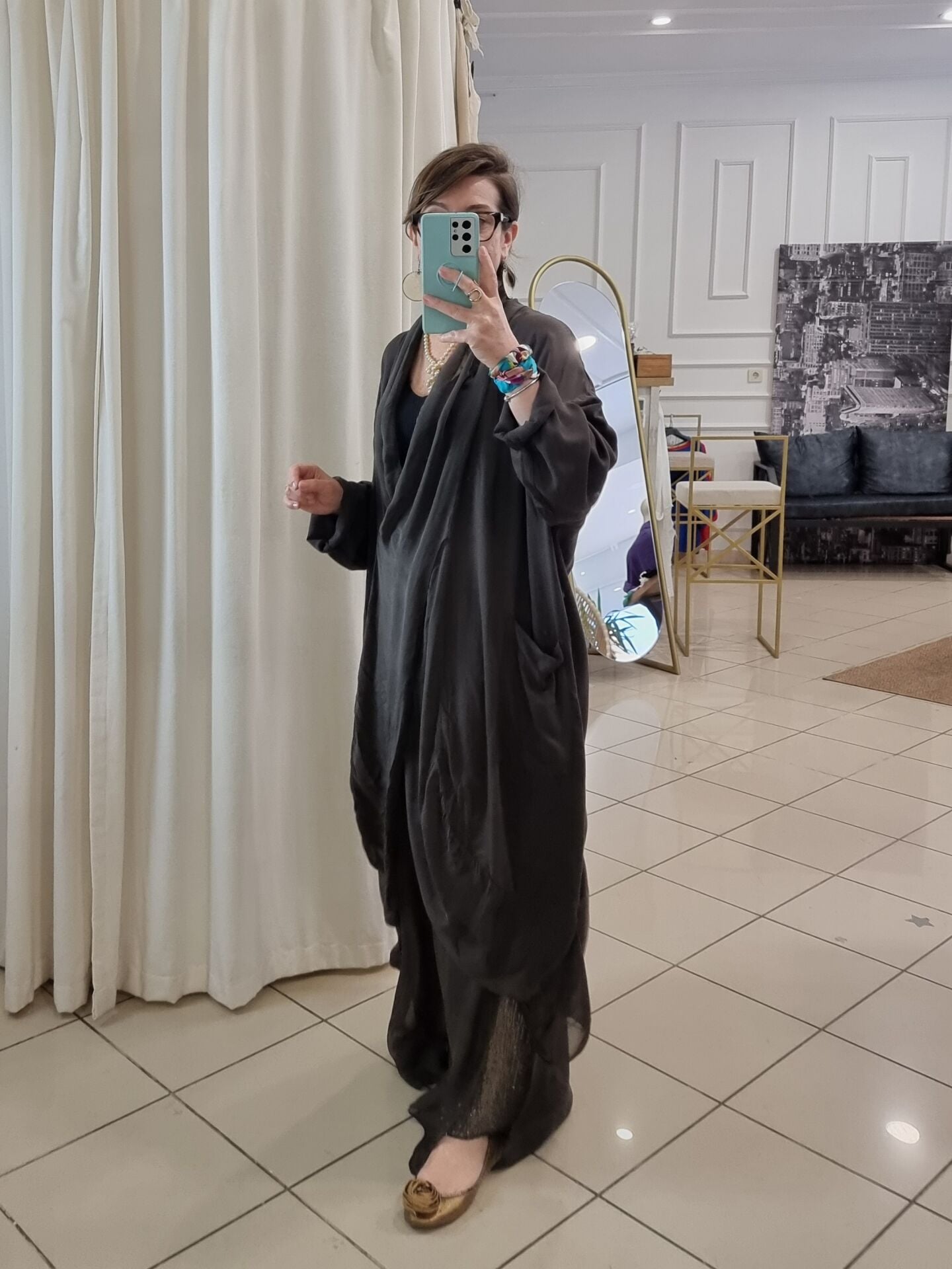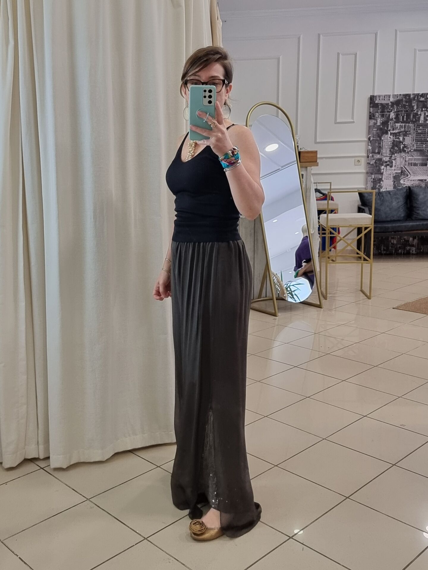 Paça kenarları yırtmaçlı. İç astarı payetli.
