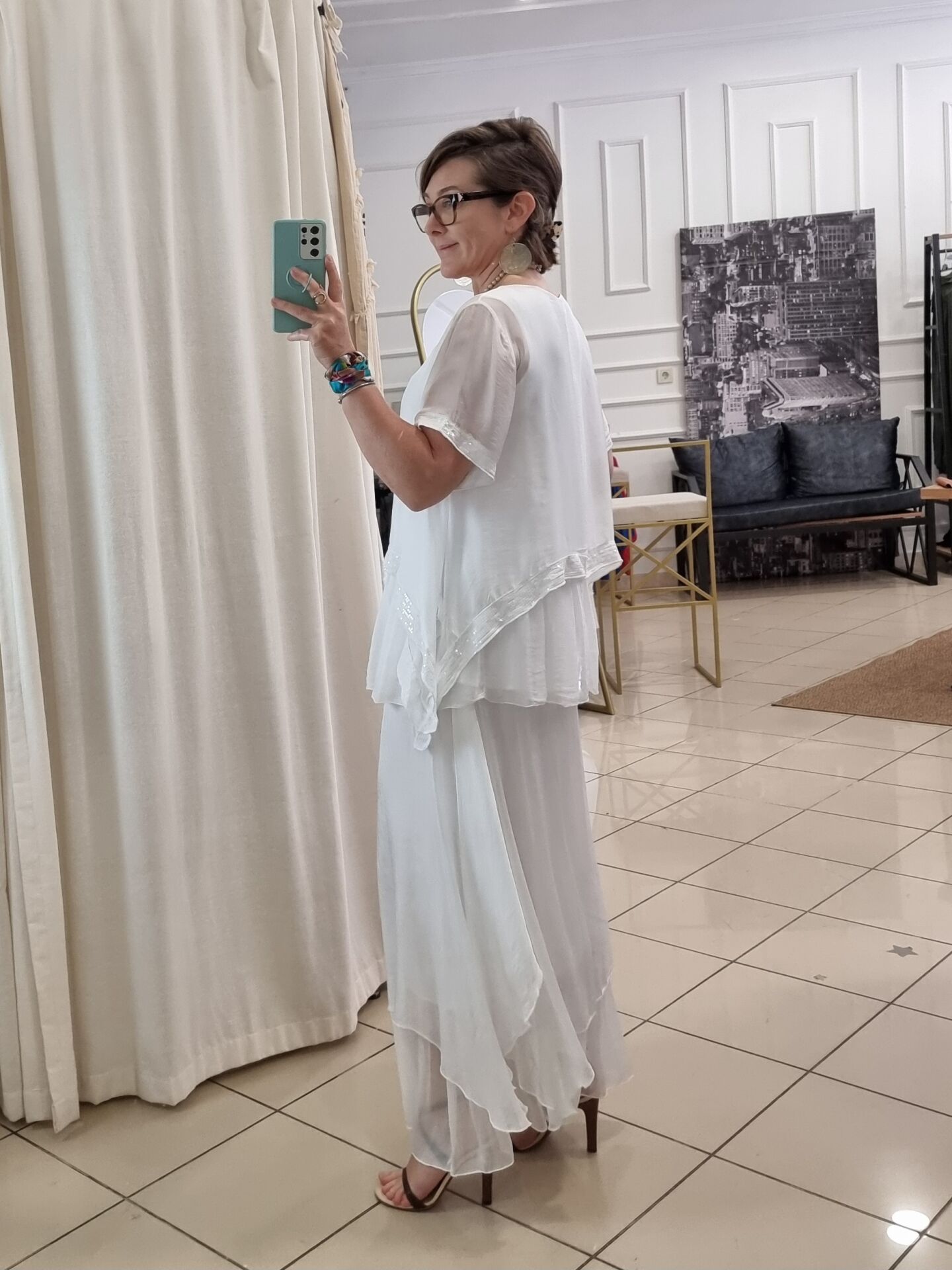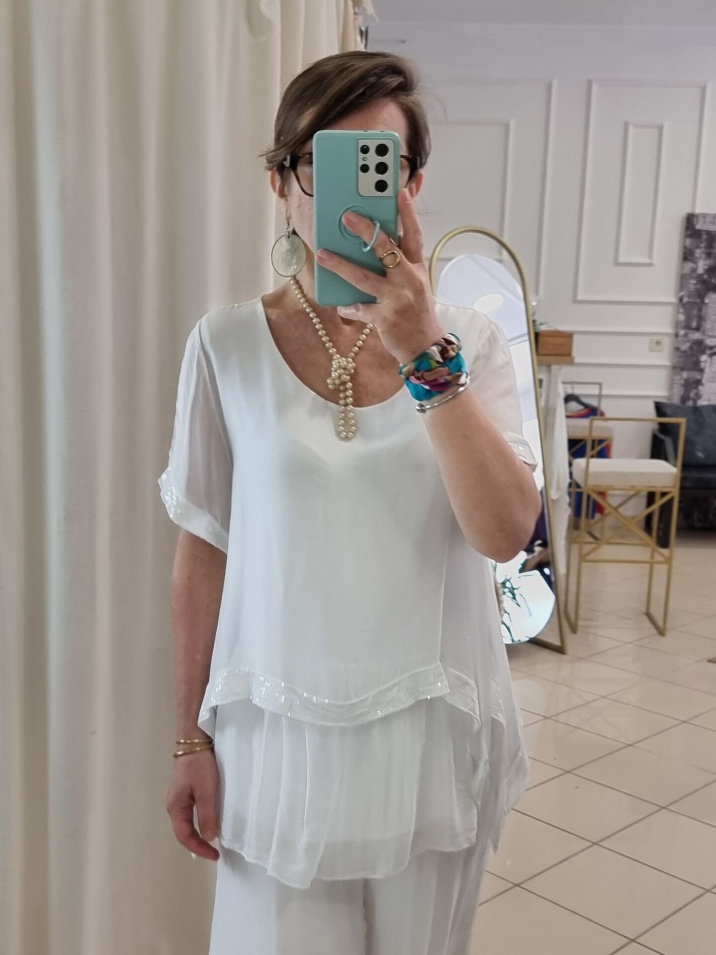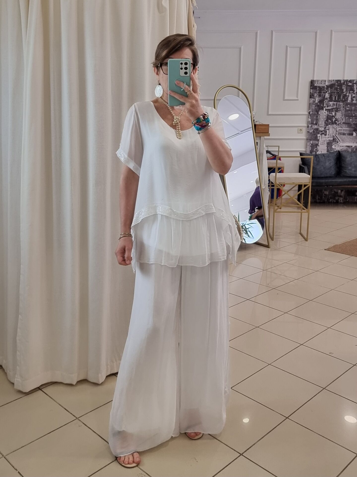 Payetli İpek Beyaz Bluz İtalyan