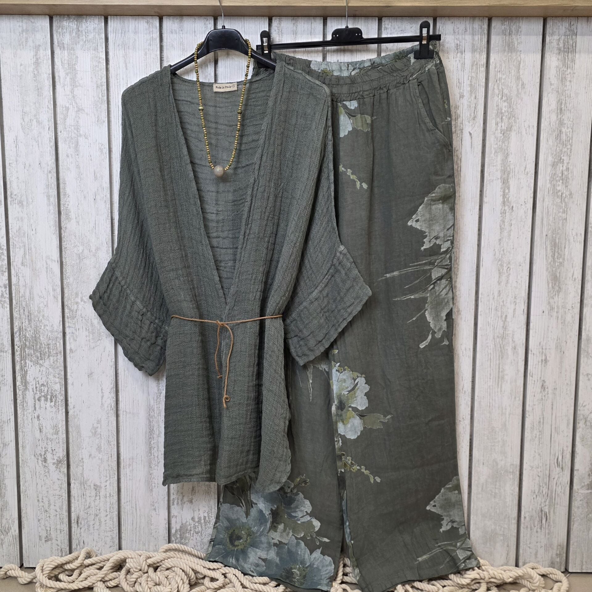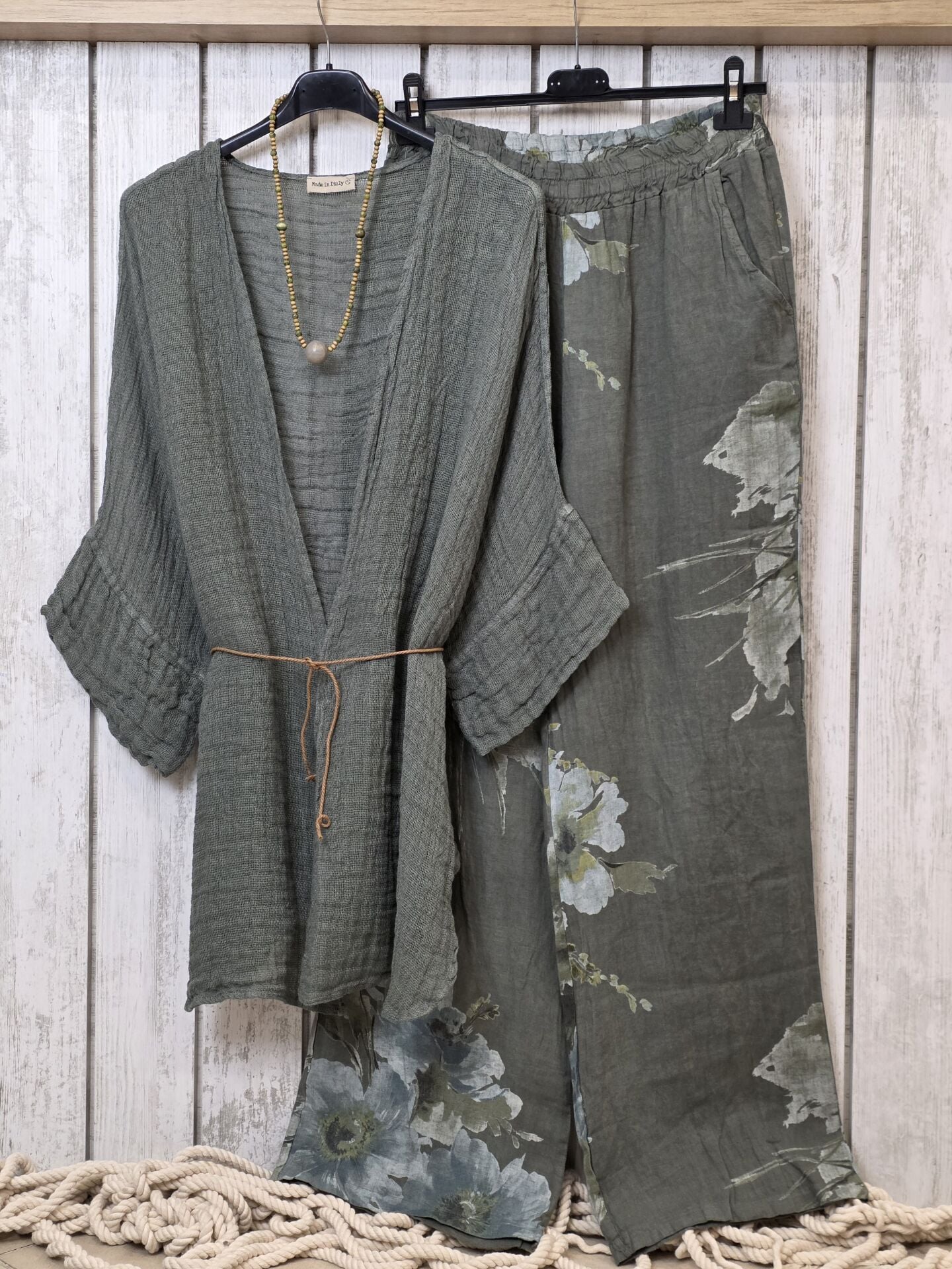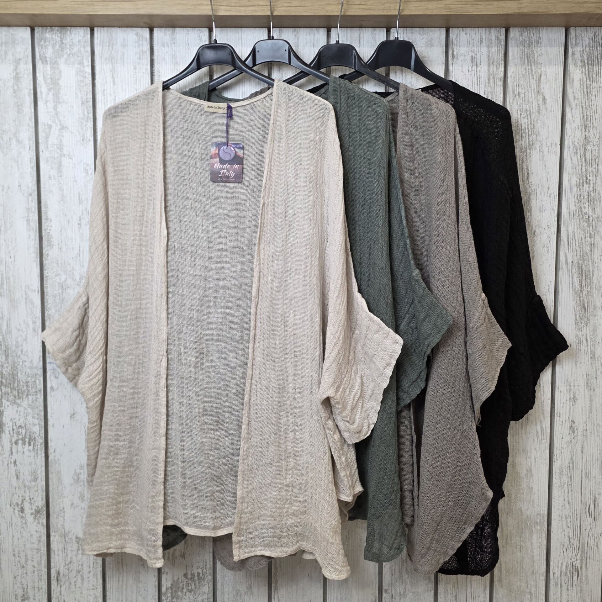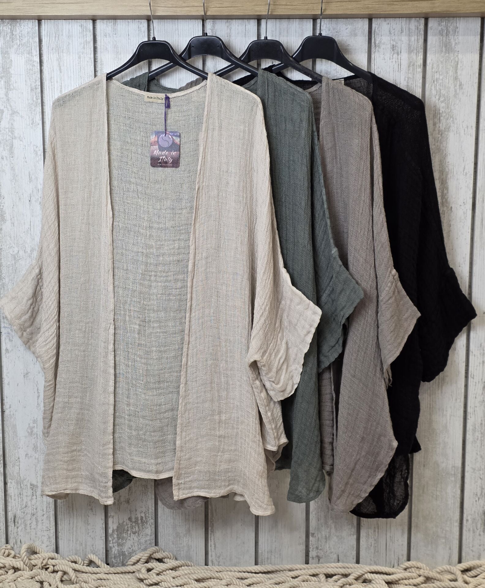 Oversize keten kaftan geniş kesimi sayesinde farklı kombinlerin üzerine zahmetsizce eşlik eder.