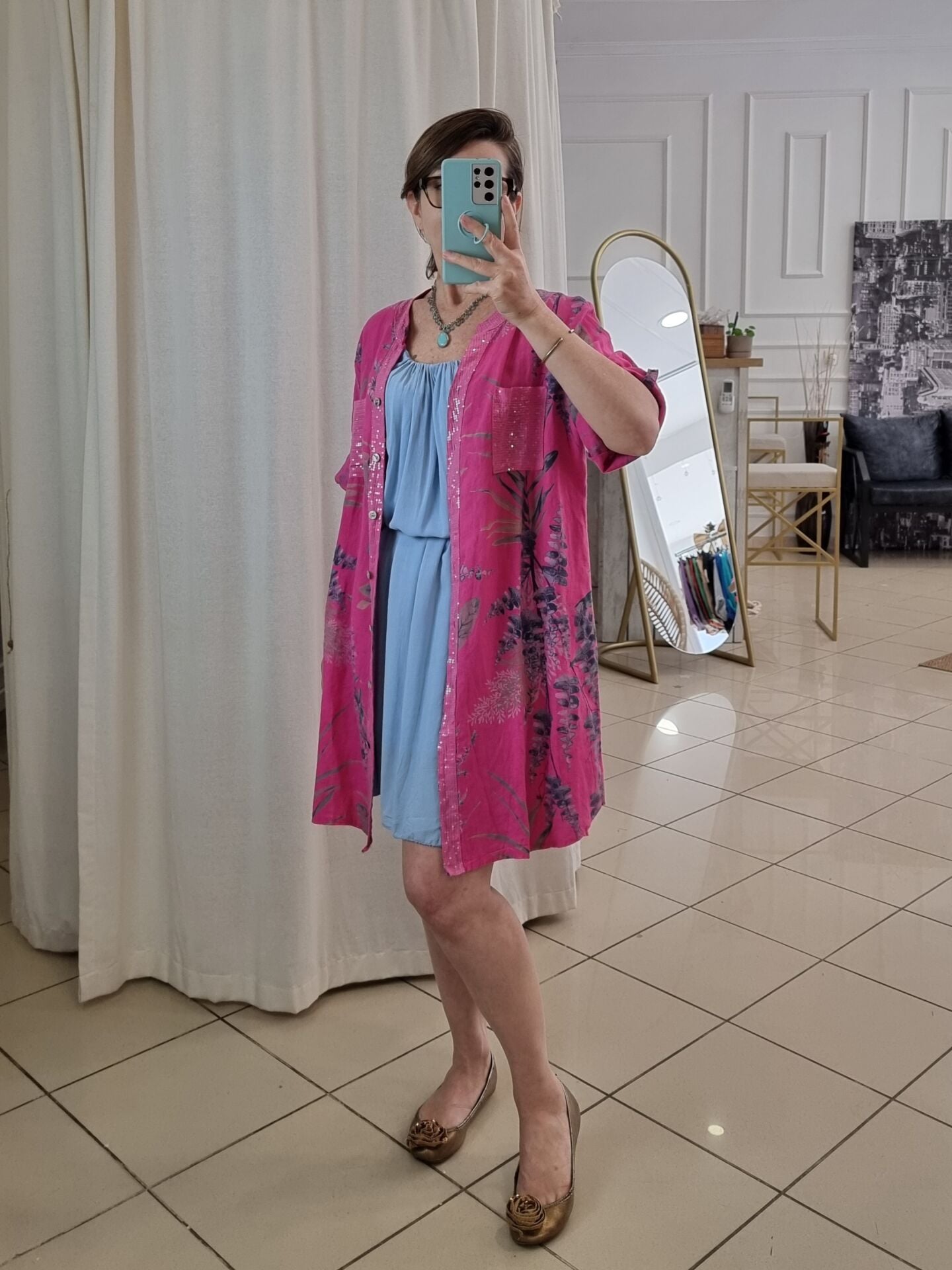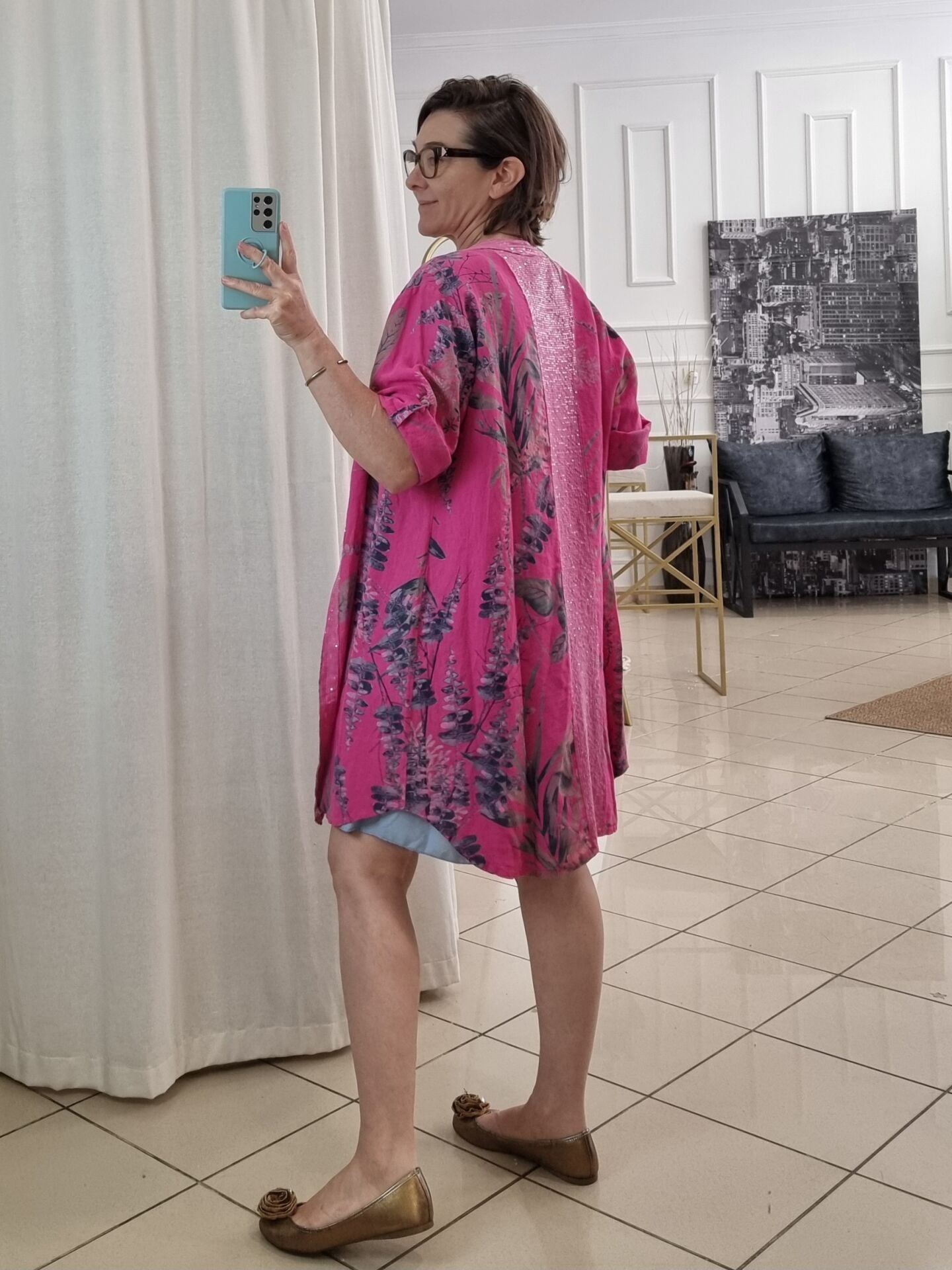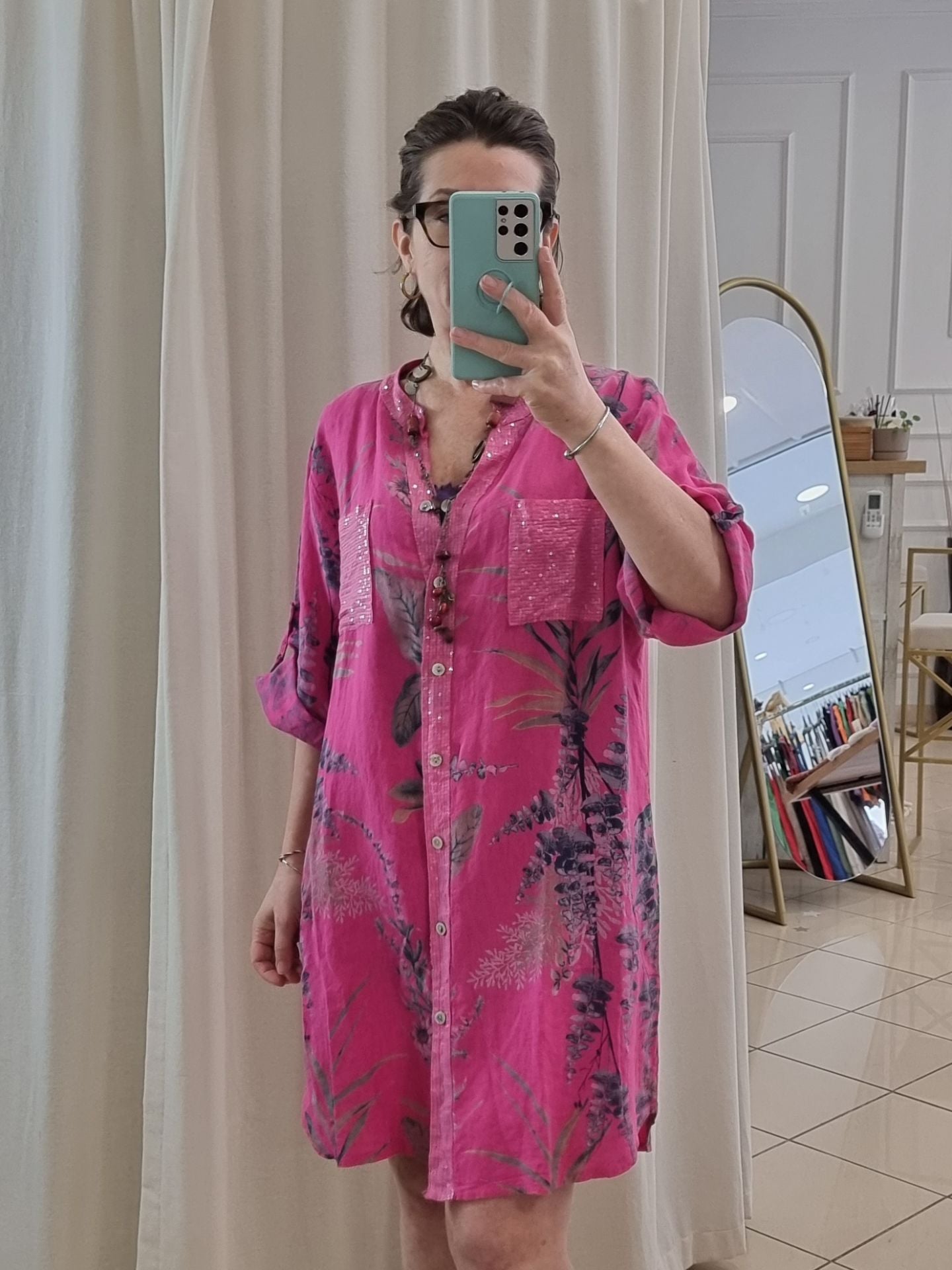 Doğallığı ve ışıltıyı bir araya getiren bu pembe keten tunik, İtalyan tarzının enerjik havasını yansıtıyor. Yaprak desenleri ve pullu detaylarıyla dikkat çeken bu model, hem elbise hem de gömlek olarak kullanılabiliyor. Hafif ve nefes alabilen %100 keten kumaşı, yaz günlerinde ferah bir şıklık sunarken, yarım kollu yapısıyla hareket özgürlüğü sağlar. Oversize kesimi sayesinde 48/50 bedene kadar uyumludur. Kadınlar için tasarlanan bu özel keten tunik, stilinize zarafet ve özgünlük katmak için birebir!