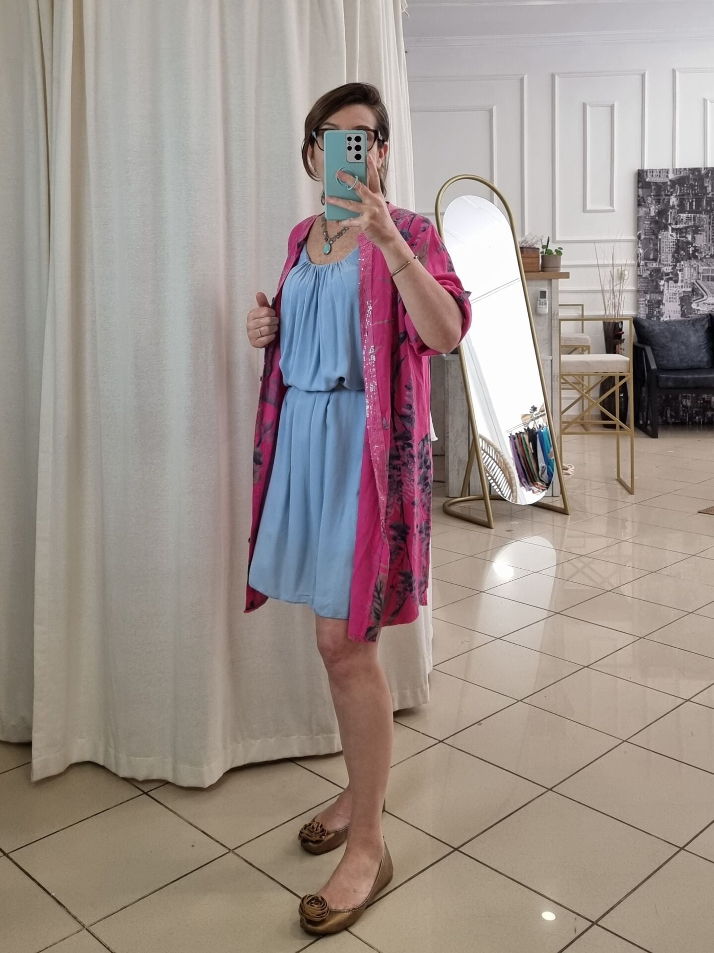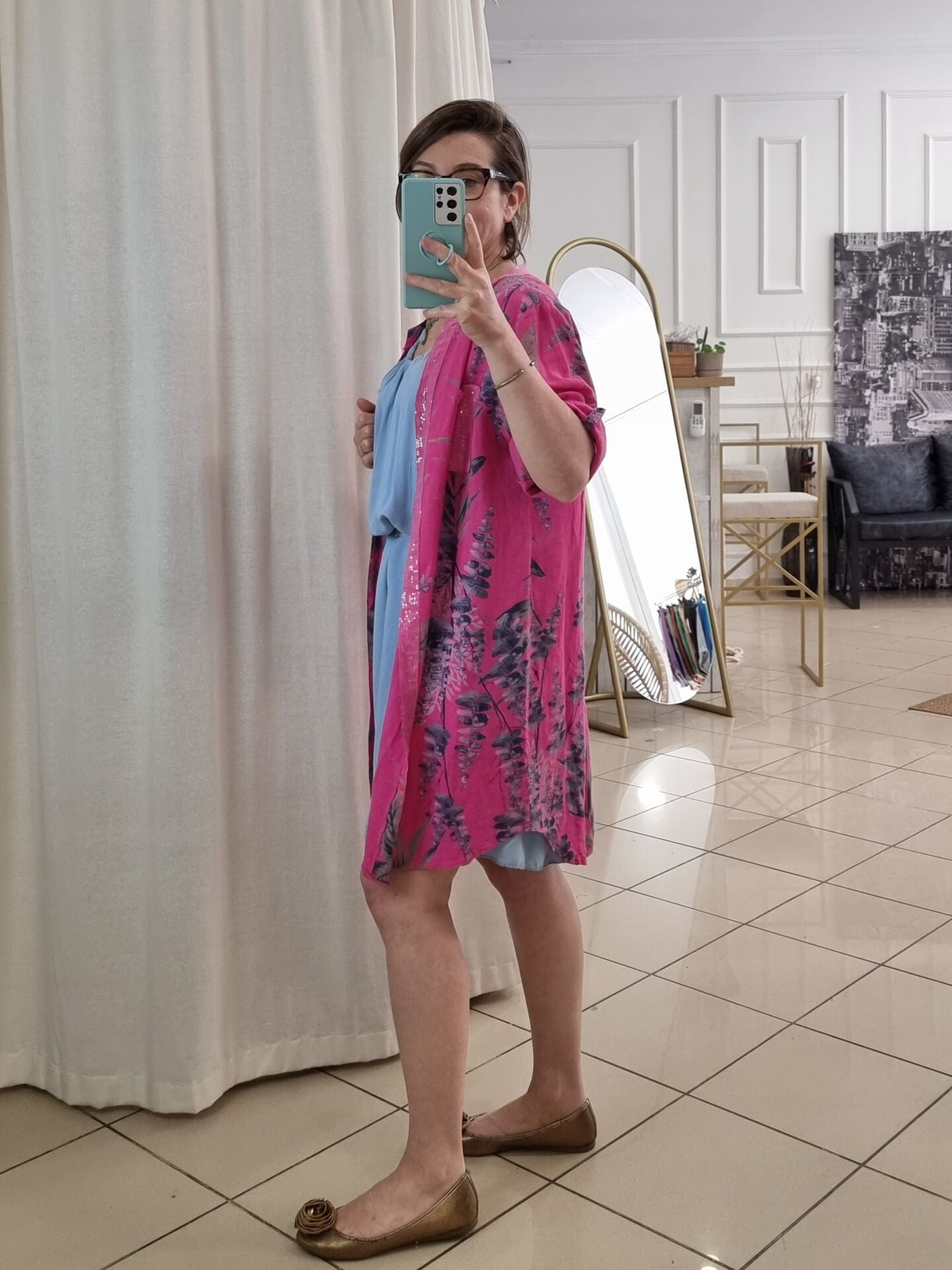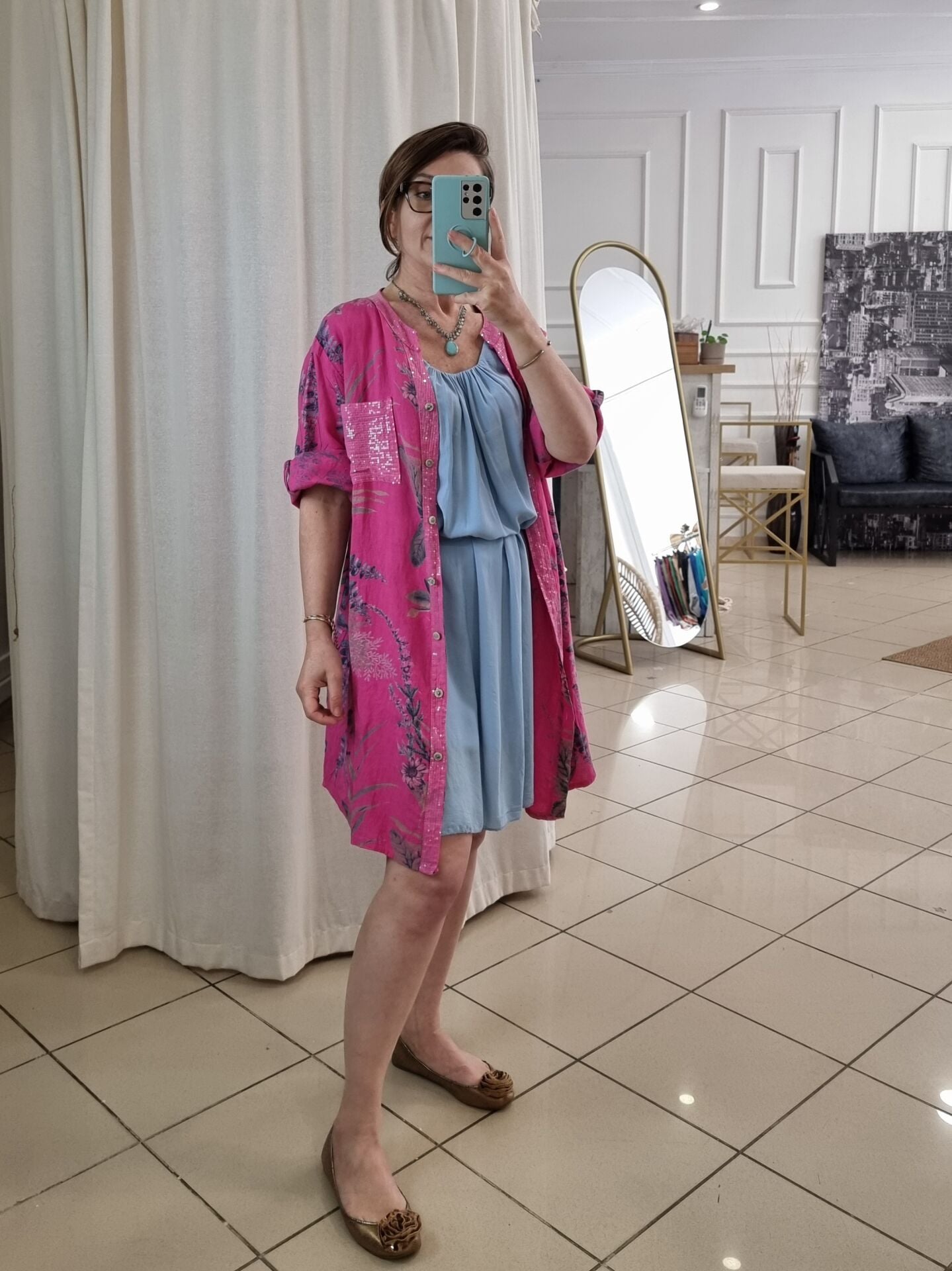 Doğallığı ve ışıltıyı bir araya getiren bu pembe keten tunik, İtalyan tarzının enerjik havasını yansıtıyor. Yaprak desenleri ve pullu detaylarıyla dikkat çeken bu model, hem elbise hem de gömlek olarak kullanılabiliyor. Hafif ve nefes alabilen %100 keten kumaşı, yaz günlerinde ferah bir şıklık sunarken, yarım kollu yapısıyla hareket özgürlüğü sağlar. Oversize kesimi sayesinde 48/50 bedene kadar uyumludur. Kadınlar için tasarlanan bu özel keten tunik, stilinize zarafet ve özgünlük katmak için birebir!