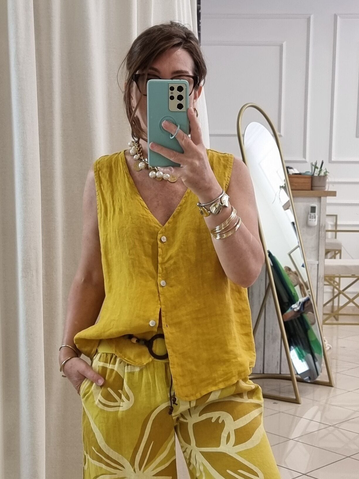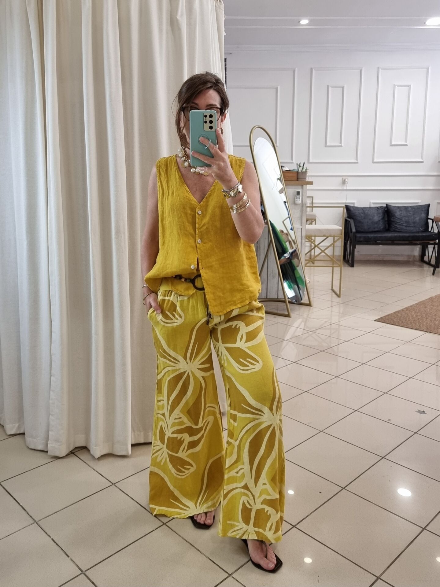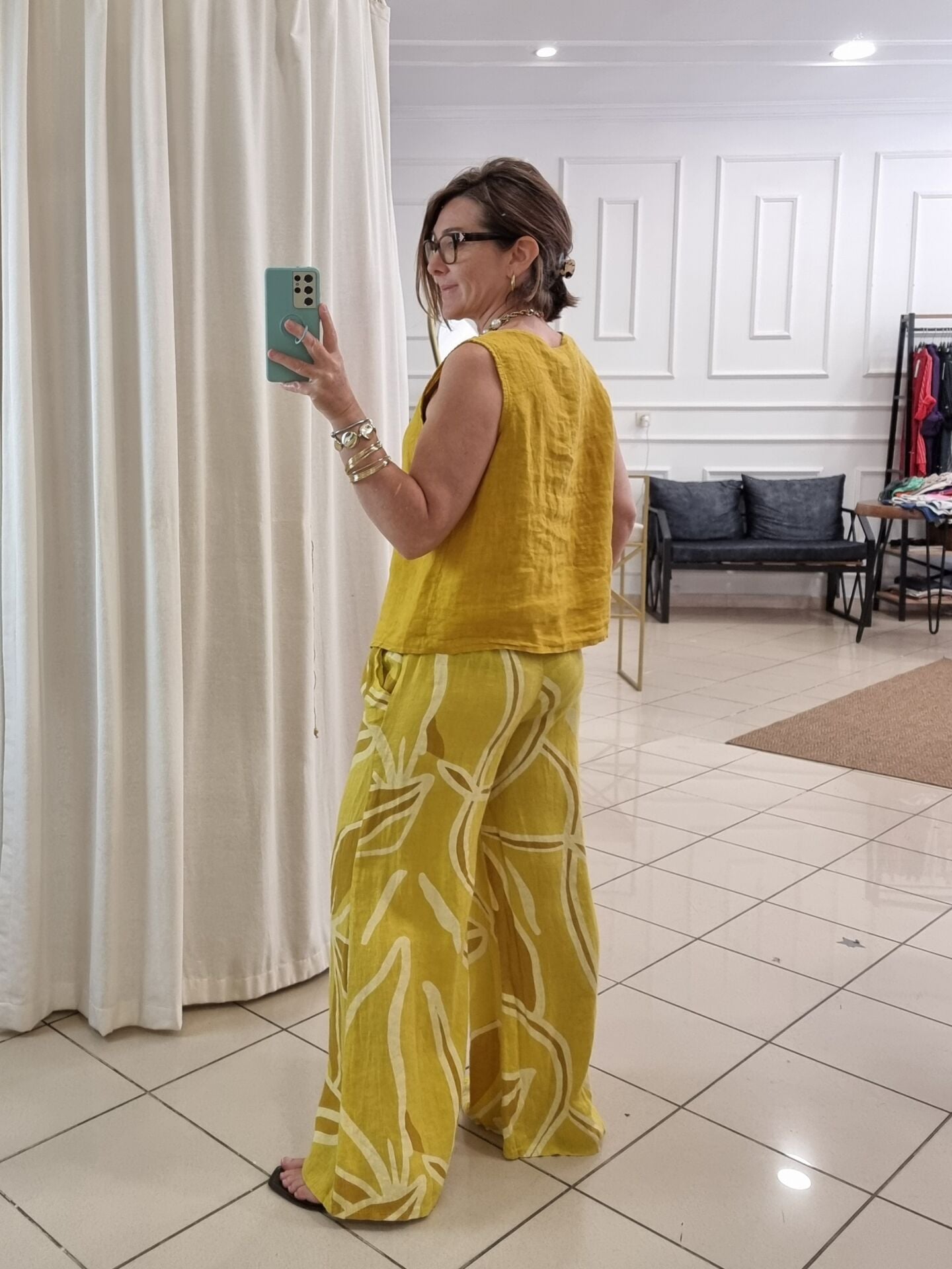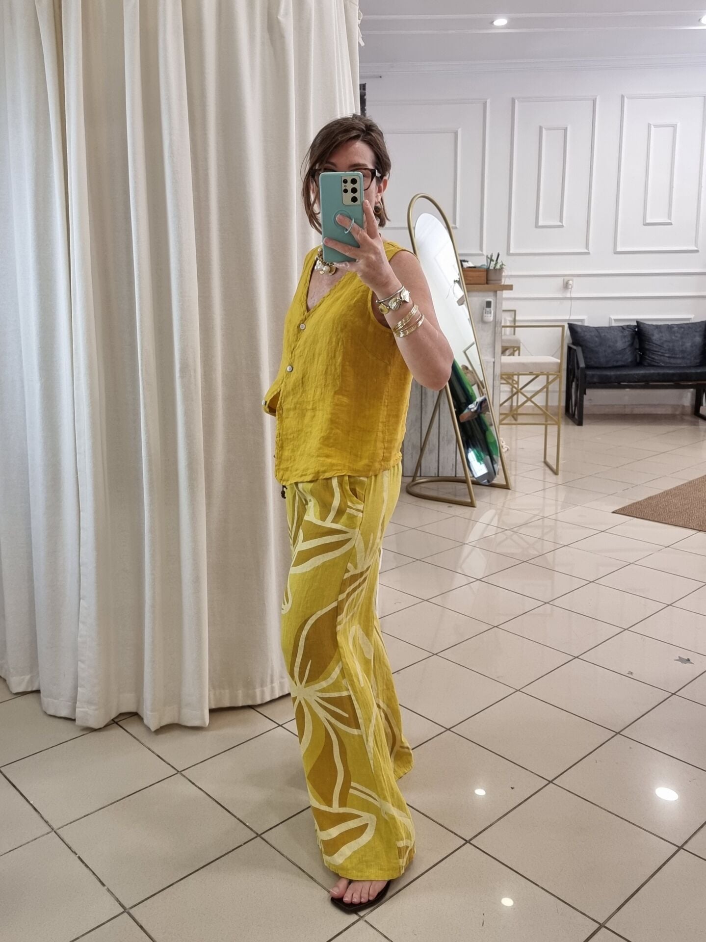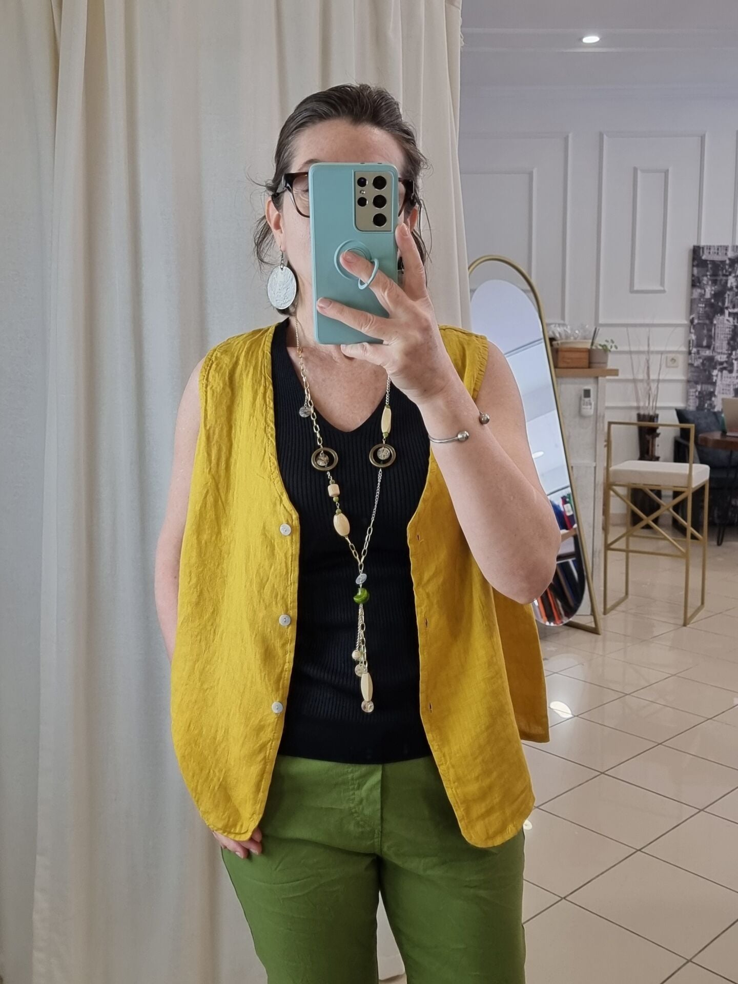 Canlı tonuyla enerjiyi temsil eden bu hardal sarı yelek, kadın stilinde dikkat çeken parçalardan biri. Hafif ve nefes alabilen keten kumaşı, sıcak havalarda ideal konforu sunar. Oversize kesimi hareket özgürlüğü sağlarken, zarif tasarımıyla yaz kombinlerinin tamamlayıcısı olur. Gardırobuna farklılık katmak isteyen kadınlar için bu hardal sarı yelek eşsiz bir alternatif.