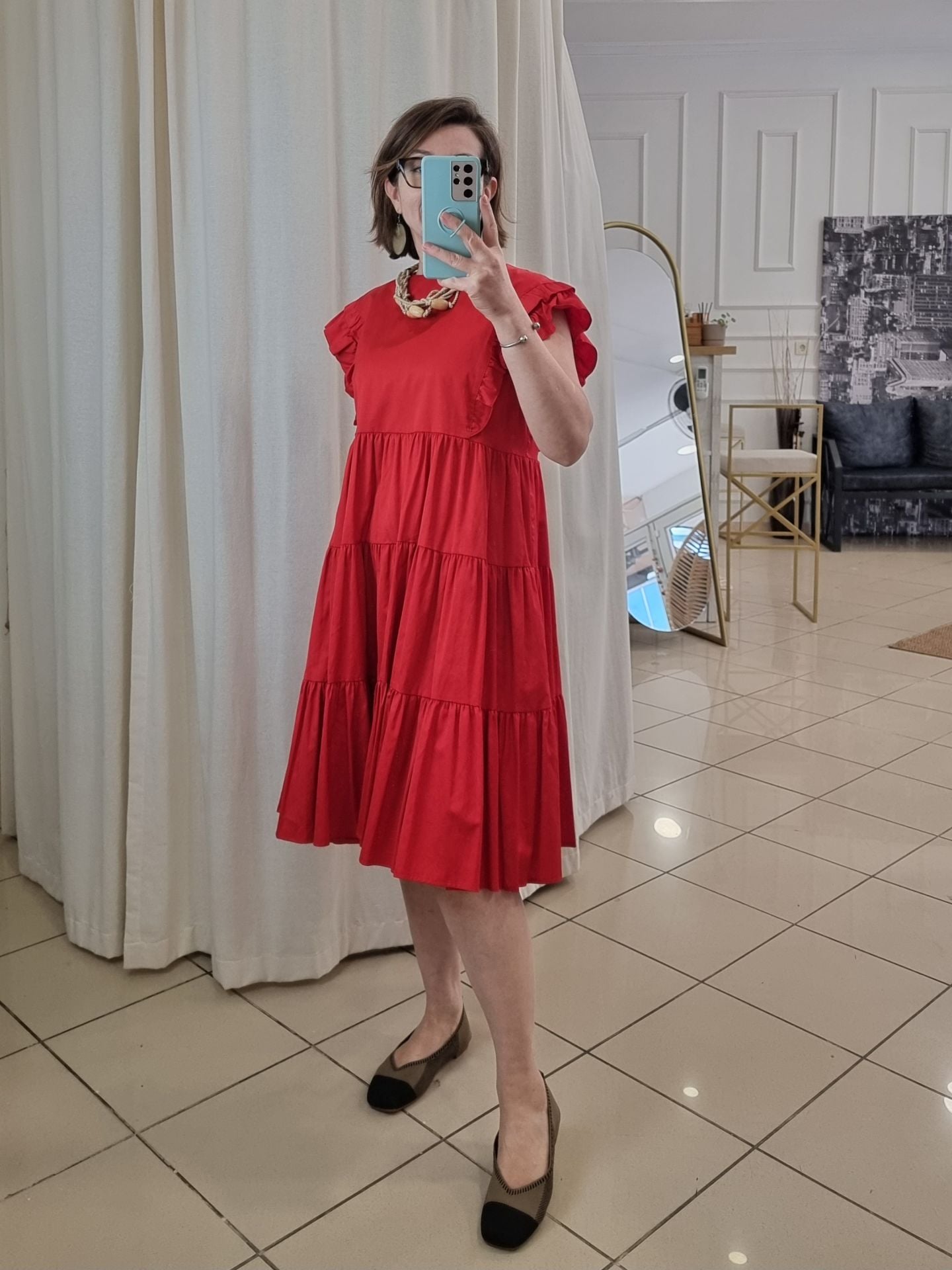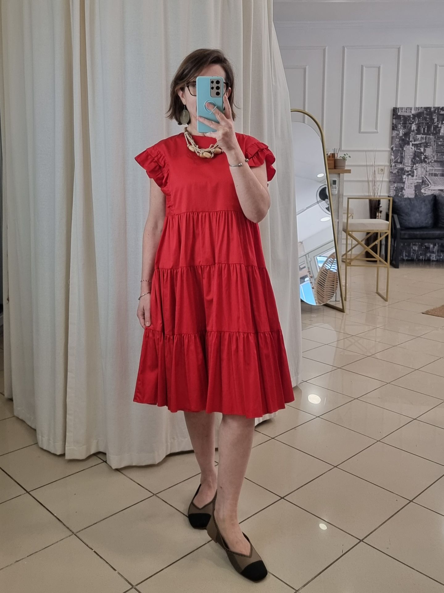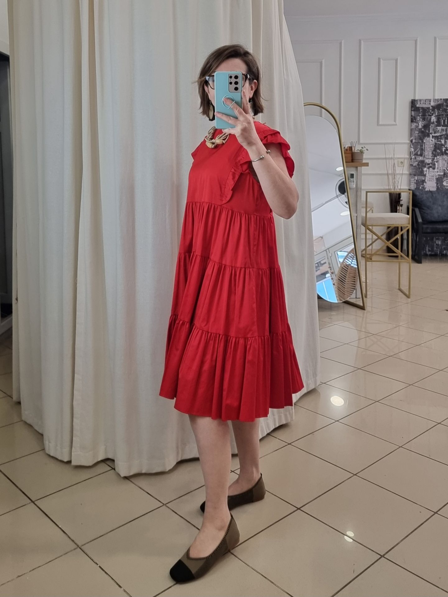 Bu saten poplin kırmızı elbise, canlı rengiyle enerjik bir duruş sunarken, kol ve etek uçlarındaki volan detaylarıyla feminen bir hava yaratır. %100 pamuk kumaşı sayesinde yazın ferah tutar, etek ucuna doğru bollaşan kesimiyle de vücuda nefes aldırır. Sırttan gizli fermuarı sayesinde rahatlıkla giyilip çıkarılabilir. Günlük şıklık arayan kadınlar için hem konforlu hem de göz alıcı bir alternatif. Bu kırmızı elbise ile yaz kombinlerine romantik bir dokunuş katmak mümkün.
