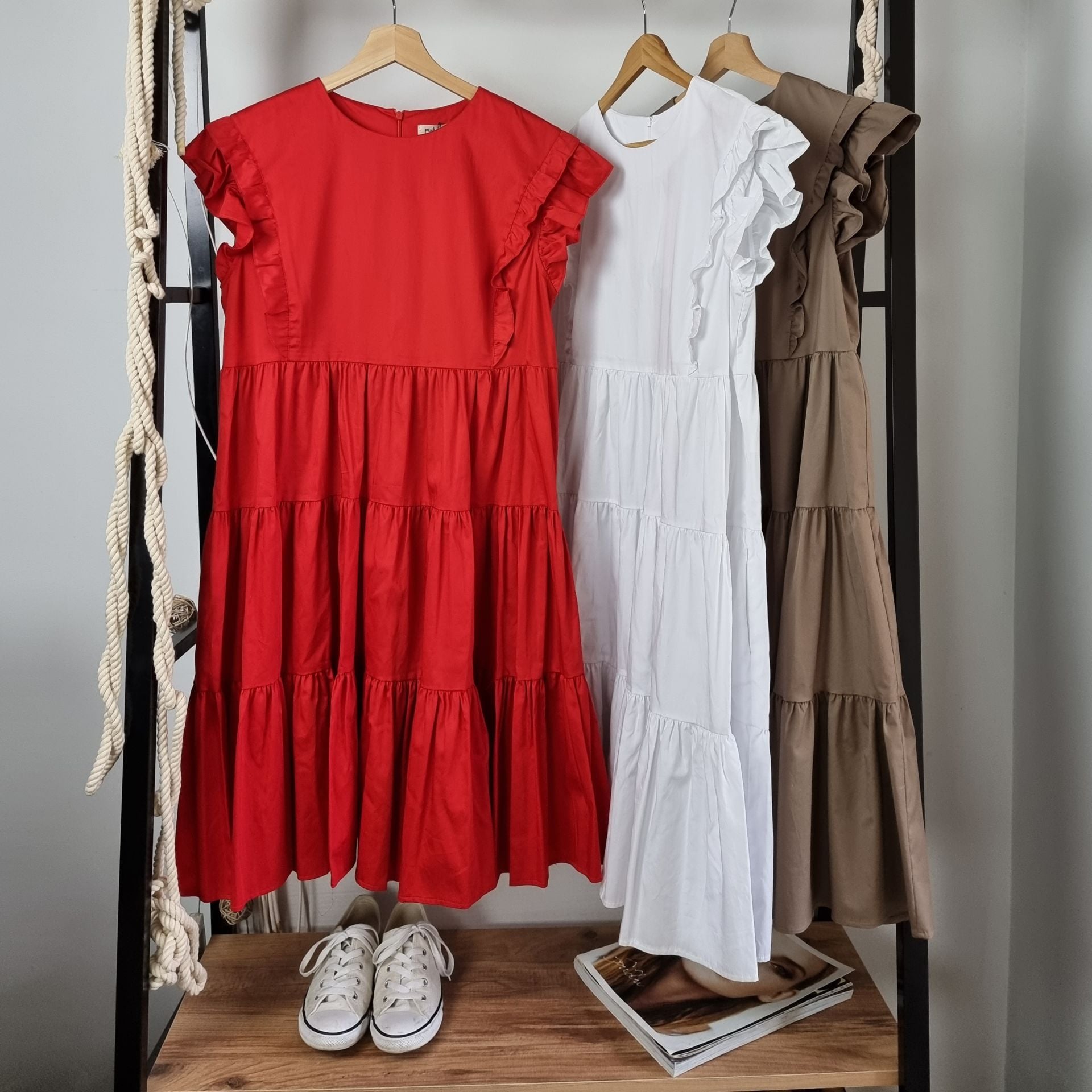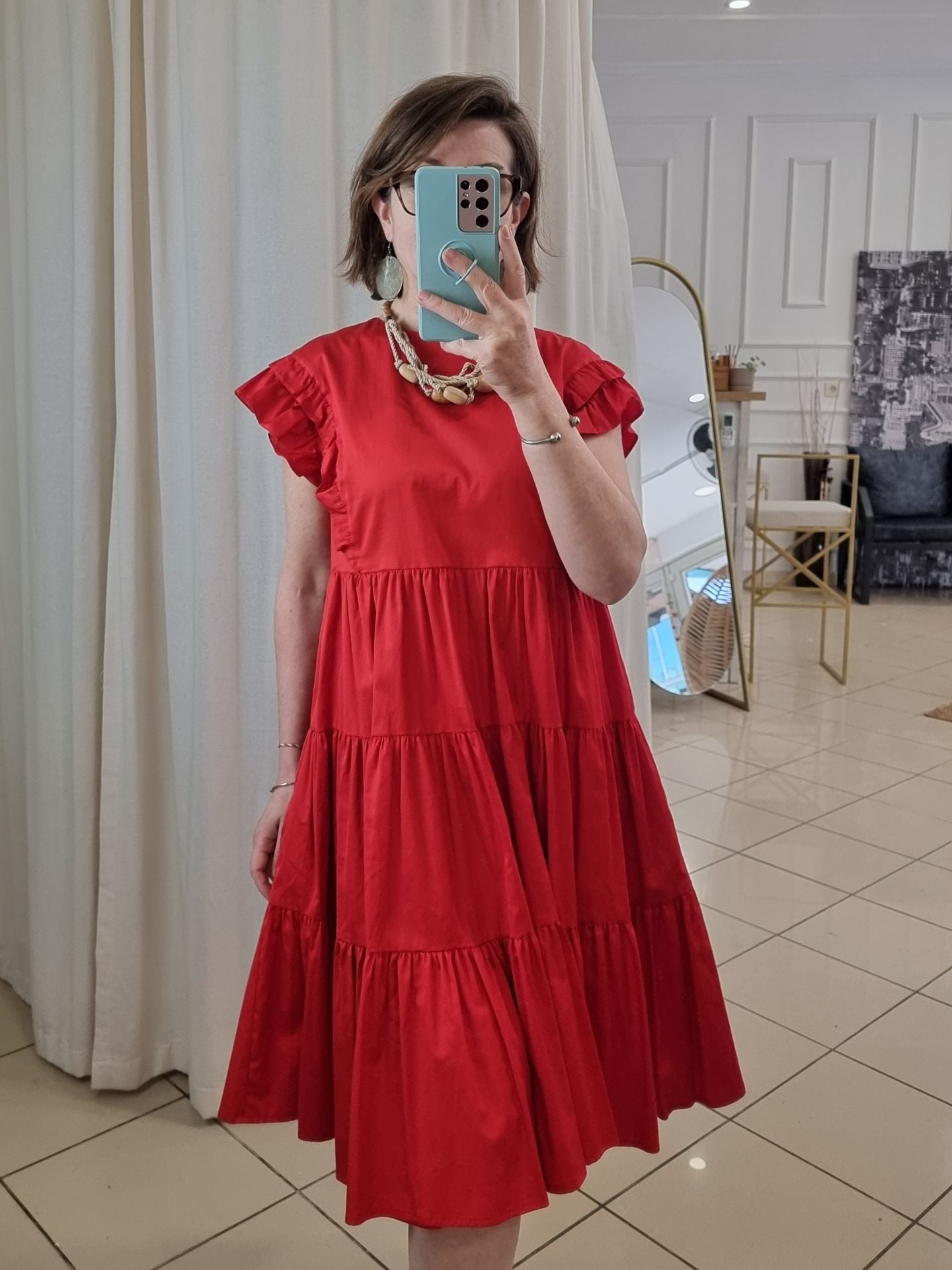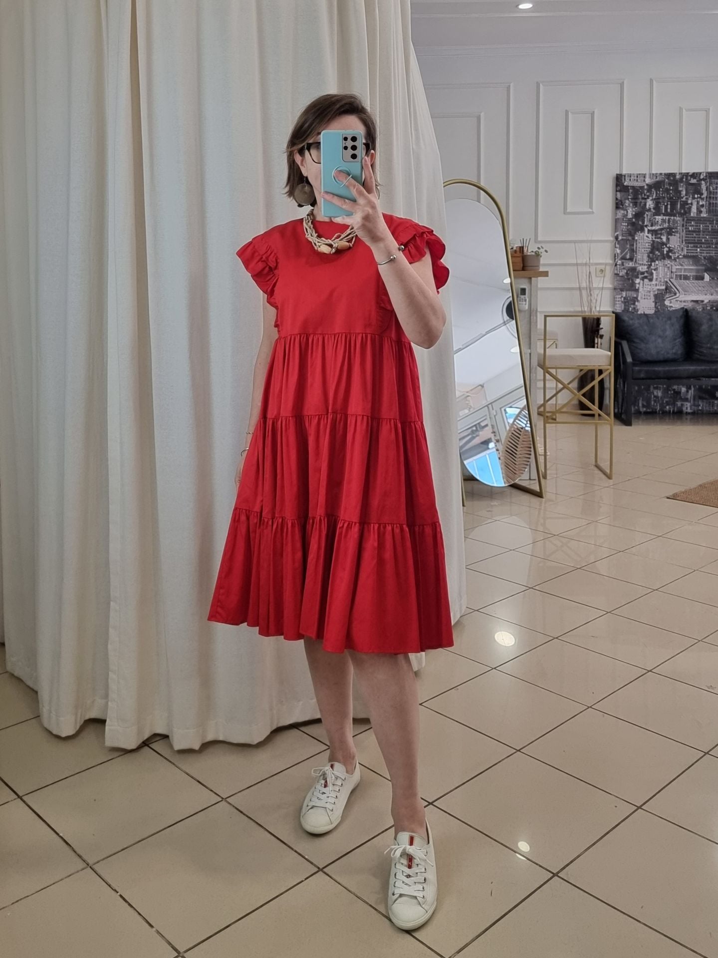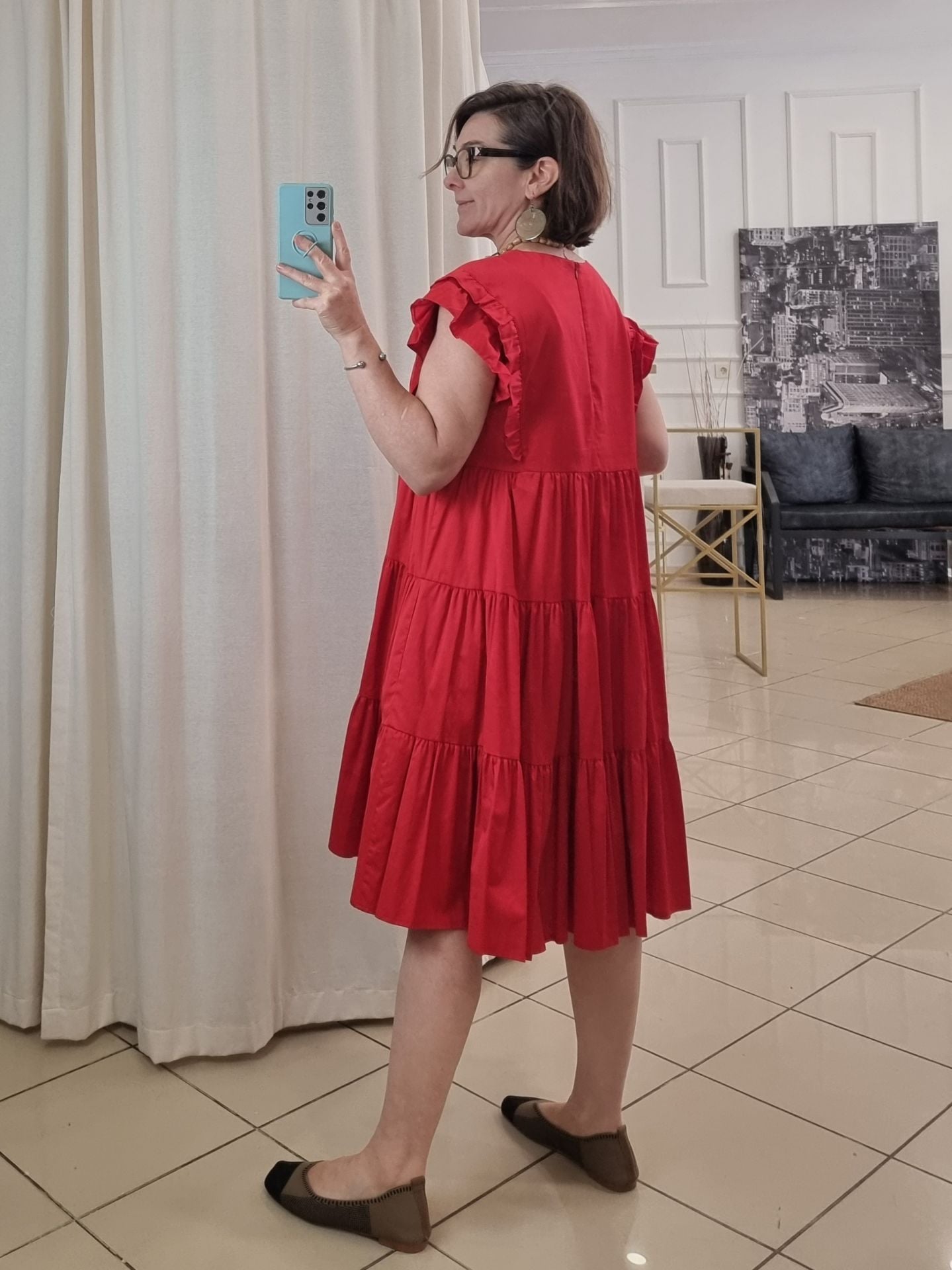 Bu saten poplin kırmızı elbise, canlı rengiyle enerjik bir duruş sunarken, kol ve etek uçlarındaki volan detaylarıyla feminen bir hava yaratır. %100 pamuk kumaşı sayesinde yazın ferah tutar, etek ucuna doğru bollaşan kesimiyle de vücuda nefes aldırır. Sırttan gizli fermuarı sayesinde rahatlıkla giyilip çıkarılabilir. Günlük şıklık arayan kadınlar için hem konforlu hem de göz alıcı bir alternatif. Bu kırmızı elbise ile yaz kombinlerine romantik bir dokunuş katmak mümkün.