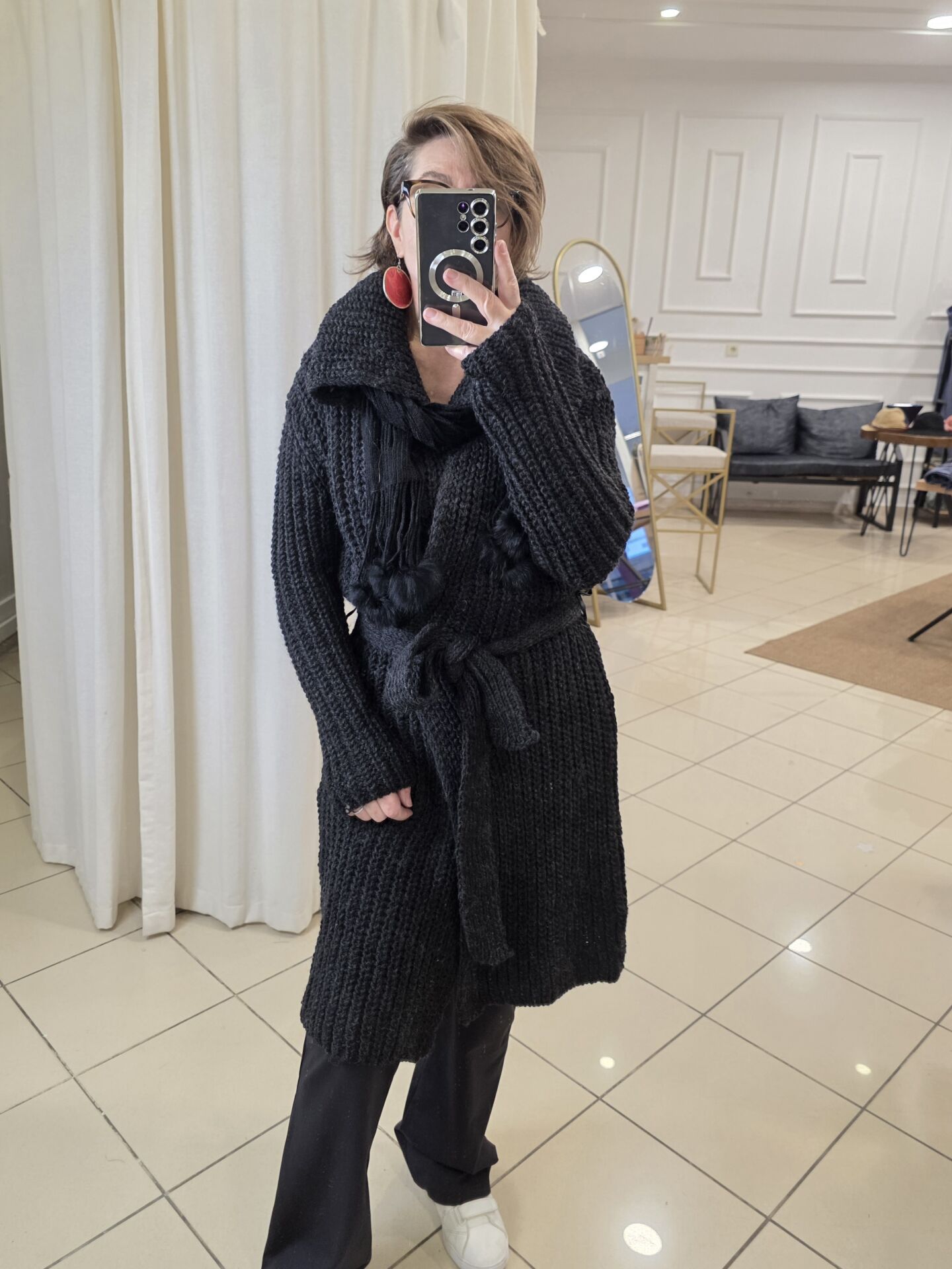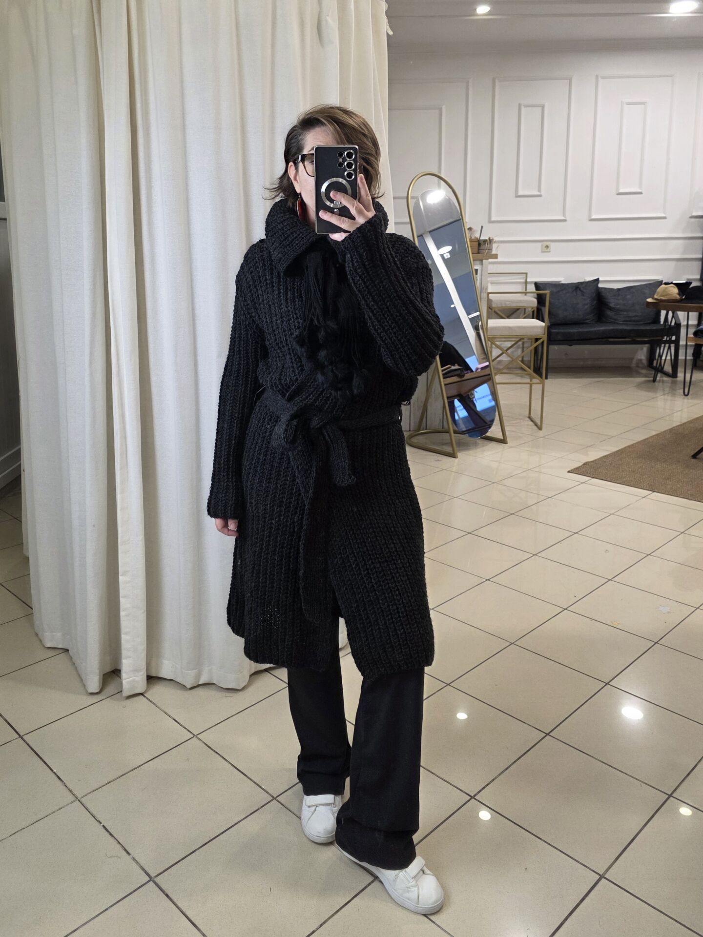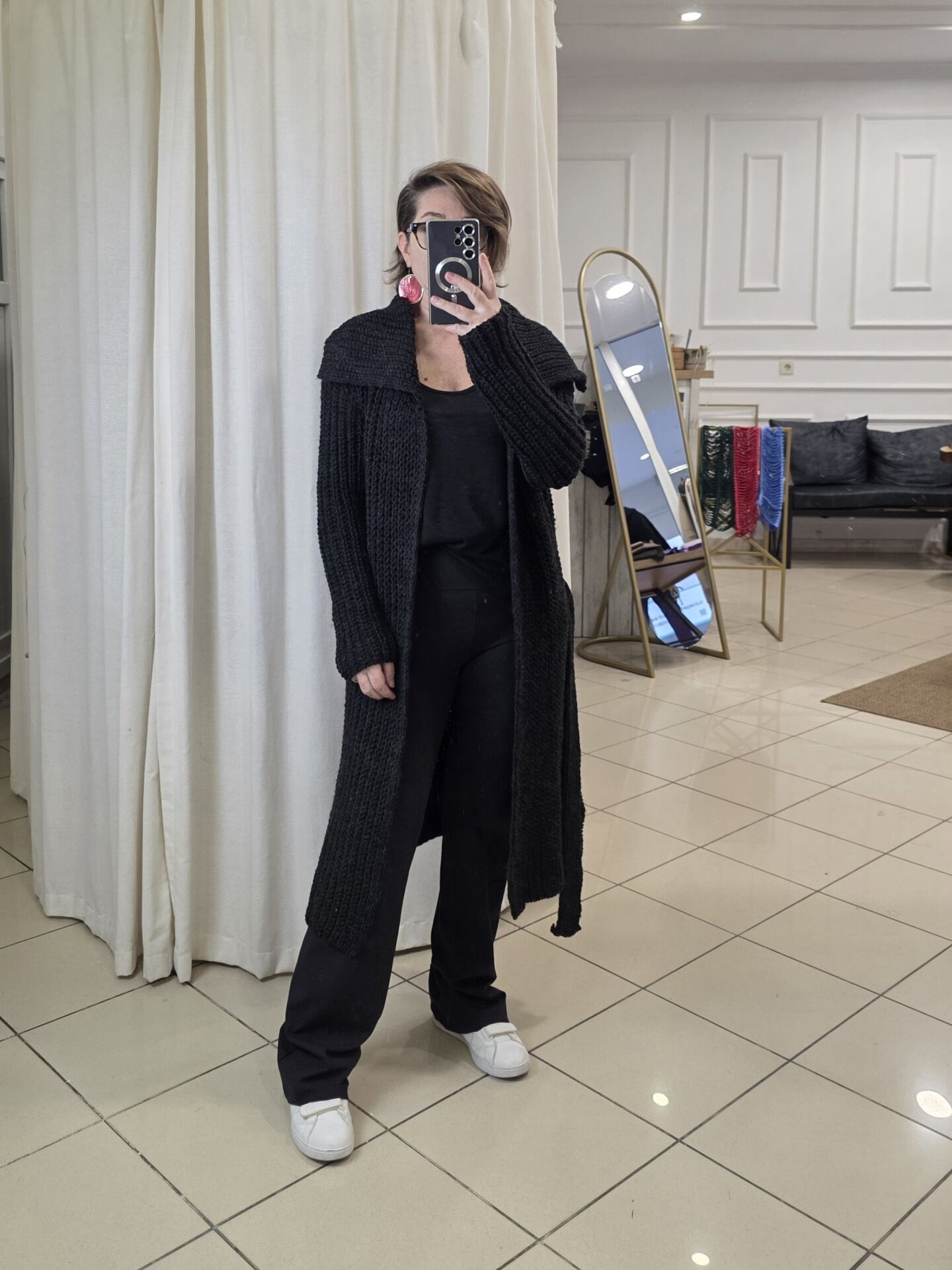 Kadınlar için tasarlanan Selanik örme salaş uzun hırka siyah, modern ve rahat bir şıklık sunuyor. Kemerli tasarımı sayesinde tarzınızı vurgularken, oversize kesimiyle konfor sağlar. Yumuşak Selanik örgüsü ve %10 yün içeriği, soğuk günlerde sıcaklık ve stil bir arada sunar. Standart beden olarak tasarlanan bu hırka, 48/50 bedene kadar uyum sağlar. Günlük kombinlerinizi tamamlarken, siyahın zarafetini de taşıyan bu uzun hırka kadınların gardıroplarında vazgeçilmez bir yer edinecek.