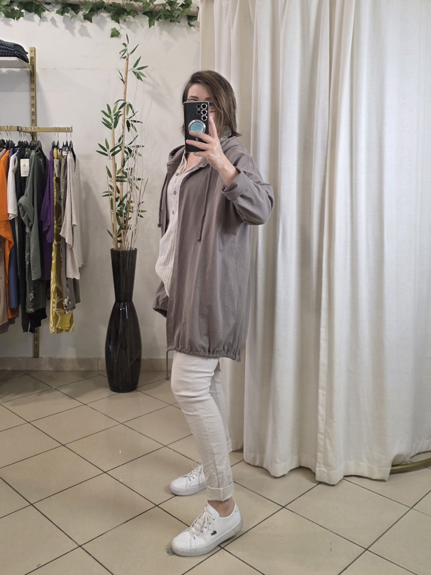 Oversize kapüşonlu sweat ceket geniş kesimiyle katmanlı kombinlerde kolaylık sağlar.