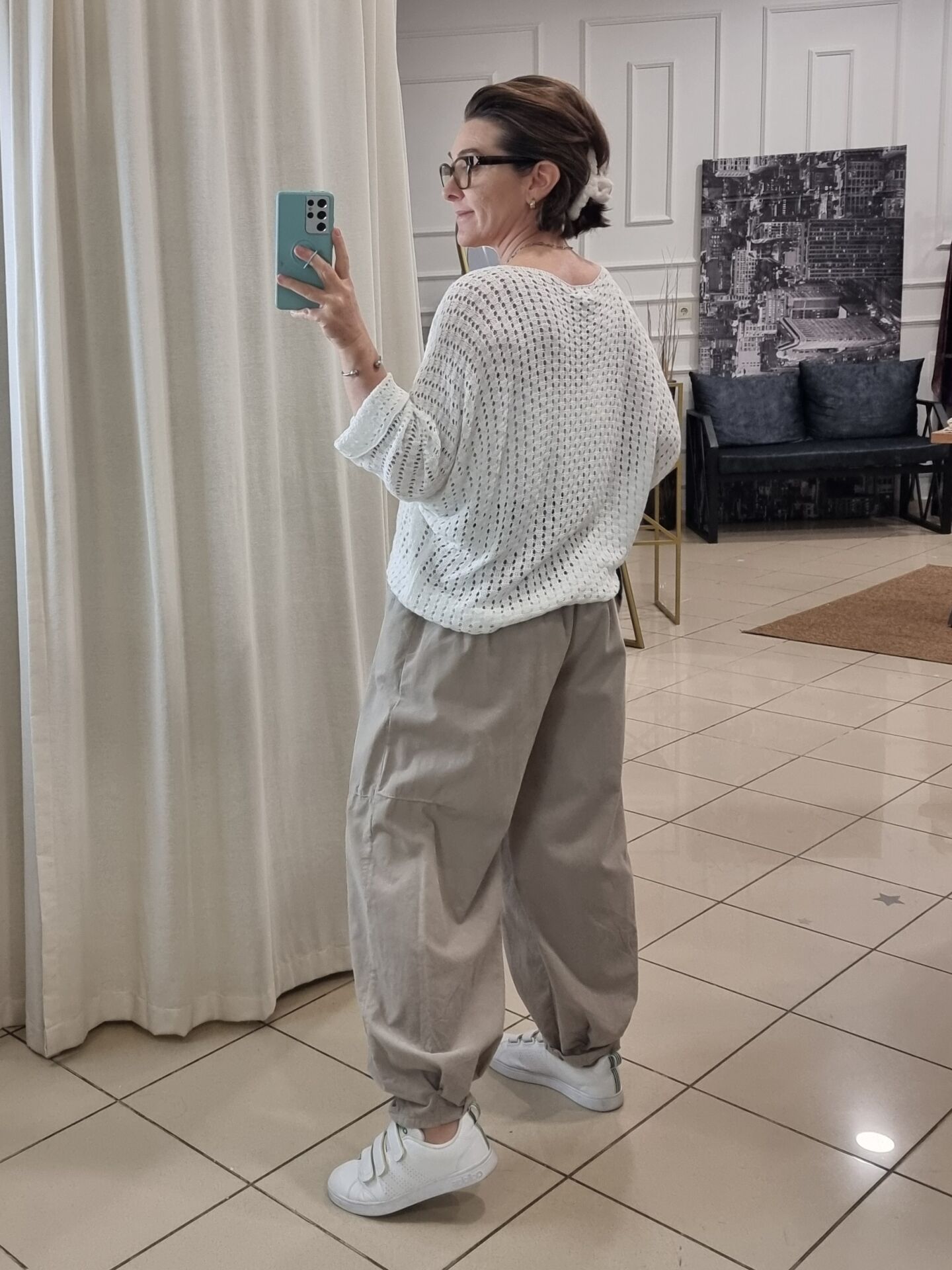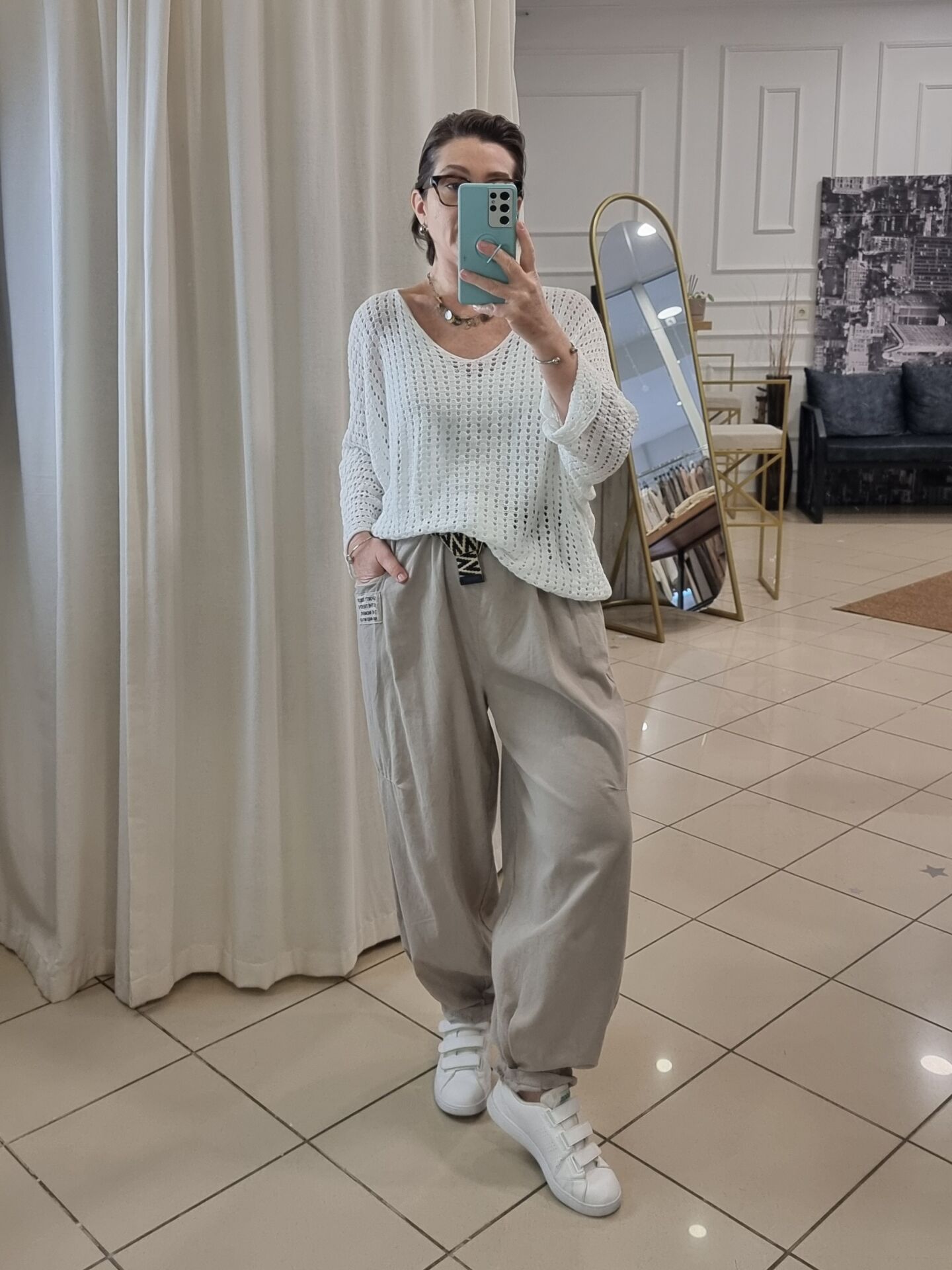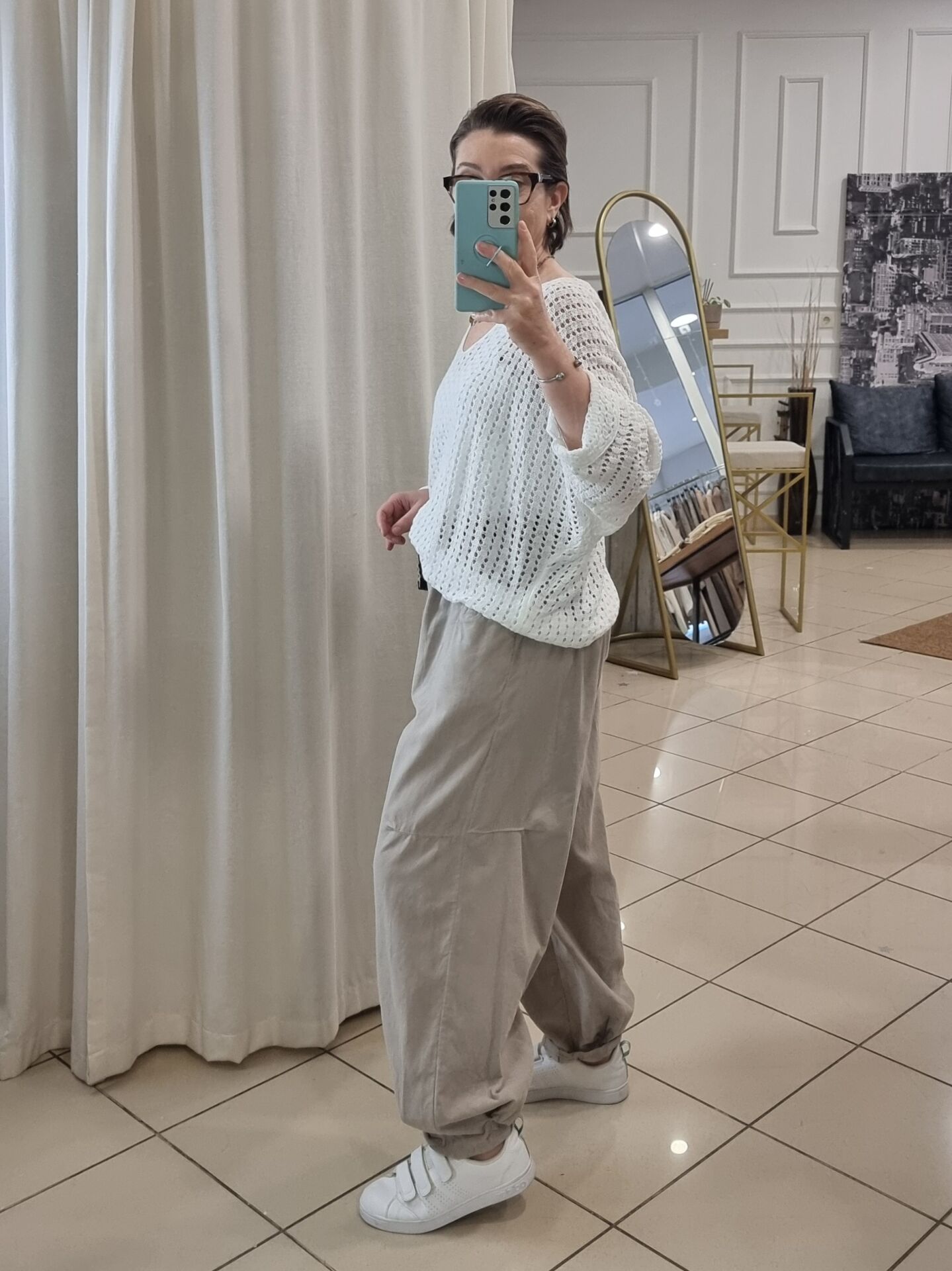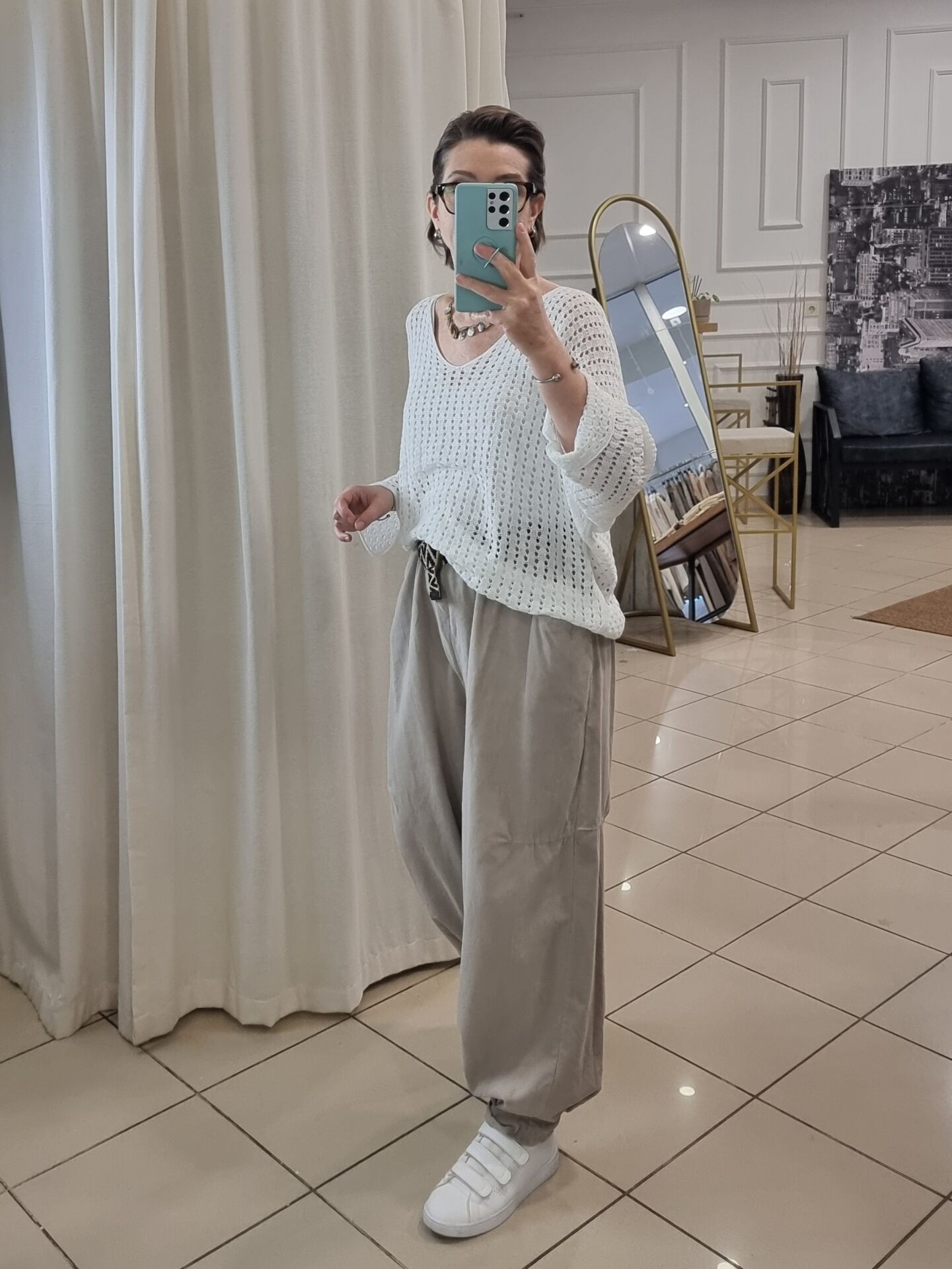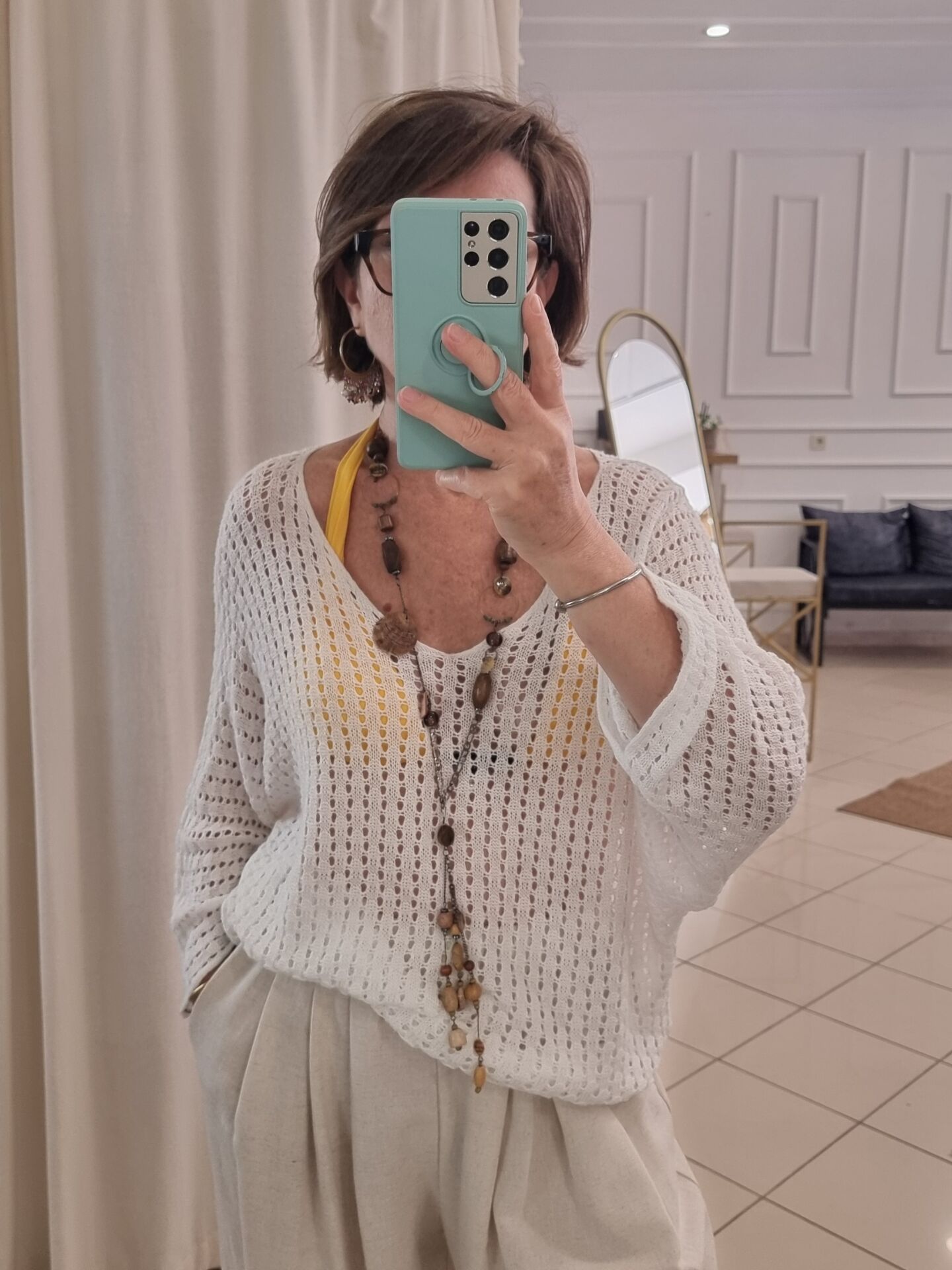 Kadınlar için tasarlanan V yaka ajurlu İtalyan modal triko beyaz, zarif ajurlu dokusu ve salaş kesimiyle dikkat çeker. Geniş V yakası ve yarasa kol detayları ile şık ve rahat bir stil sunar. Esnek yapısı 46/48 bedene kadar uyum sağlar. %55 modal ve %45 viskon kumaşıyla doğal bir dokunuş sunar, ılık suda elde yıkanabilir.