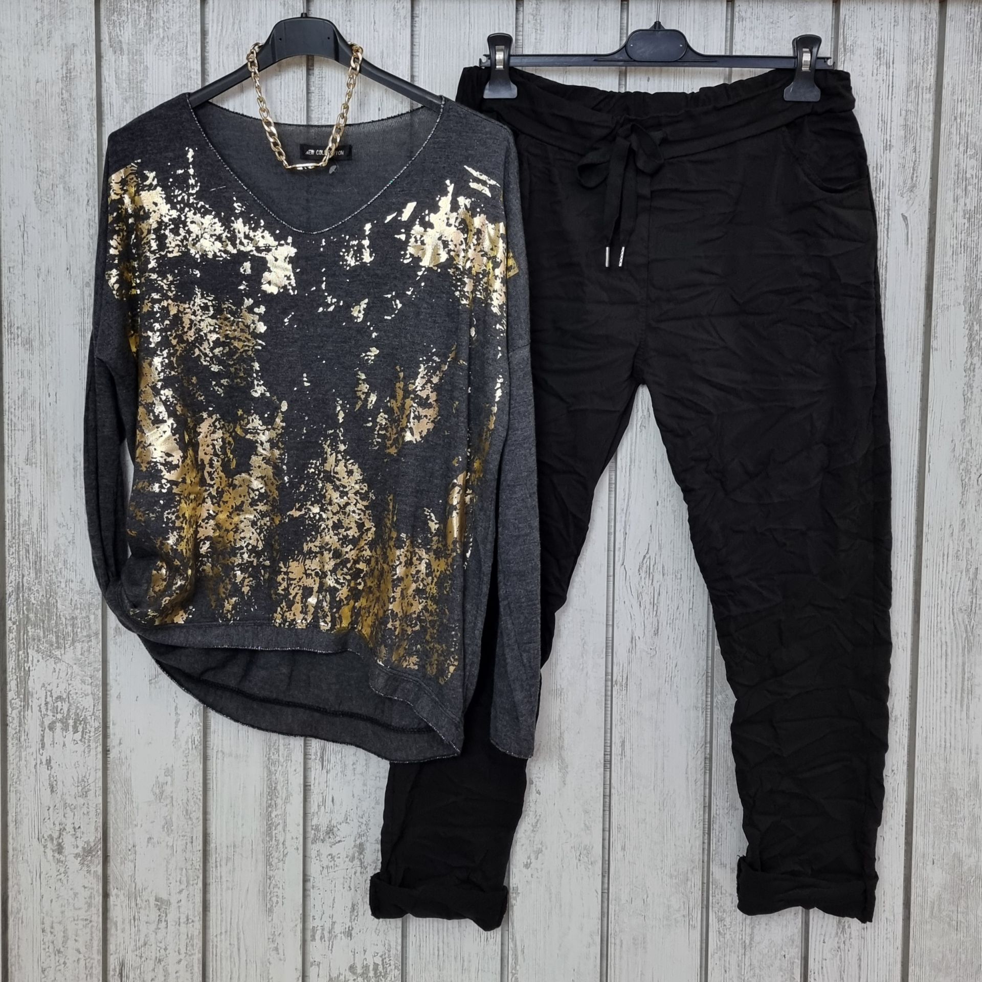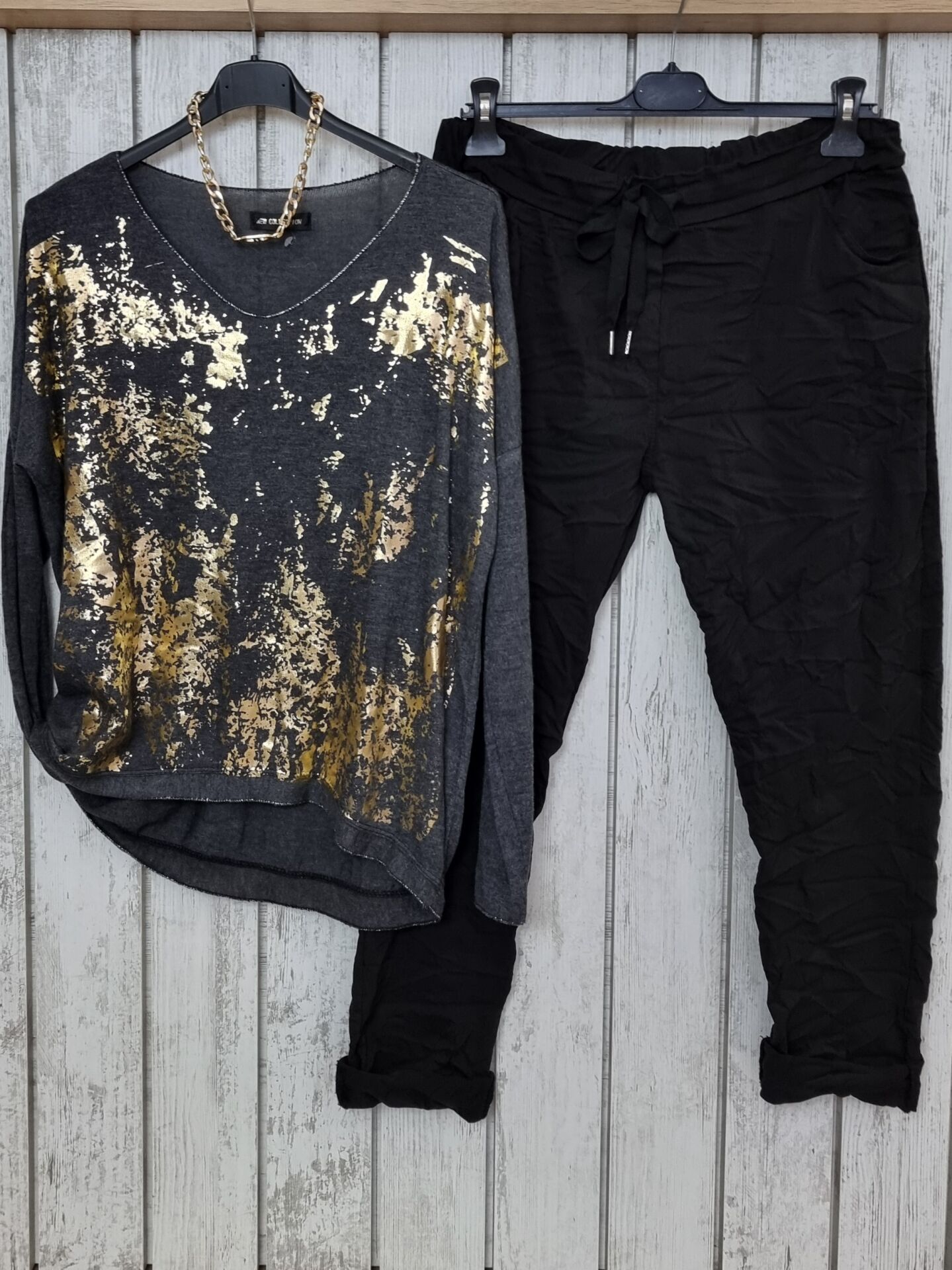 Altın varak baskılı ince triko bluz.