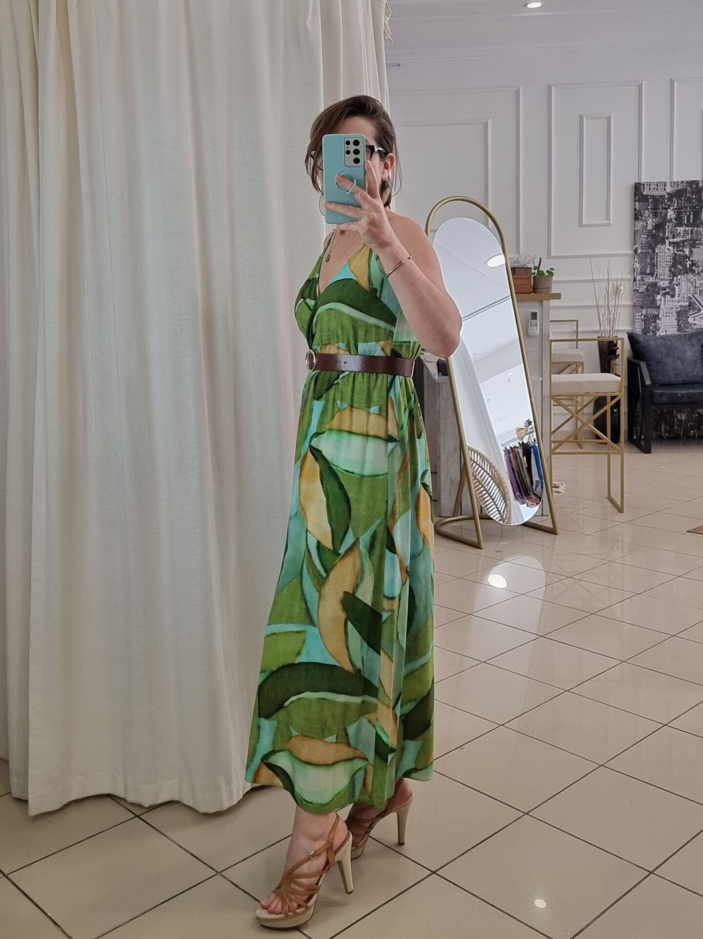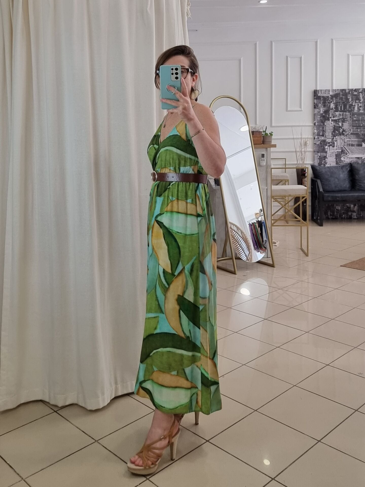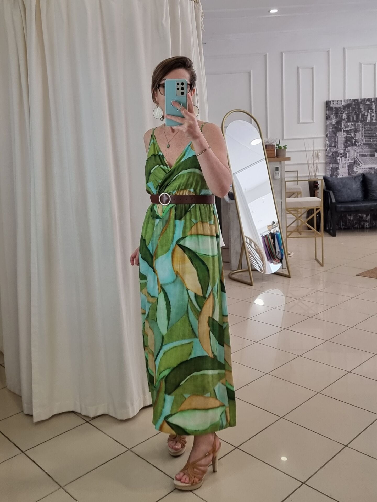 %100 Viskon Yeşil Desenli Uzun Elbise